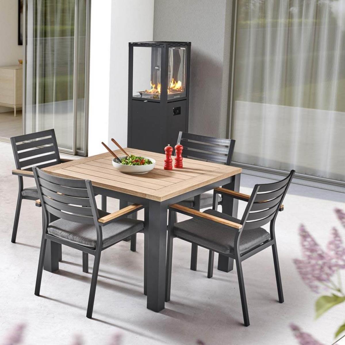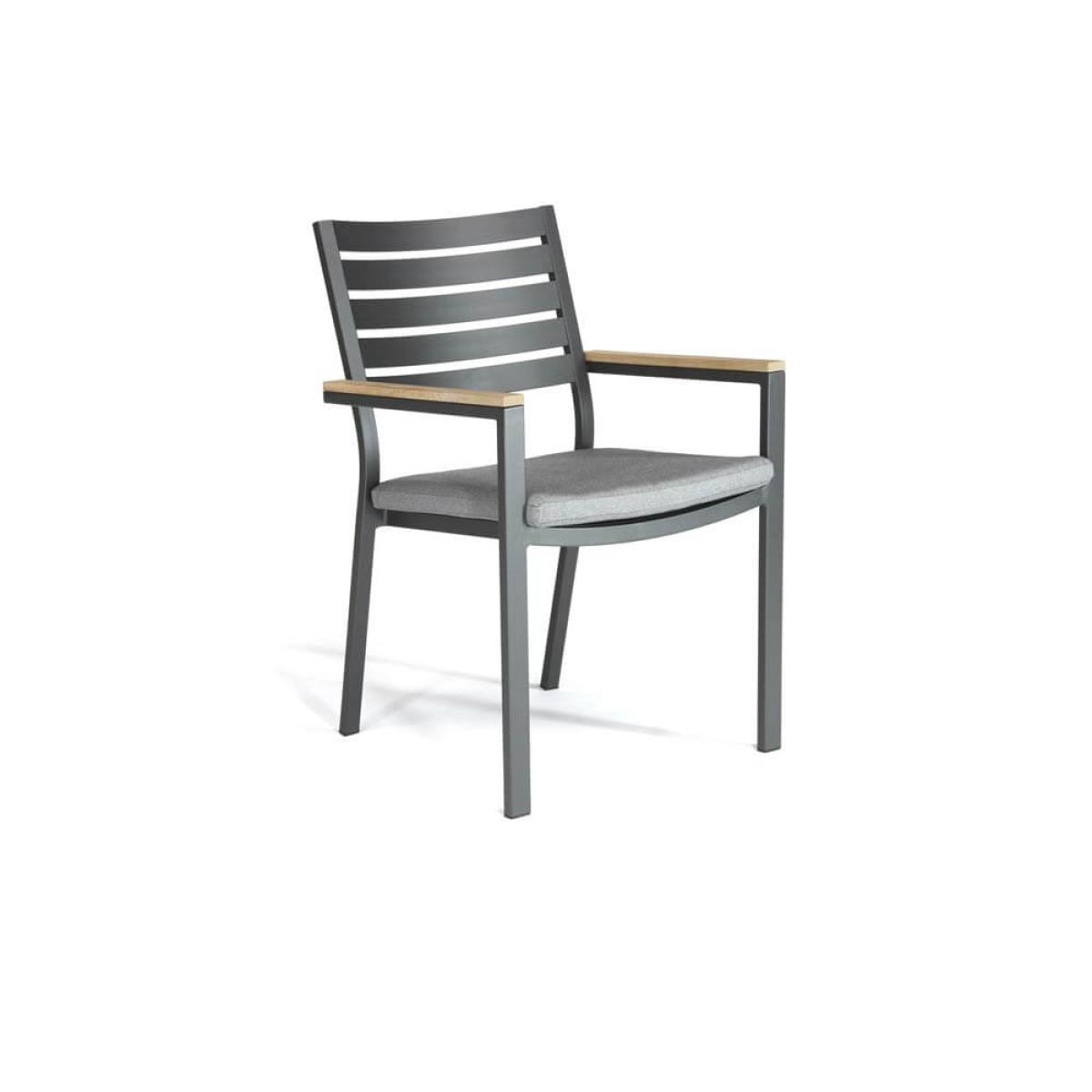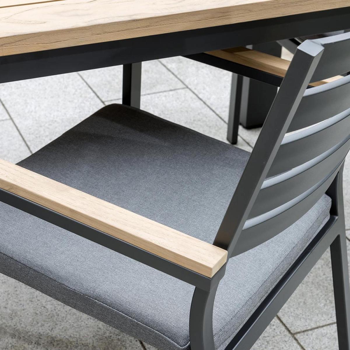 Set consists of:. 1 x Kettler Elba Square 100cm x 100cm Garden Table With Teak Top – Pewter Grey. 4 x Kettler Elba Dining Chair with Teak Arm Rests – Pewter Grey. 4 x Kettler Elba Dining Chair Cushions. About:. The Kettler Elba Square 4 Seat Dining Set is a compact aluminium patio furniture dining set that’s as attractive as it is durable. As part of the new Elba dining range this furniture crams in all of the details we love about this collection. This contemporary aluminium garden furniture offers clean lines, appealing chunky form, metallic touches and natural world elements. We think this set will suit stylish gardens, decking and lawns equally. Find a teak hardwood topped surface that is durable and smooth, a little maintenance is required to upkeep this natural surface, as such Kettler offer. Hardwood products. For best care. This is set upon a strong aluminium frame that’s been powder coated in a pewter grey finish, offsetting the wood of the table nicely with a on-trend muted metallic. This frame, being aluminium, means it won’t ever succumb to rust. Please note protective covers are not recommended with Acacia wood products – covering can prevent the wood from breathing & lead to mould. Seat 4 around this square table with the 4 cast aluminium Elba Dining Chairs provided. These attractive matching chairs come in the same grey pewter powder coating, also made from aluminium with all the integral benefits of non rust and strength the material provides. Find lovely teak wood detailing on the armrests and thickly filled cushions. This supremely good looking modern metal garden furniture is sure to suit outdoor spaces for years to come. Key features:.