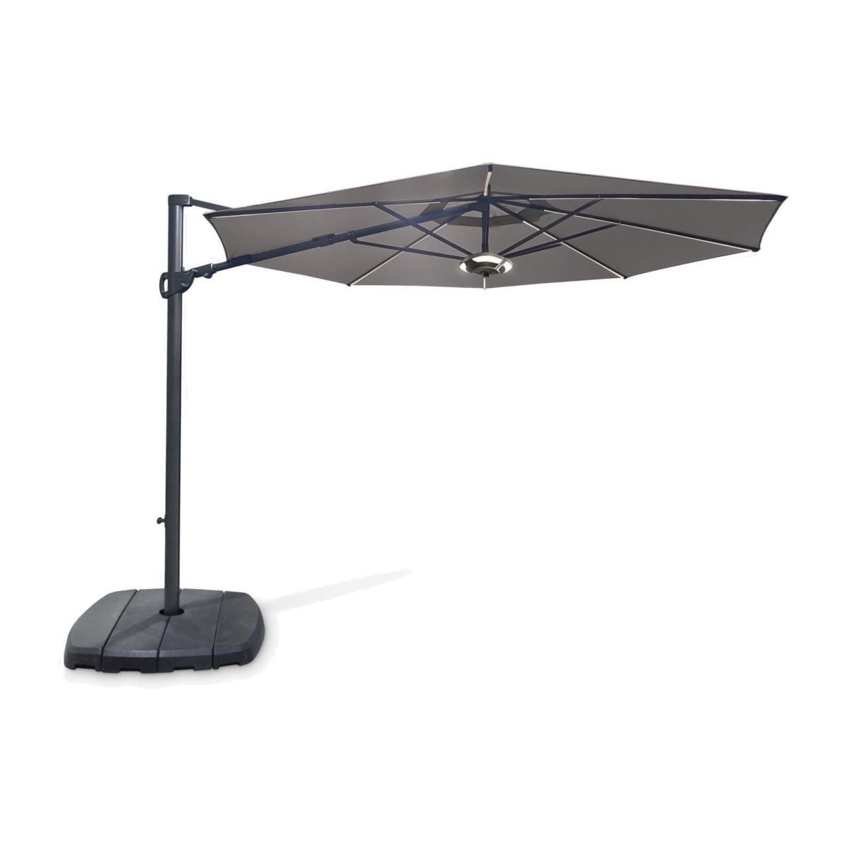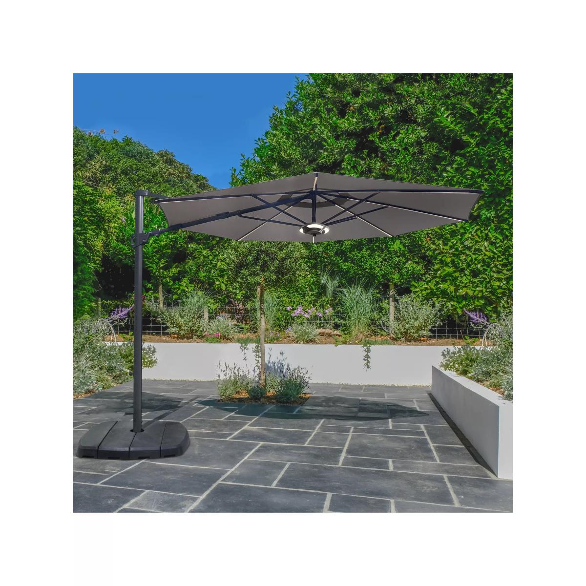 This 3.3m free-arm parasol from KETTLER features built-in LED lights for extending time outdoors, plus a wireless speaker for entertaining. The parasol has full movement with both horizontal and vertical tilt adjustment to control the shade. There is an easy wind-out mechanism and pull pin for rear tilt adjustment. Boasting a high-quality aluminium frame with UV50+ resistance canopy, the parasol includes a night cover to protect it from dirt and bird droppings when not in use. There is a vent in the canopy for air circulation and the glowing LED lights are powered by a battery pack. Good to know: Always use the parasol base weight. Fill the four-part resin base with sand and top up with water to weigh it down in the chosen location in your garden. Once the base is filled, it will be too heavy to move. When not in use or during windy weather, it is recommended to take the parasol down or store it away, depending on the conditions.