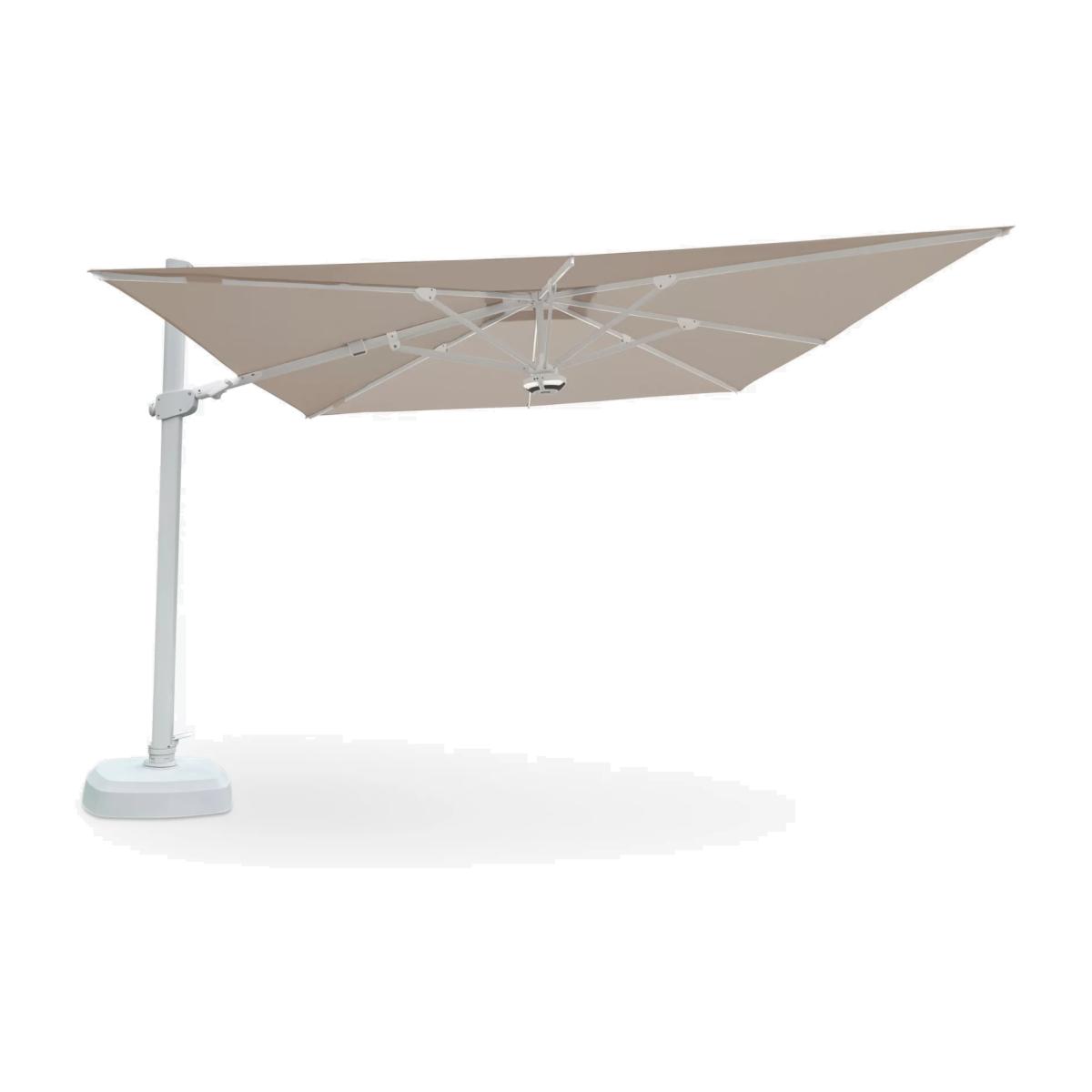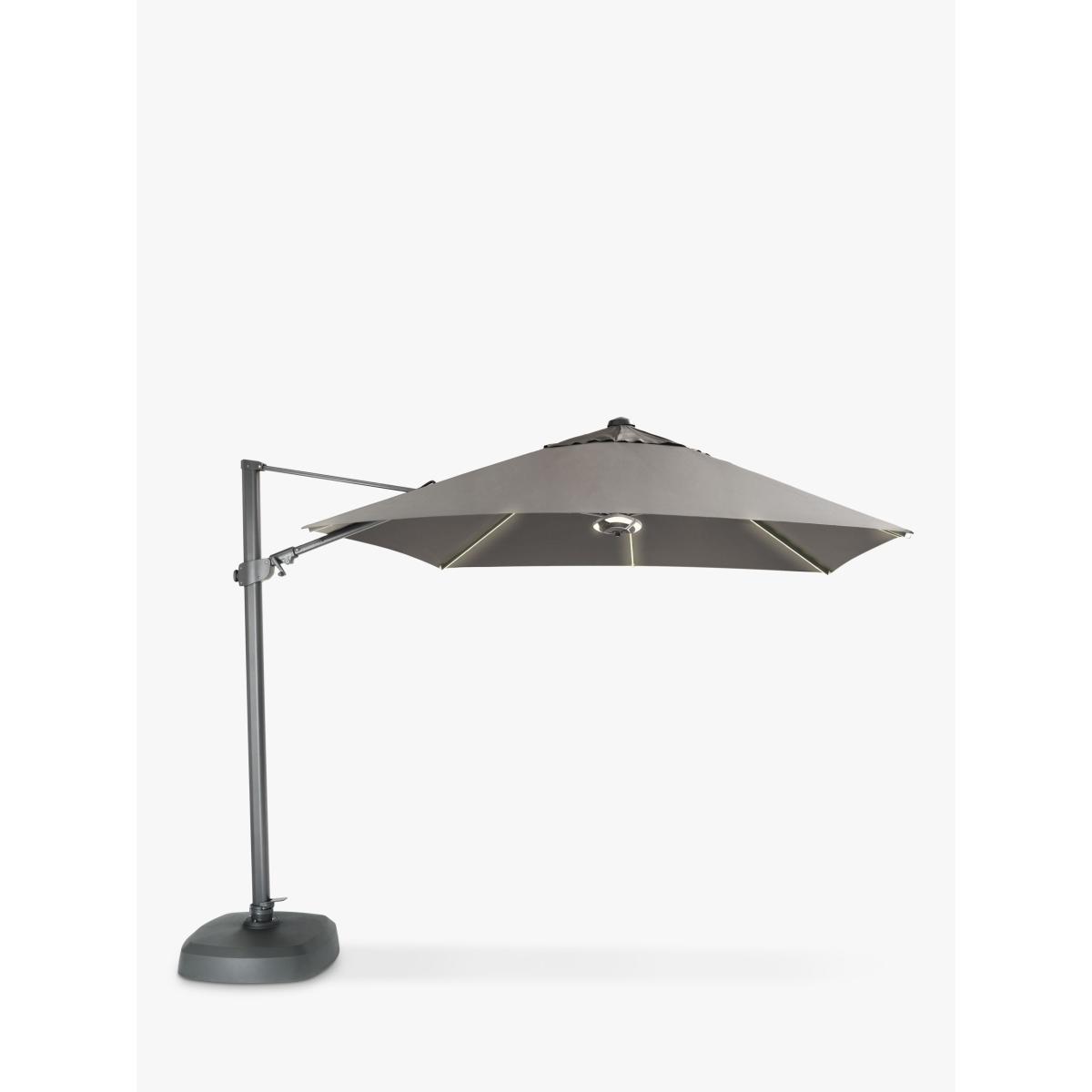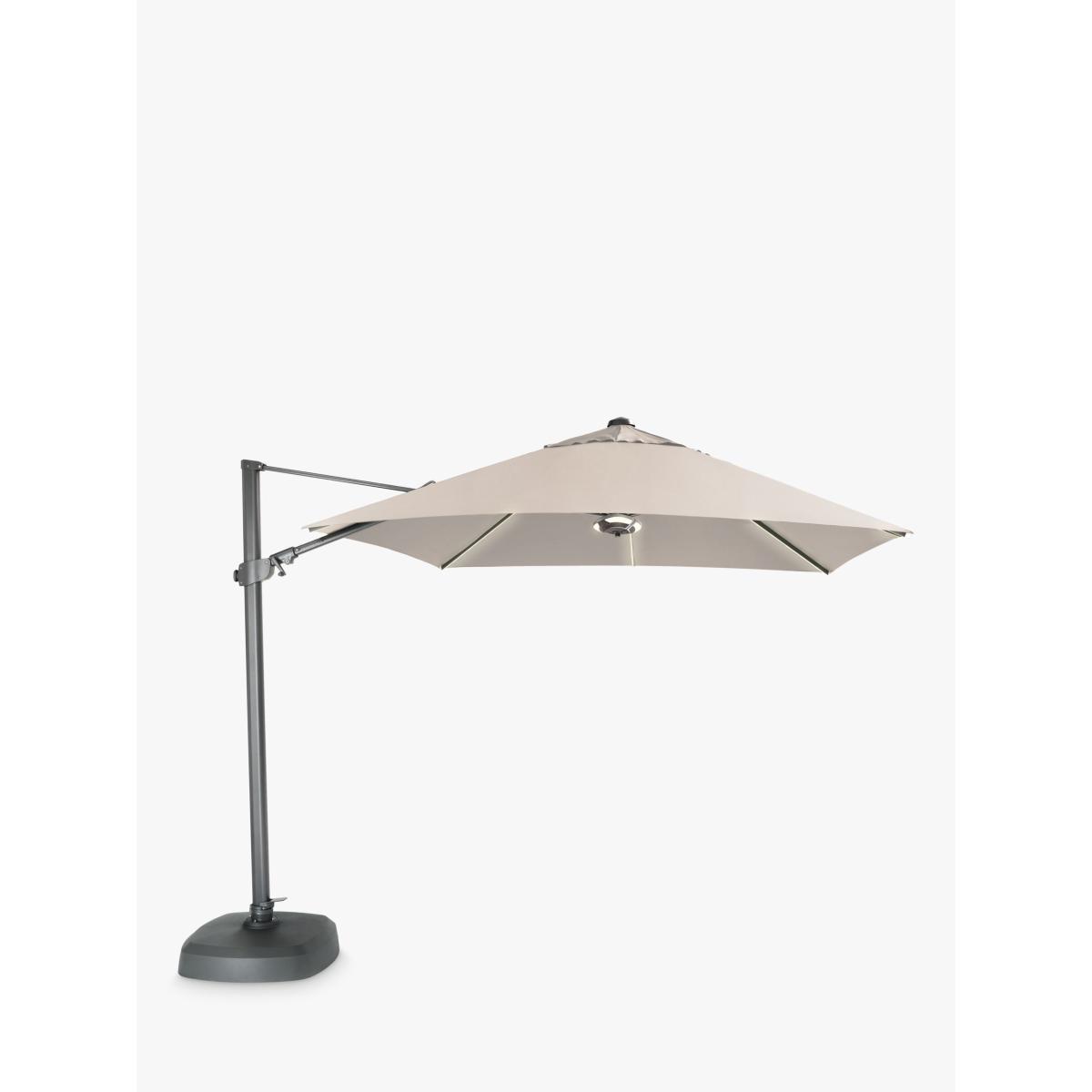 This 3-metre by 3-metre square free-arm parasol from KETTLER has wireless speakers and LED lights inside the canopy to keep the party going in the evening. It's operated by an easy wind-up mechanism and has a tilt adjustment for selecting the right angle of protection from the sun. It's made with a durable aluminium frame and a shower-resistant canopy offering UV50+ sun protection. With free-arm rotation, the base doesn't need to be moved when raising and lowering the parasol. When not in use or in windy weather we recommend you close the parasol down. It comes with a weatherproof night cover. Fill the four-part base with sand and water to weigh it down in your chosen location in the garden. Make sure that you're happy with your parasol's location before filling the base. Key features: LED lights and wireless speakers Wind-up mechanism to open the canopy Tilt adjustment UV50+ sun protection and shower-resistant polyester canopy Aluminium pole Parasol base included Weatherproof night cover included Good to know: The parasol is designed for sun shade protection only. In windy weather, take down the parasol and store safely. Want to see it first? You may want to see and get a feel for the furniture in one of our shops before ordering. We'll be able to tell you where the range you'd like to view is on display.