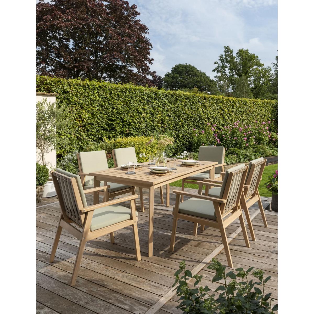 Enjoy al fresco meals with friends and family sitting around this dining set from the Royal Horticultural Society Hampton range. This summer-ready furniture is crafted from quality acacia wood for a smart finish. The stylish set includes six dining chairs with comfy cushions and a matching table.