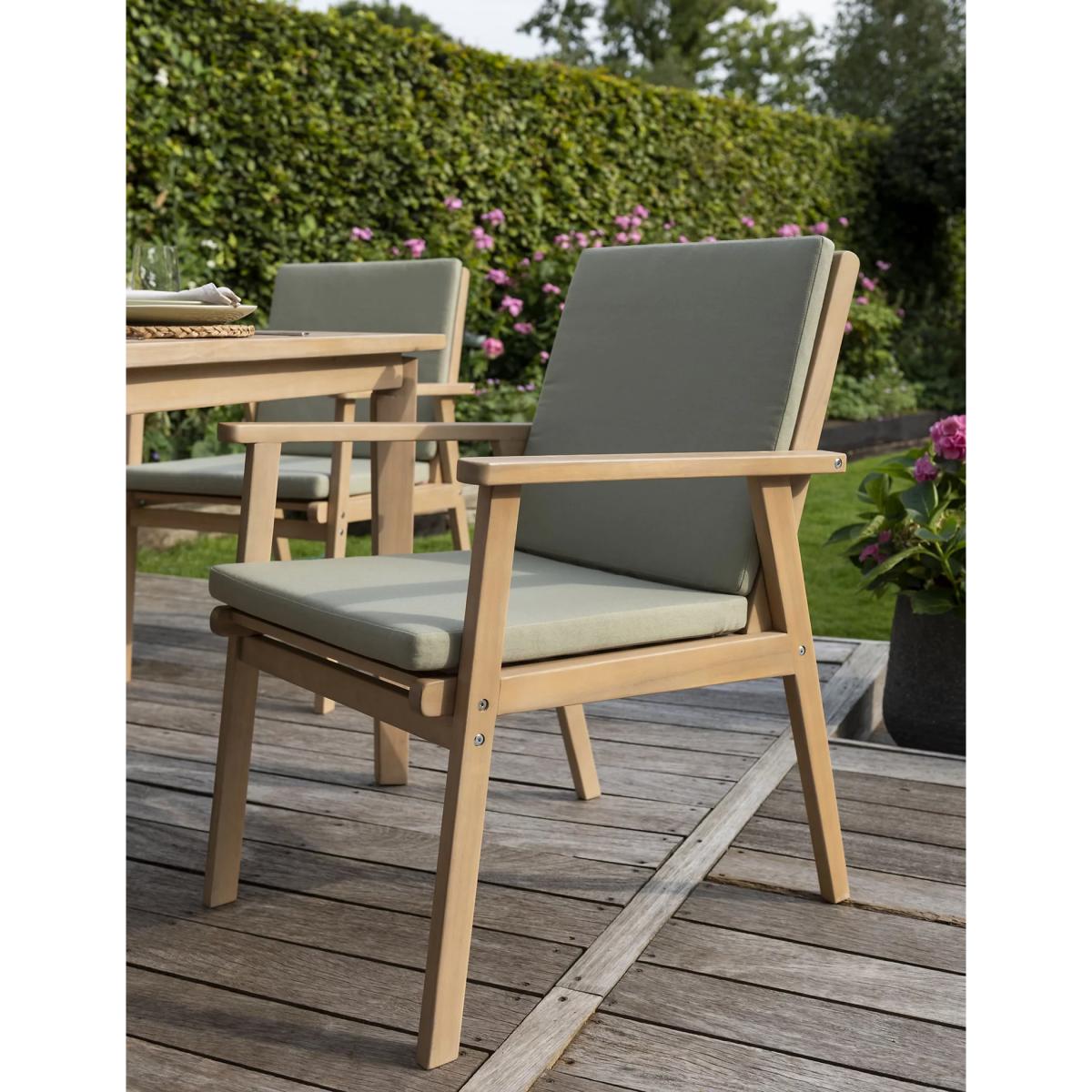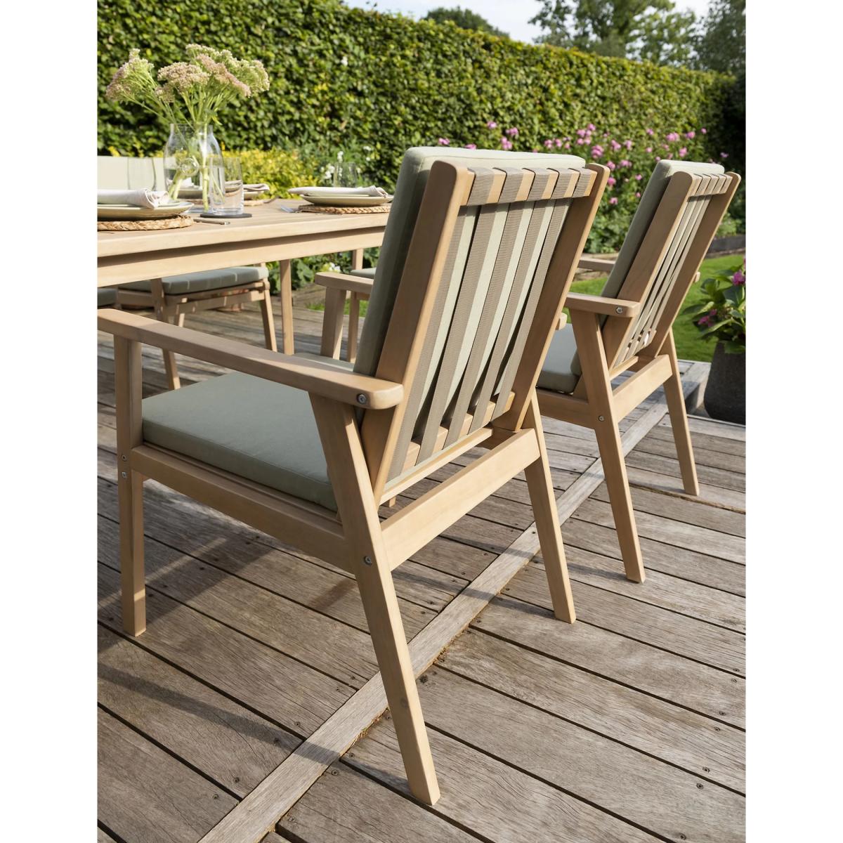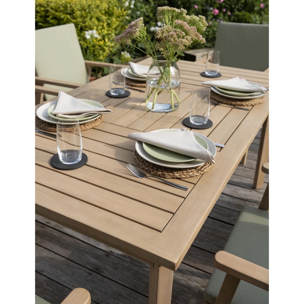 I love this set’s versatile style and muted sage colour, which makes it easy to pair with both modern and traditional garden decor. It works really well in relaxed, contemporary outdoor spaces, or even as an elegant extension of an indoor dining setup with a seamless transition outside. Practical styling tips include adding some oversized cushions for comfort and a few statement table centrepieces like potted herbs or lanterns to keep the look fresh and inviting. Because of its natural wood tone and sleek design, it’s also adaptable enough to pair with colourful or neutral accessories, making it a great long-term investment for a stylish, functional garden area.