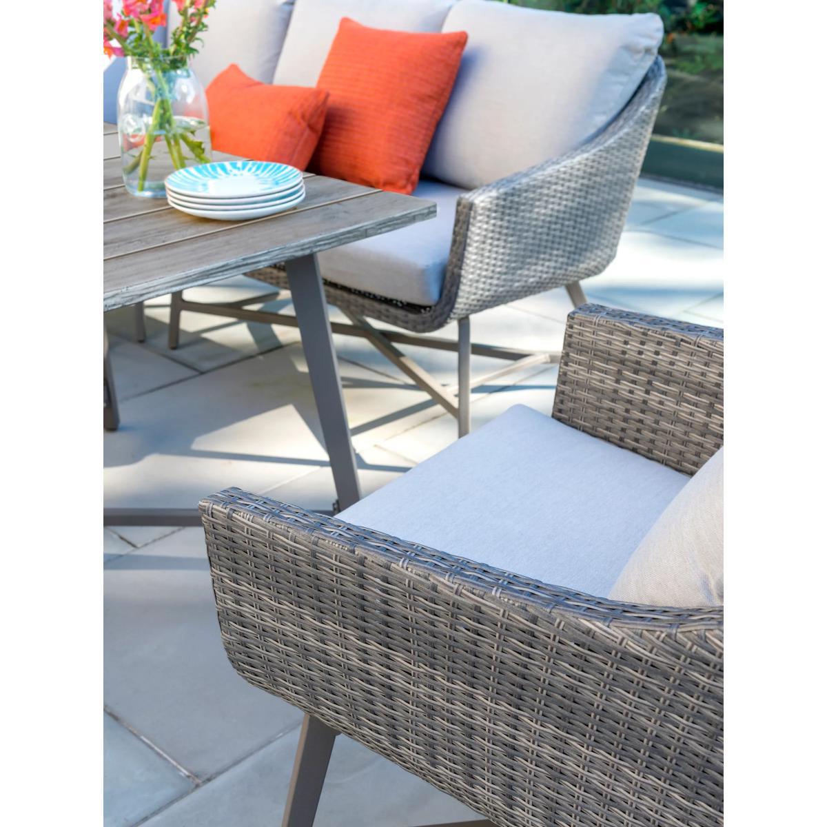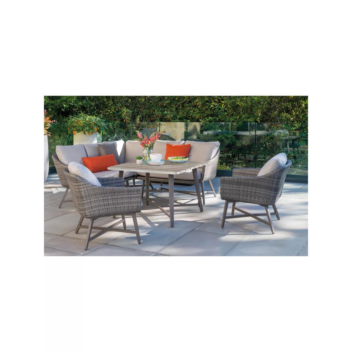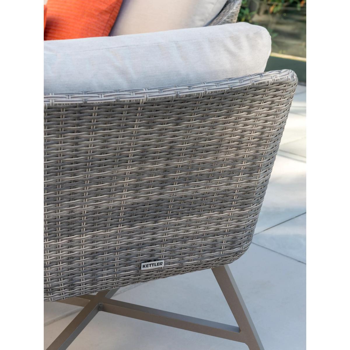 With its distinctive retro style and wicker finish, this seven-seater La Mode garden lounging table and chairs set from KETTLER provides a stylish way to relax outside or in the conservatory. The set includes a corner sofa unit and two armchairs plus a dining table. Hand woven from 6mm flat wicker that's both UV-resistant and waterproof, you can leave the set outdoors during the summer months without having to worry about any potential damage caused by the elements. Aluminium frames provide both durability and strong support, while foam-filled, stain and shower-resistant cushions ensure added comfort. The square table has a wood effect top to give a beautiful finish. Key features: La Mode garden dining table and chairs seat up to seven Aluminium frames UV-resistant and waterproof 6mm flat weave Bucket chairs with protective footcaps and seat and back cushions Matches furniture in the La Mode range by KETTLER Want to see it first? You may want to see and get a feel for the product in one of our shops before ordering. We'll be able to tell you where the range you'd like to view is on display. Choose the perfect outdoor furniture We have a vast selection of furniture for you to choose from which will suit the home or garden. The majority of our furniture ranges have been hand woven using a synthetic wicker. The thinner the weave, the longer it takes for the skilled workers to complete. All weave types are durable so they’ll last throughout the seasons All woven outdoor furniture is UV protected so it will not fade in direct sunlight All woven outdoor furniture is easy to maintain, simply wipe clean using warm water Flat A weave of various widths which offers incredible value for money Half round More detailed with a 3D effect, the half round is a round weave in half which displays a wicker appearance on the top and hollowed underside Double half round A double strand of half round, this is a wider width of weave which achieves an expensive appearance Round weave A very tight weave which is available in various widths, from 2mm to 5mm Rope A selection of our ranges have been made using rope. The yarn is made up of 10,000 (approx) woven strands with a double core for extreme strength, does not attract mould even if wet for a long time and is UV resistant.