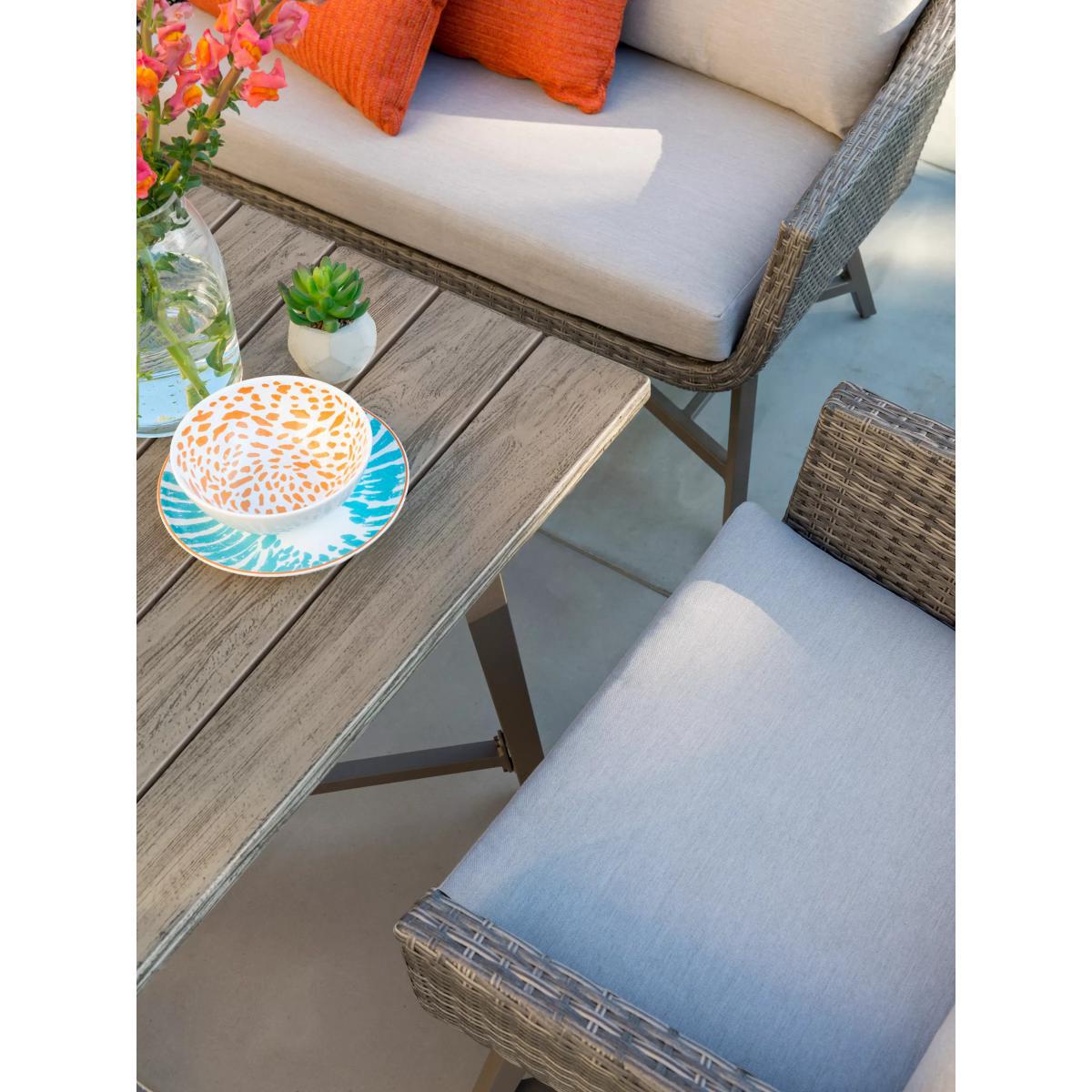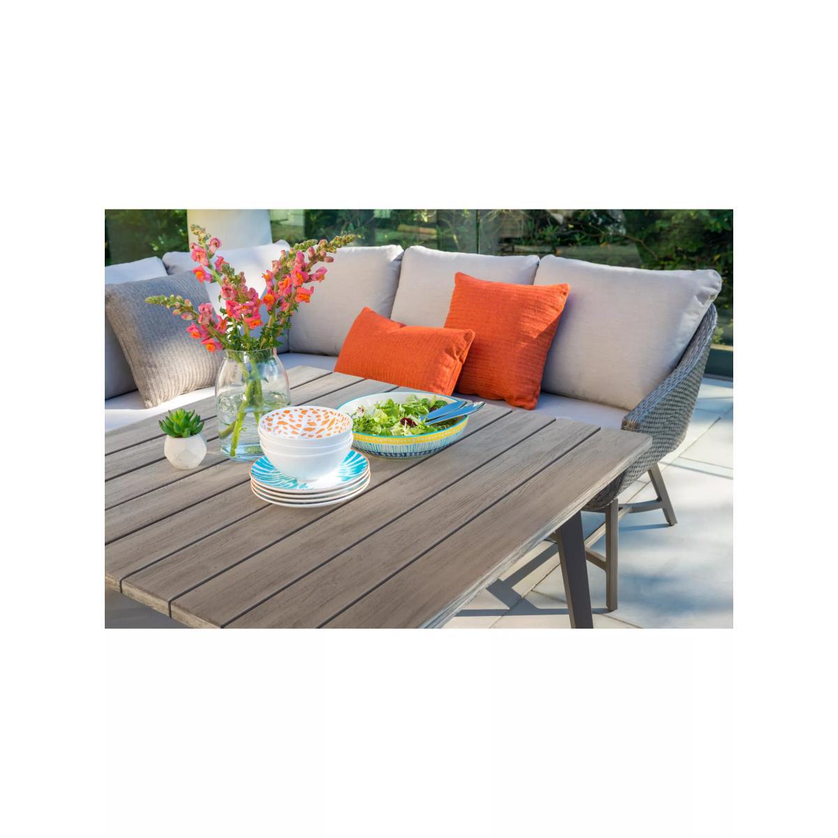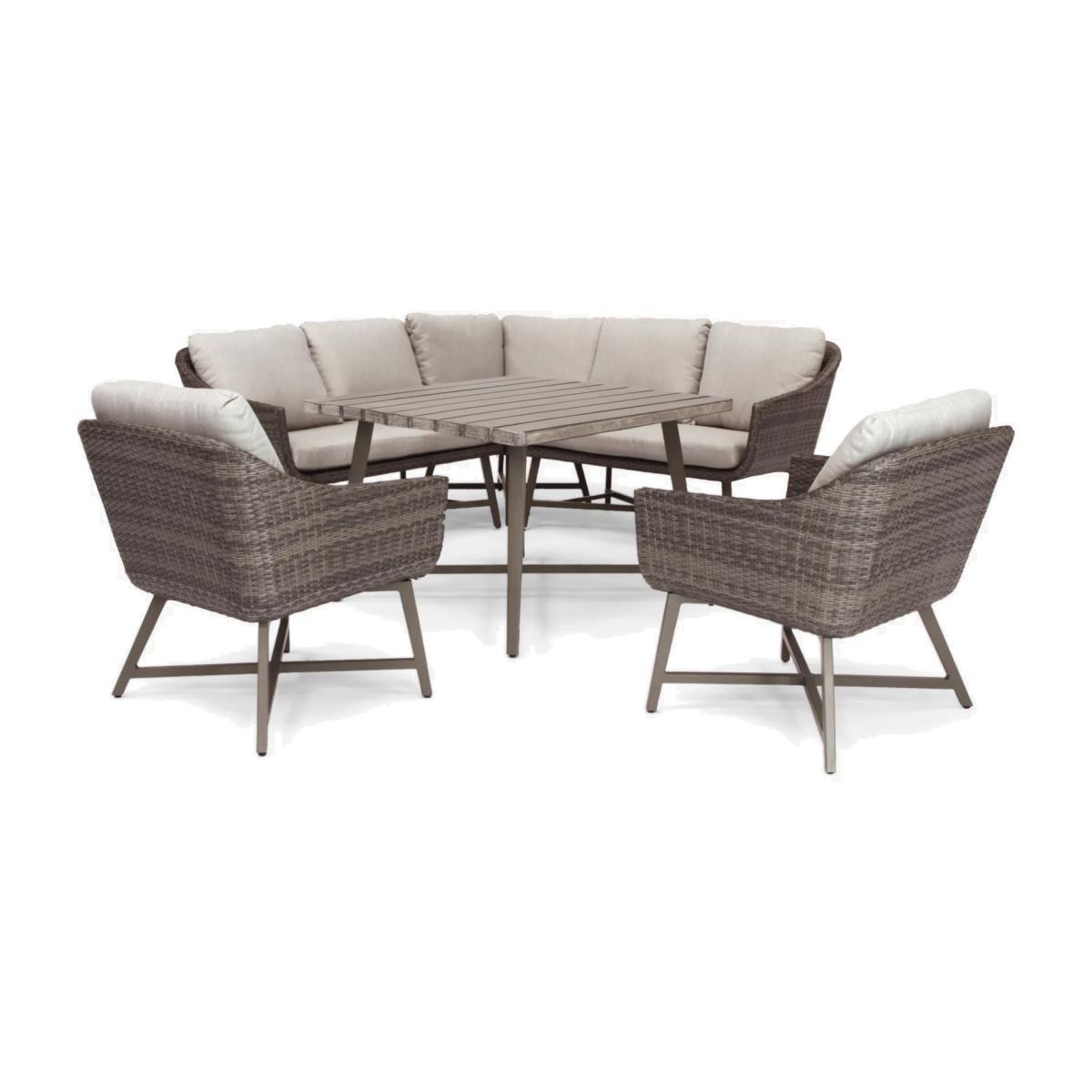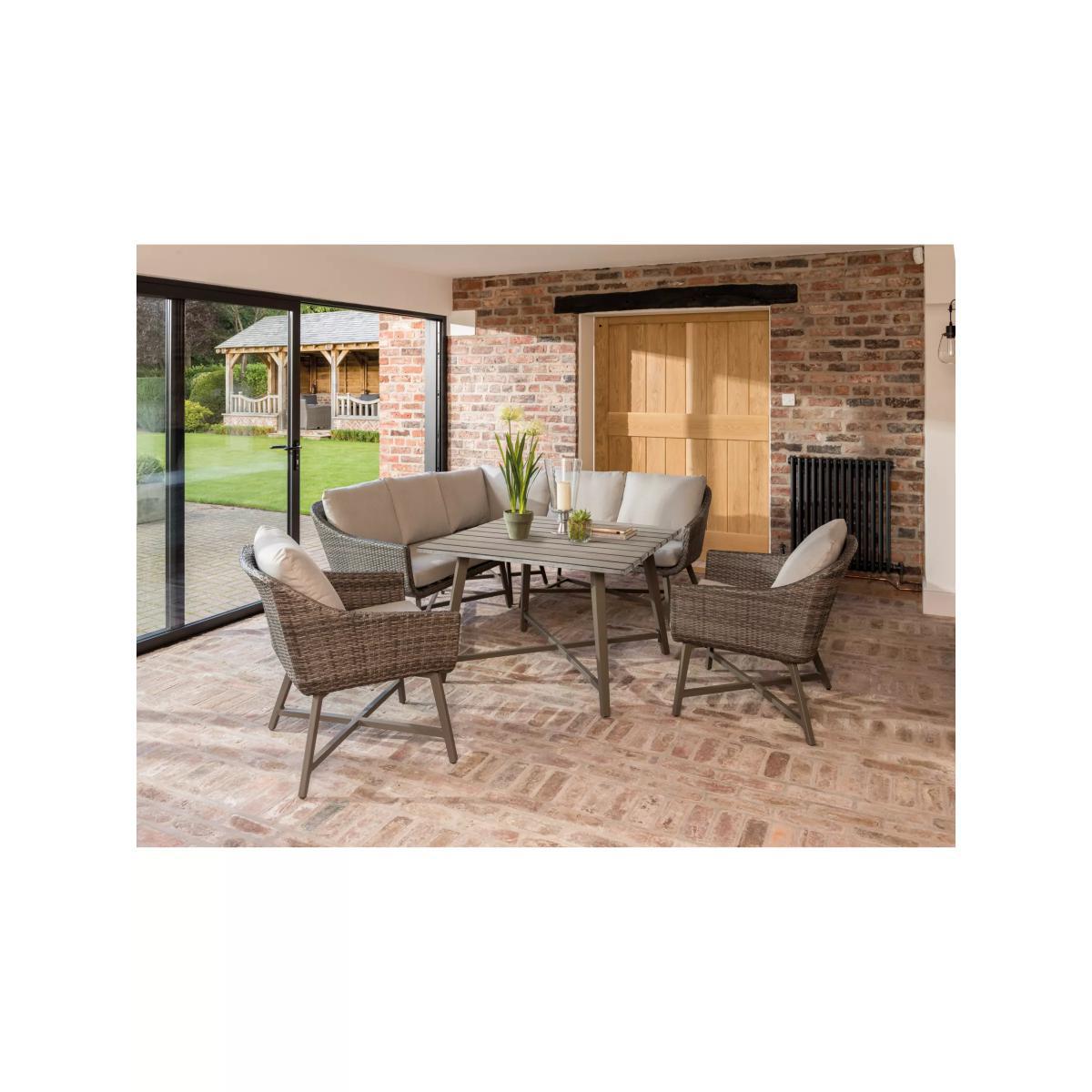 With its distinctive retro style and wicker finish, this seven-seater La Mode garden lounging table and chairs set from KETTLER provides a stylish way to relax outside or in the conservatory. The set includes a corner sofa unit and two armchairs plus a dining table. Hand woven from 6mm flat wicker that's both UV-resistant and waterproof, you can leave the set outdoors during the summer months without having to worry about any potential damage caused by the elements. Aluminium frames provide both durability and strong support, while foam-filled, stain and shower-resistant cushions ensure added comfort. The square table has a wood effect top to give a beautiful finish. Key features: La Mode garden dining table and chairs seat up to seven Aluminium frames UV-resistant and waterproof 6mm flat weave Bucket chairs with protective footcaps and seat and back cushions Matches furniture in the La Mode range by KETTLER Want to see it first? You may want to see and get a feel for the product in one of our shops before ordering. We'll be able to tell you where the range you'd like to view is on display. Choose the perfect outdoor furniture We have a vast selection of furniture for you to choose from which will suit the home or garden. The majority of our furniture ranges have been hand woven using a synthetic wicker. The thinner the weave, the longer it takes for the skilled workers to complete. All weave types are durable so they’ll last throughout the seasons All woven outdoor furniture is UV protected so it will not fade in direct sunlight All woven outdoor furniture is easy to maintain, simply wipe clean using warm water Flat A weave of various widths which offers incredible value for money Half round More detailed with a 3D effect, the half round is a round weave in half which displays a wicker appearance on the top and hollowed underside Double half round A double strand of half round, this is a wider width of weave which achieves an expensive appearance Round weave A very tight weave which is available in various widths, from 2mm to 5mm Rope A selection of our ranges have been made using rope. The yarn is made up of 10,000 (approx) woven strands with a double core for extreme strength, does not attract mould even if wet for a long time and is UV resistant.