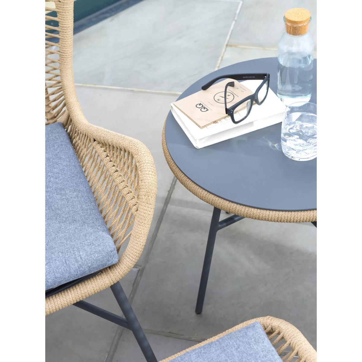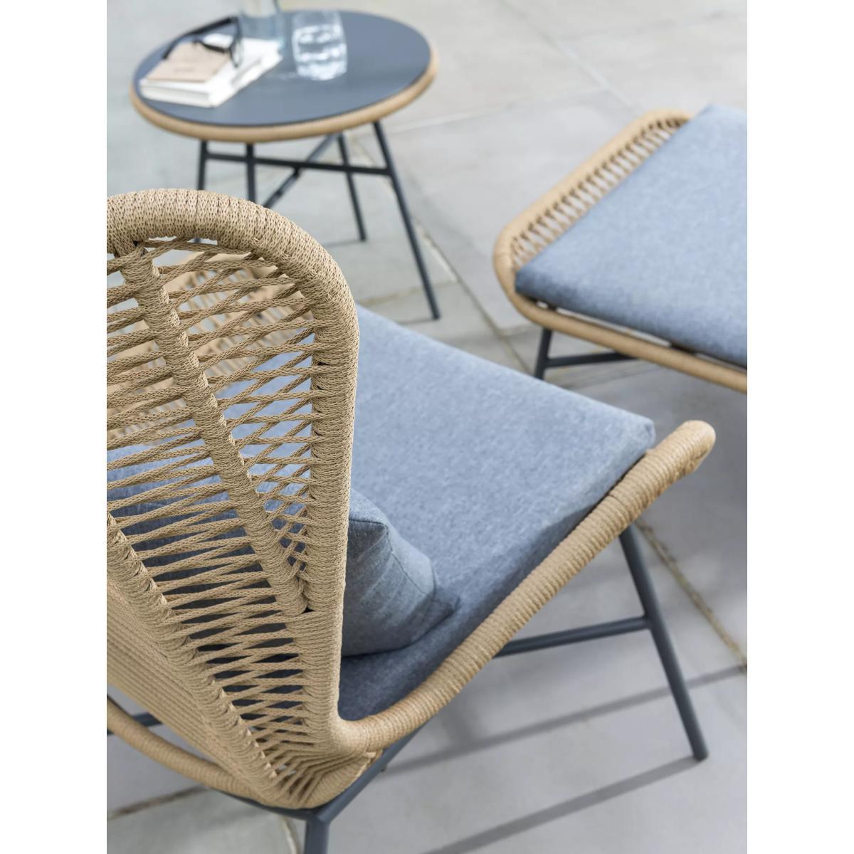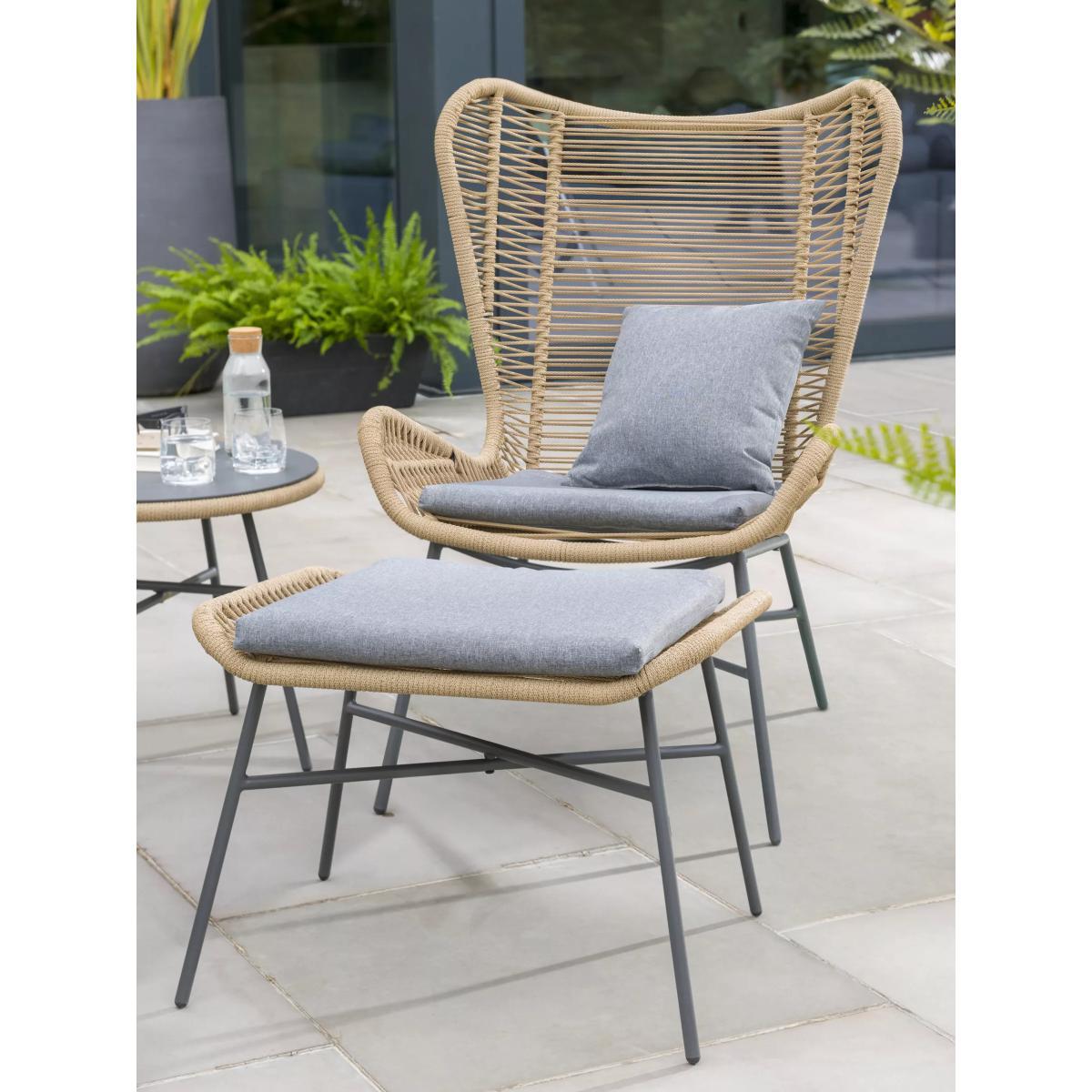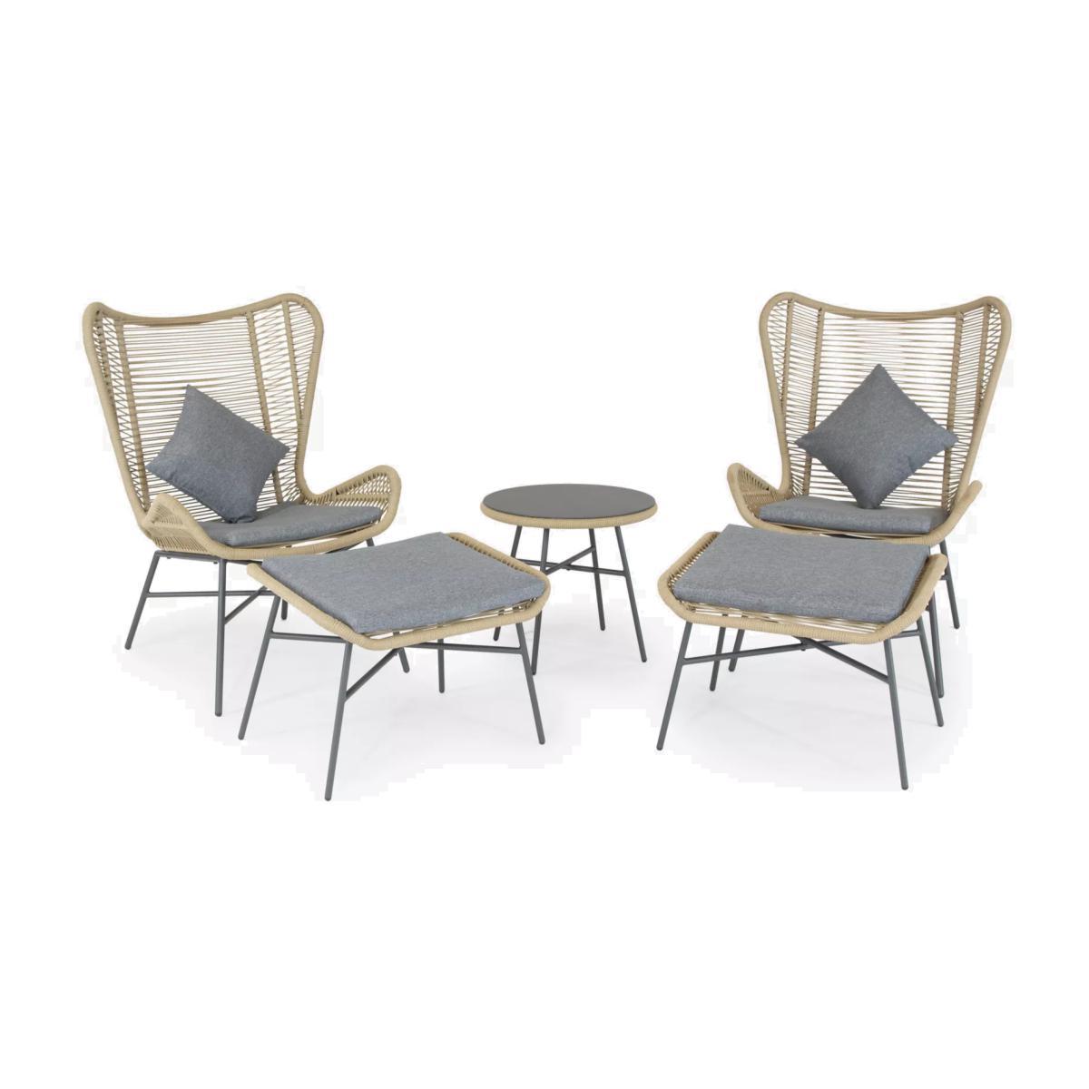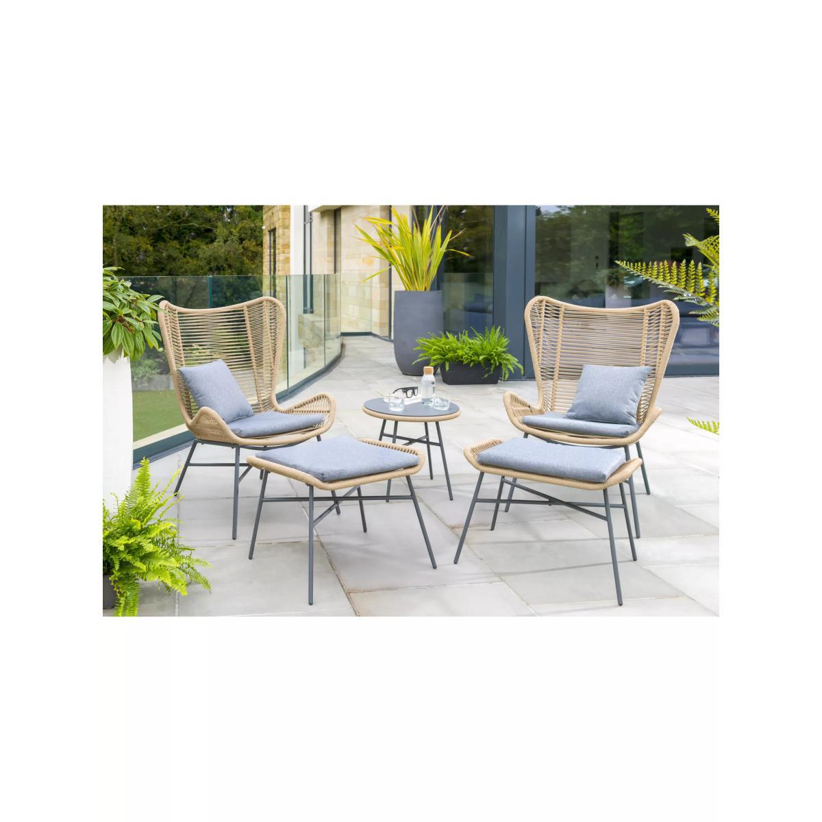 This Lyon duo lounging set from KETTLER combines the traditional shape of wing-back chairs with a modern weatherproof design for relaxing in the garden, on the patio or indoors. The five-piece set includes a pair of large and comfortable armchairs with two footstools and a round side table. The hard-wearing galvanised steel frames are powder-coated to prevent rusting and they feature PVC rope weaving on the seating and footrests that's tough and waterproof so the set can be left outside all year round. The seating and footrest cushion pads plus two scatter cushions are comfortable, stain-resistant and should be brought inside when not in use. This bistro set comes with a small round table with a painted glass top that's ideal for placing drinks and snacks within reach. Key features: Two large wing-back armchairs with footrests Round glass top side table Robust galvanised and powder-coated steel frames Weatherproof furniture Comfortable and stain-resistant cushions Easy to maintain Want to see it first? You may want to see and get a feel for the furniture in one of our shops before ordering. We'll be able to tell you where the range you'd like to view is on display.