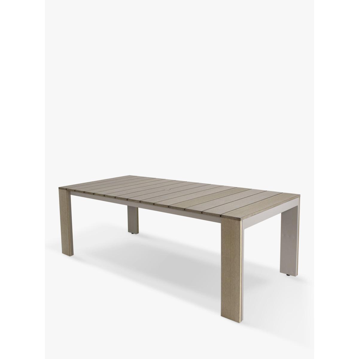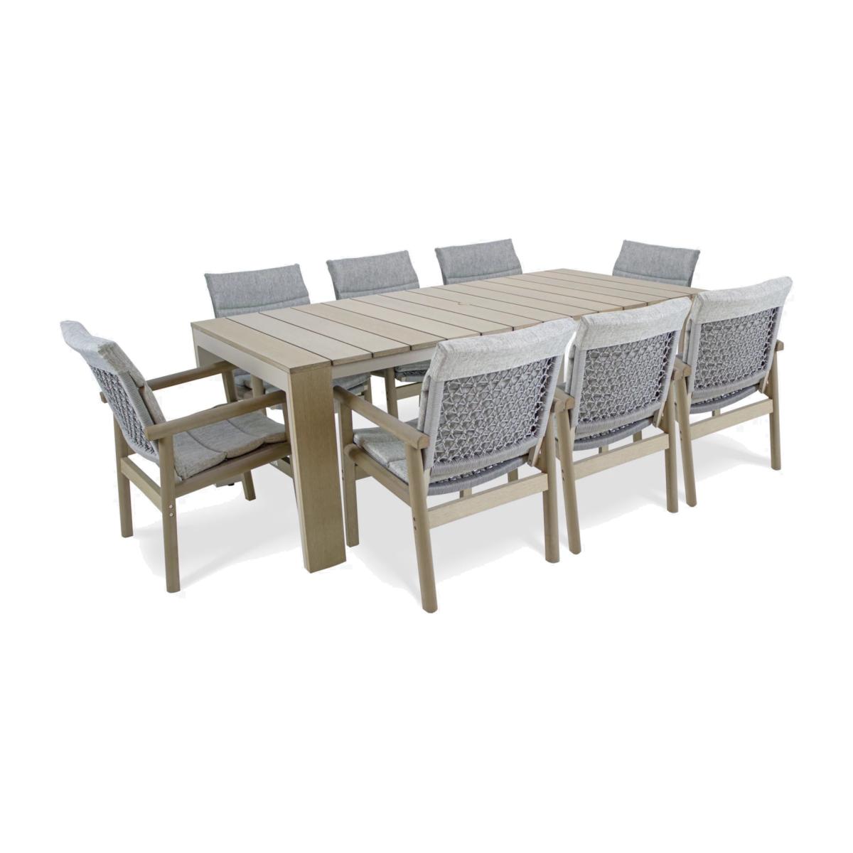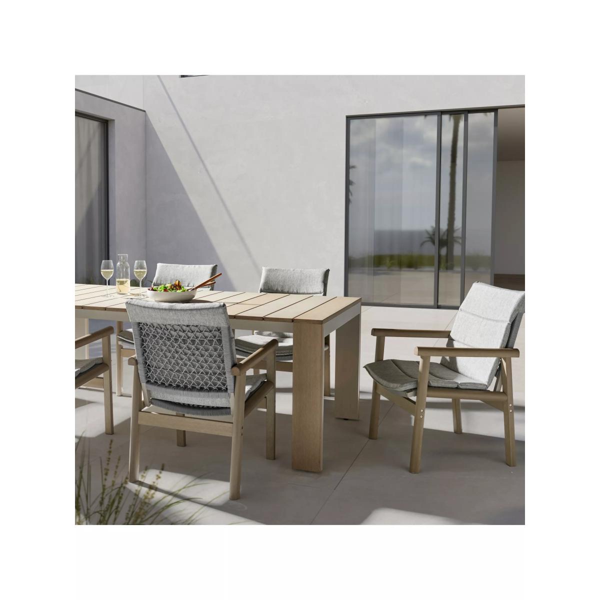 The luxurious Mali range from KETTLER has a modern look, made from high-quality and robust aluminium frames edged with innovative Sumparwood which looks just like real wood. An environmentally friendly material made from recycled components, Sumparwood includes recycled polystyrene mixed with wood waste to produce a really strong and weather-resistant material, requiring virtually no maintenance. This garden set includes a rectangular dining table with a wood-effect tabletop. The eight dining chairs have synthetic rope-like seats and backrests and come with panelled seat and backrest pads for added comfort.