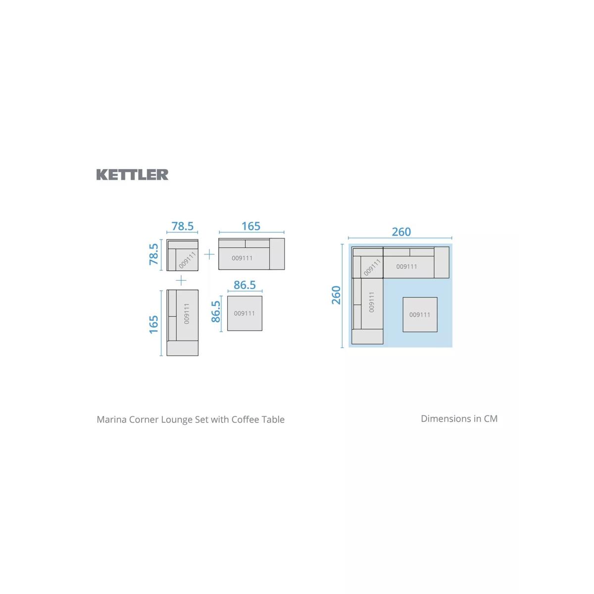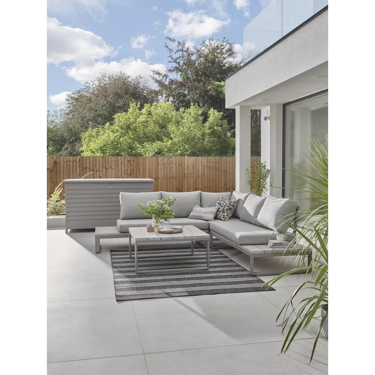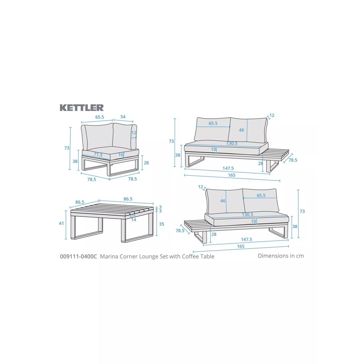 Part of KETTLER's Marina garden furniture range, this set is made from rust-proof and lightweight aluminium, without compromise on strength. The five-seater corner sofa set comes with comfy weatherproof seat and backrest cushions. The rectangular dining table has a wood-effect top that matches the side tables at either end of the sofa set. Five-seater corner sofa set with wood-effect side tables at each end Square garden coffee table with a wood-effect top Rust-proof and lightweight aluminium frames Weatherproof seat and backrest cushions for comfort Low maintenance Part of the KETTLER Marina range of garden furniture Care information Can be left outdoors all year round, excluding the cushions Cover or store the cushions when not in use in order to use immediately. If the cushions get wet from a shower, they will take around 20 minutes to 2 hours to fully dry Sponge clean the cushions only. Use a fabric care kit to clean and protect your cushions. Store in a dry ambient temperature during winter months To clean the furniture, remove dust regularly with a soft clean brush and wipe down with a clean damp cloth Remove food and drink residue, tree sap and bird droppings as soon as possible to avoid staining Marks should be removed using neat mild detergent with a soft cloth and washed off with water