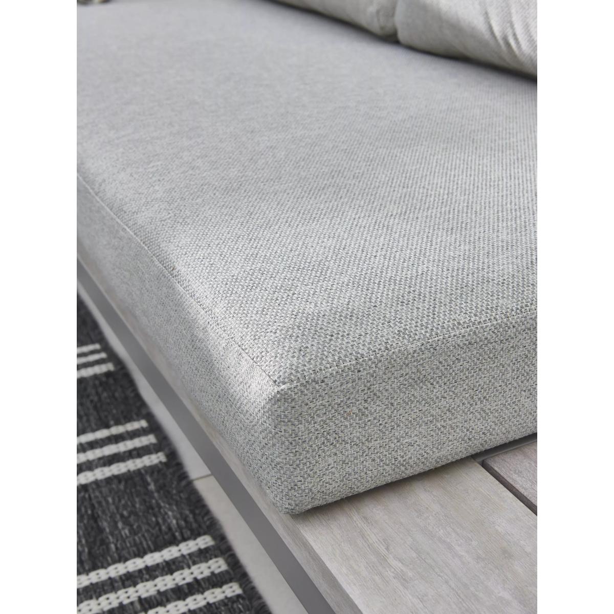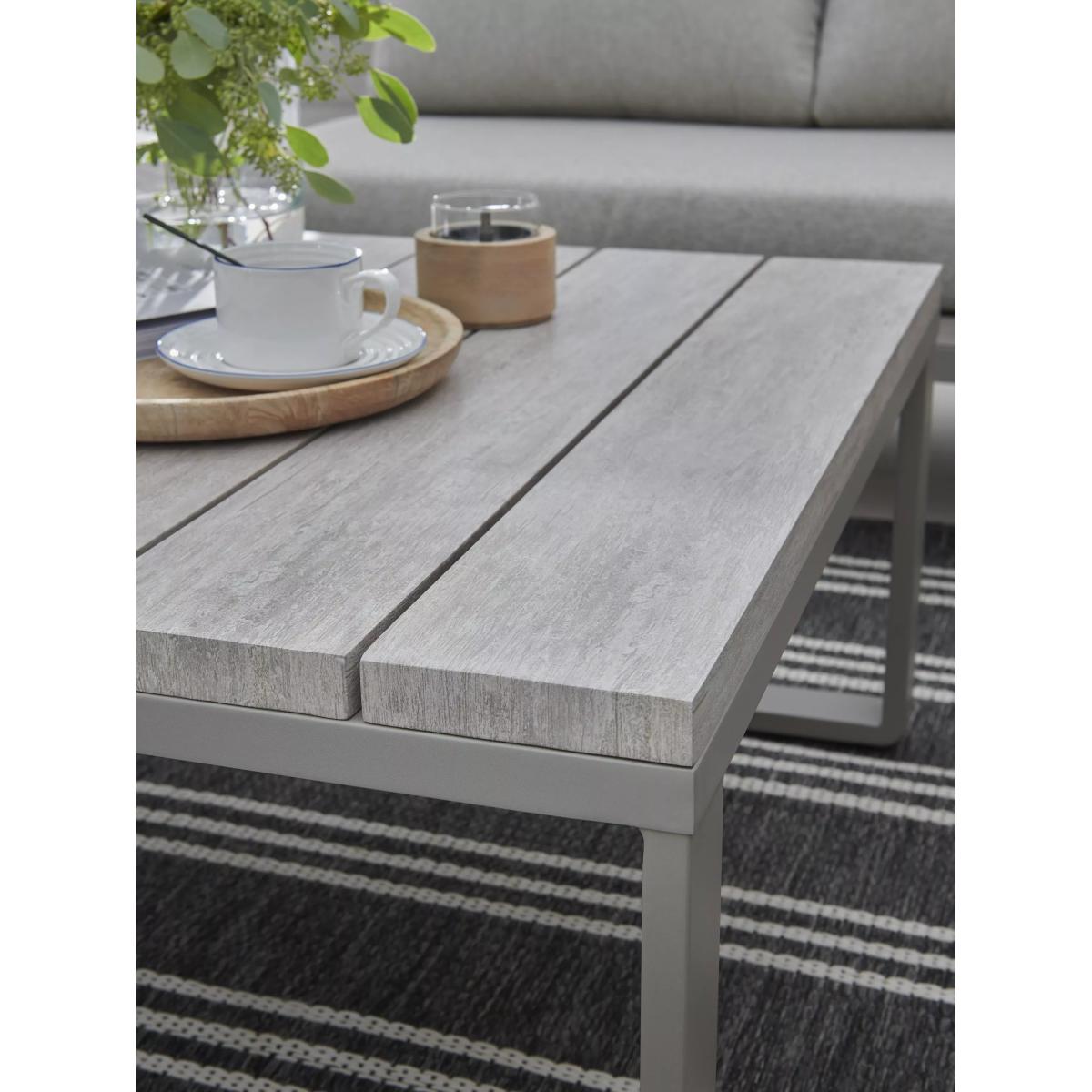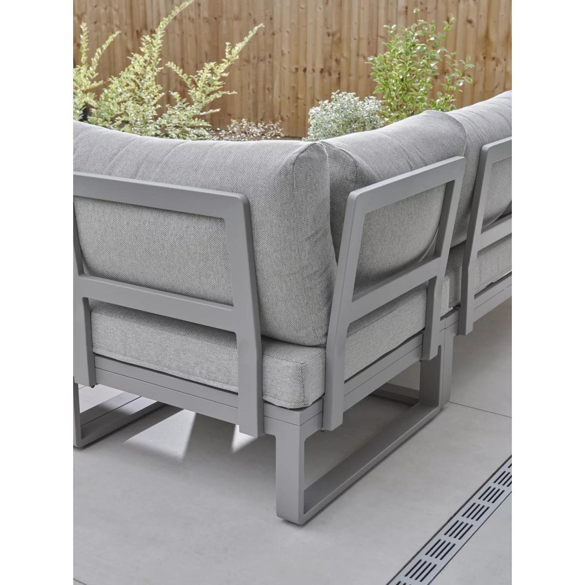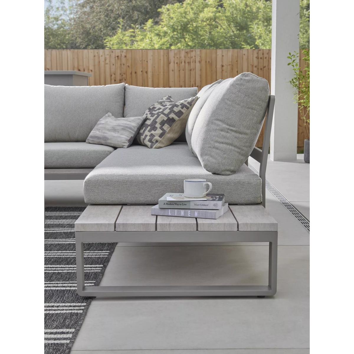 Part of KETTLER's Marina garden furniture range, this set is made from rust-proof and lightweight aluminium, without compromise on strength. The five-seater corner sofa set comes with comfy weatherproof seat and backrest cushions. The rectangular dining table has a wood-effect top that matches the side tables at either end of the sofa set. Five-seater corner sofa set with wood-effect side tables at each end Square garden coffee table with a wood-effect top Rust-proof and lightweight aluminium frames Weatherproof seat and backrest cushions for comfort Low maintenance Part of the KETTLER Marina range of garden furniture Care information Can be left outdoors all year round, excluding the cushions Cover or store the cushions when not in use in order to use immediately. If the cushions get wet from a shower, they will take around 20 minutes to 2 hours to fully dry Sponge clean the cushions only. Use a fabric care kit to clean and protect your cushions. Store in a dry ambient temperature during winter months To clean the furniture, remove dust regularly with a soft clean brush and wipe down with a clean damp cloth Remove food and drink residue, tree sap and bird droppings as soon as possible to avoid staining Marks should be removed using neat mild detergent with a soft cloth and washed off with water