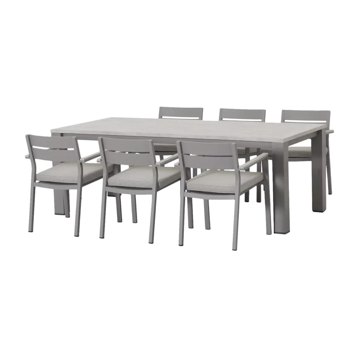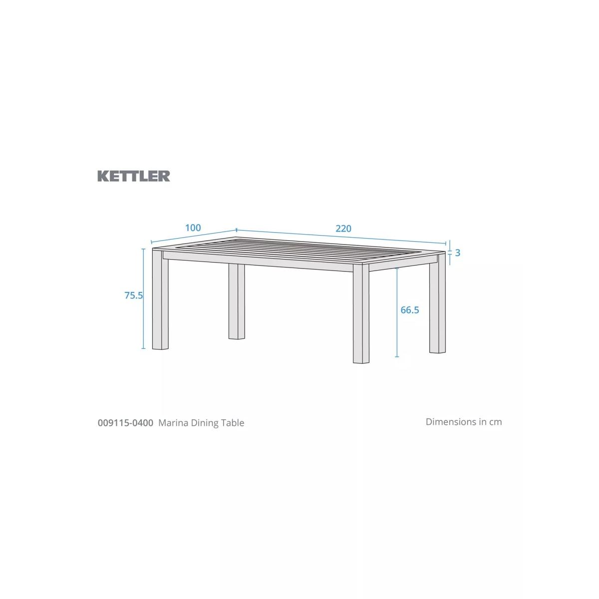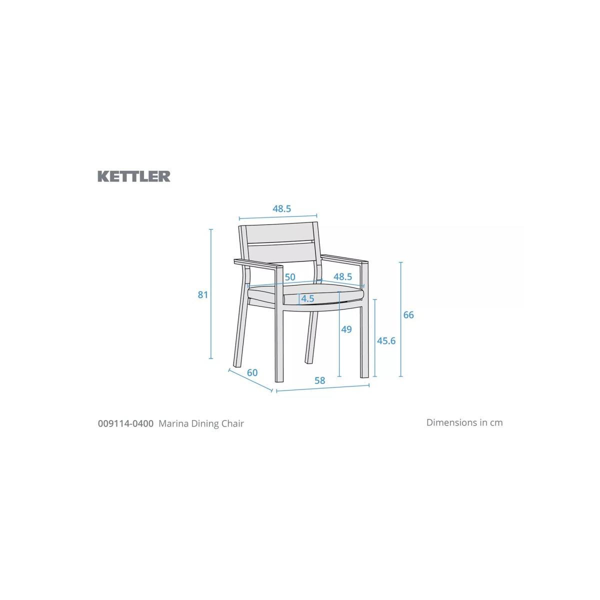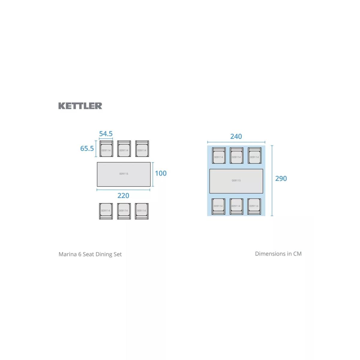 Part of KETTLER's Marina garden furniture range, this set is made from rust-proof and lightweight aluminium, without compromise on strength. The six dining chairs are low-backed for a simple yet modern feel and come with comfy weatherproof seat pads. The chunky dining table with wood-effect top. Six low-backed garden dining chairs Rust-proof and lightweight aluminium frames Weatherproof seat pads for comfort Chairs stack for compact storage Chunky rectangular dining table with a wood-effect top Low maintenance Part of the KETTLER Marina range of garden furniture Care information Can be left outdoors all year round, excluding the cushions Cover or store the cushions when not in use in order to use immediately. If the cushions get wet from a shower, they will take around 20 minutes to 2 hours to fully dry Sponge clean the cushions only. Use a fabric care kit to clean and protect your cushions. Store in a dry ambient temperature during winter months To clean the furniture, remove dust regularly with a soft clean brush and wipe down with a clean damp cloth Remove food and drink residue, tree sap and bird droppings as soon as possible to avoid staining Marks should be removed using neat mild detergent with a soft cloth and washed off with water Do not leave hot items directly on the table. Coasters will protect your table from heat and water rings. Do not drop anything sharp or heavy onto the table
