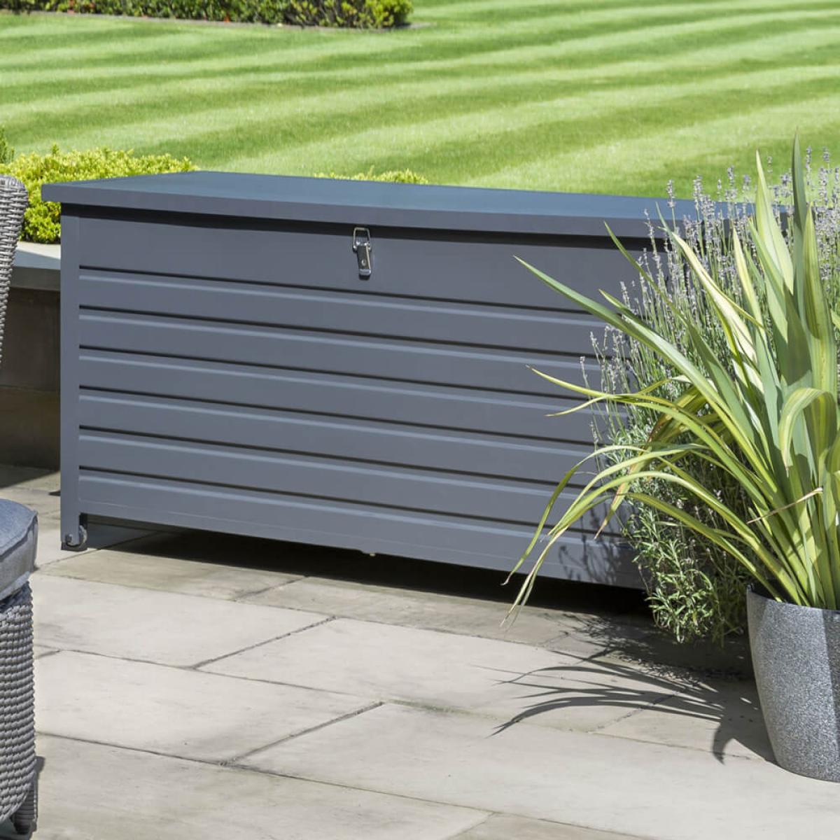 Product consists of:. About:. Garden storage solutions needn’t be unsightly. The Kettler Medium Aluminium Garden Storage Box has an elegant classic feeling design that will fit into many garden arrangements. This aluminium storage box provides plenty of practicality with wheels mounted on one end for easy mobility around the garden, and a waterproof zipped liner inside to keep the contents shielded from the elements. Spacious and user friendly, a top opening lid benefits from a gas assisted spring system. On the outer find a clasp if wanting to add a padlock to secure the contents. Store seat cushions or garden equipment securely year round, safe in the knowledge that the powder coated aluminium design will stand up to outdoor use. Also available is the – Kettler Large Aluminium Garden Storage Box.