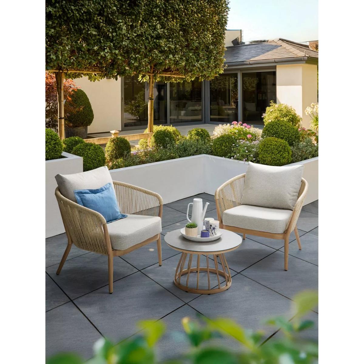The KETTLER Messina garden furniture range is a harmonious blend of modern aesthetics and timeless elegance. Crafted with sturdy aluminium frames featuring a wood-effect finish, the furniture is enhanced by the luxurious feel of wicker rope on the seating. The durable ceramic glass tabletop adds a sophisticated touch, ensuring both beauty and functionality. Weatherproof seat and backrest cushions provide comfort for use in the conservatory or outdoors. Two large garden lounge chairs Seating features rounded backs made of weather-resistant wicker rope Round garden side table with durable ceramic glass top Lightweight yet sturdy aluminium frames with a wood-effect finish Weatherproof seat and backrest cushions Matches furniture in the KETTLER Messina range