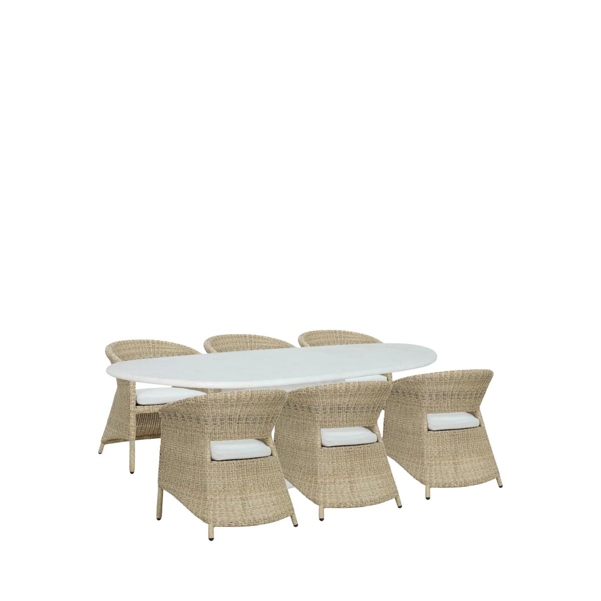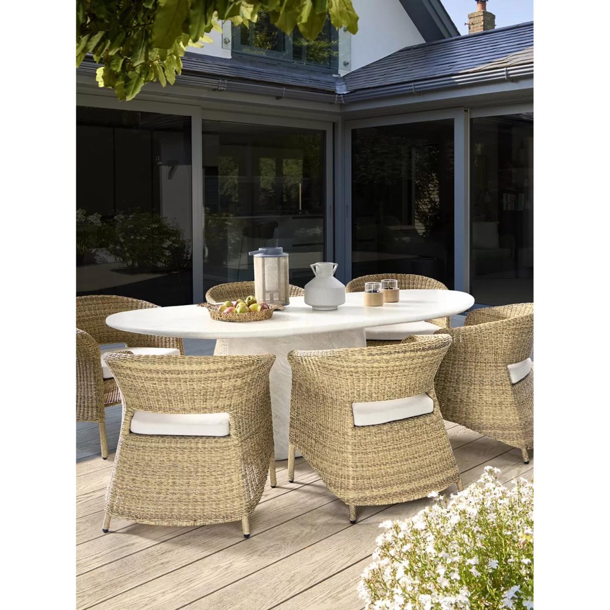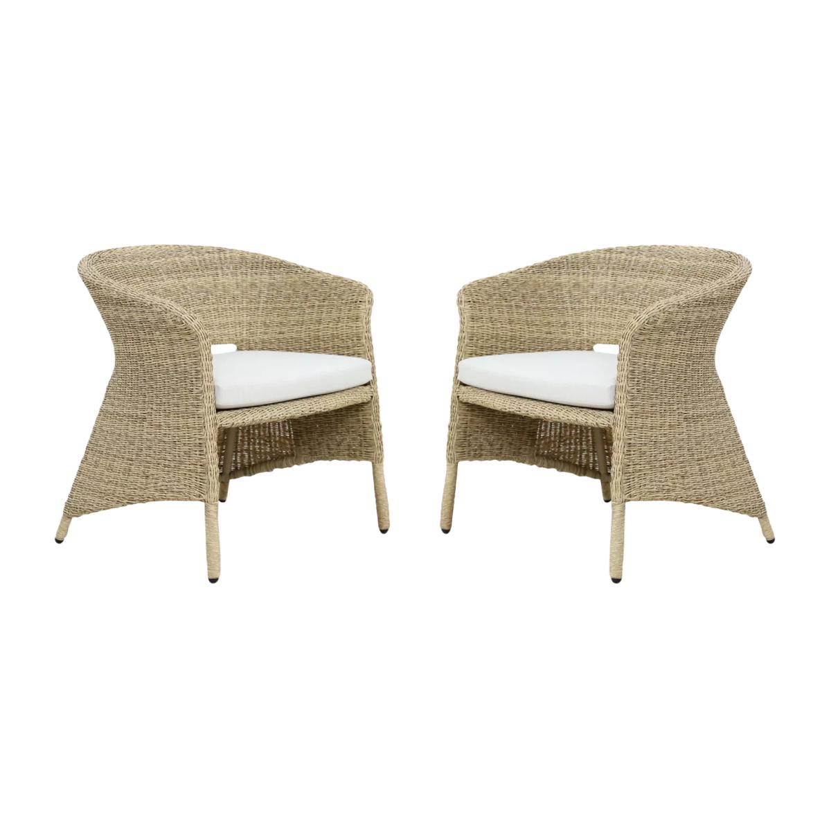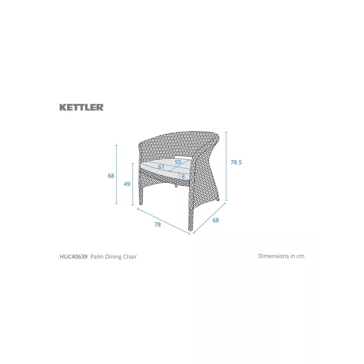Pair of KETTLER Palm dining armchairs ergonomically designed for maximum comfort, with curved backs and armrests and comfortable seat pads. The handwoven synthetic weave design on aluminium frames can be left outdoors all year round. Bring the cushions inside when not in use. Care information Can be left outdoors all year round, excluding the cushions Cushions cannot get wet and should be stored away when not in use and during winter months. Sponge clean only Remove food and drink residue, tree sap and bird droppings as soon as possible to avoid staining Marks should be removed using neat mild detergent with a soft cloth and washed off with water Clean at the beginning and end of the season using warm soapy water or a non-abrasive multi-surface cleaner Use a fully breathable universal cover in winter months