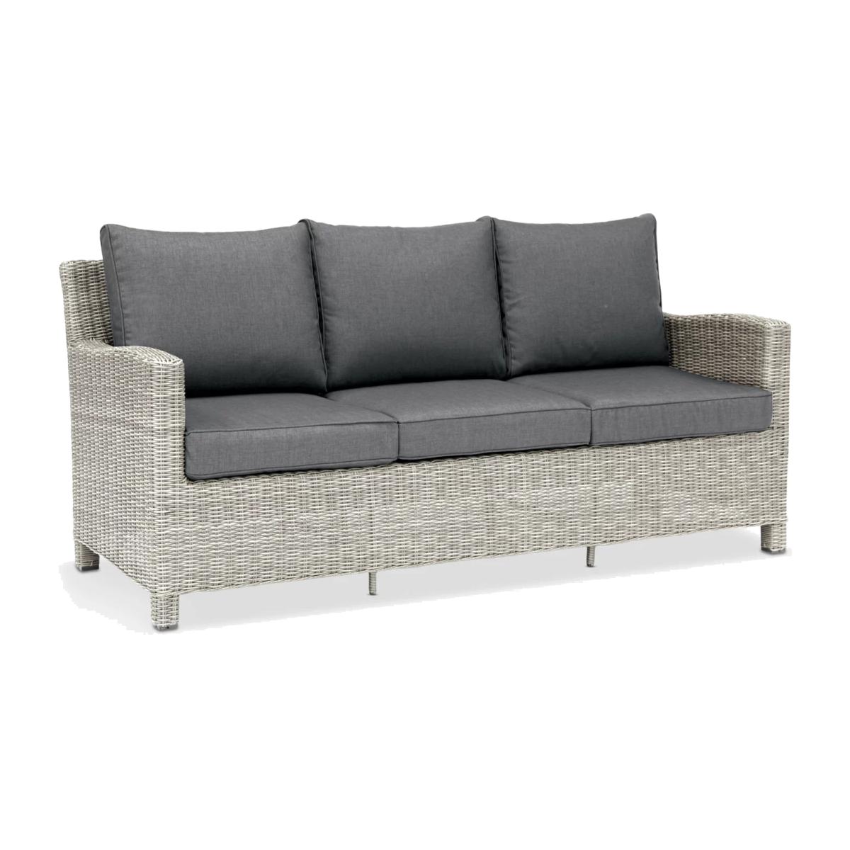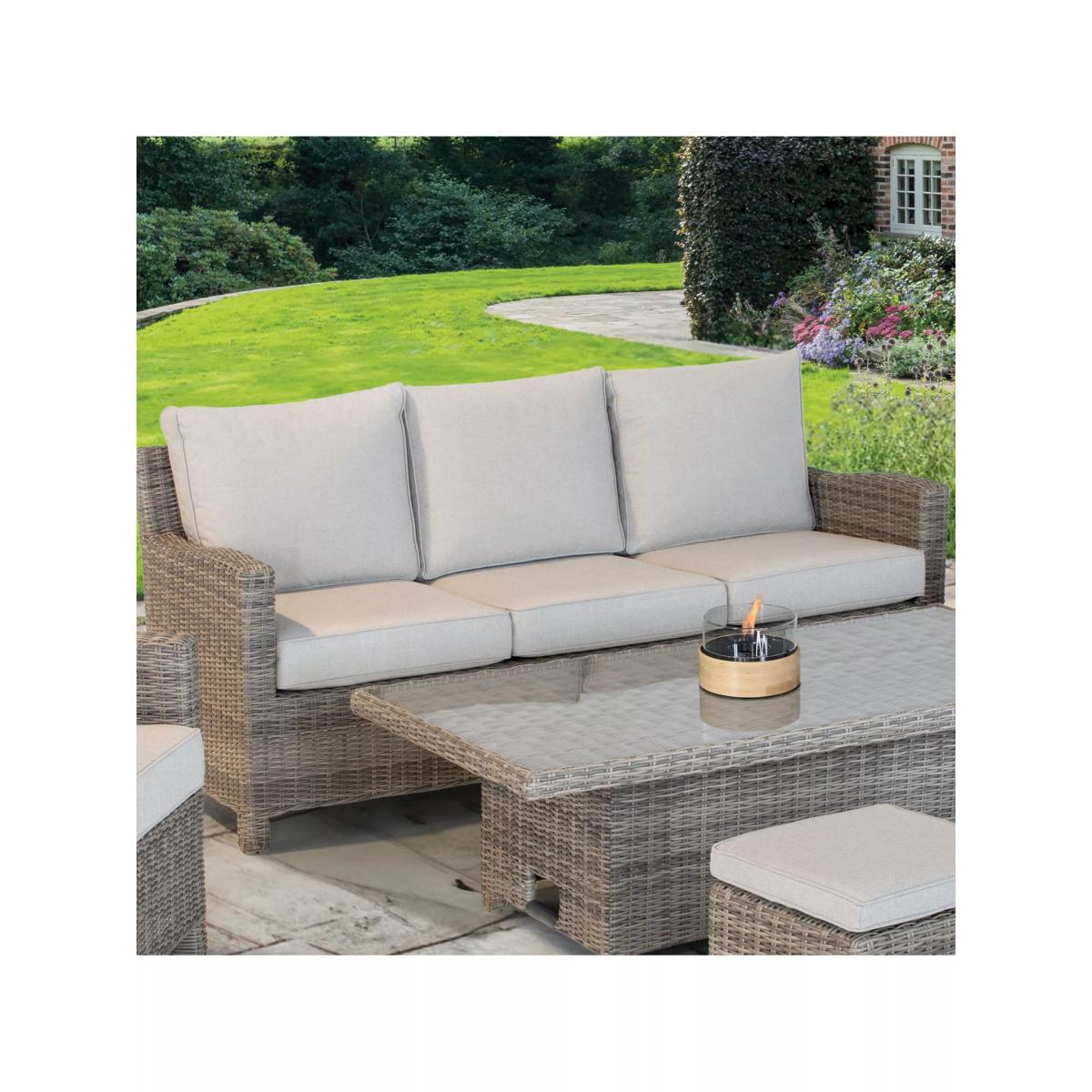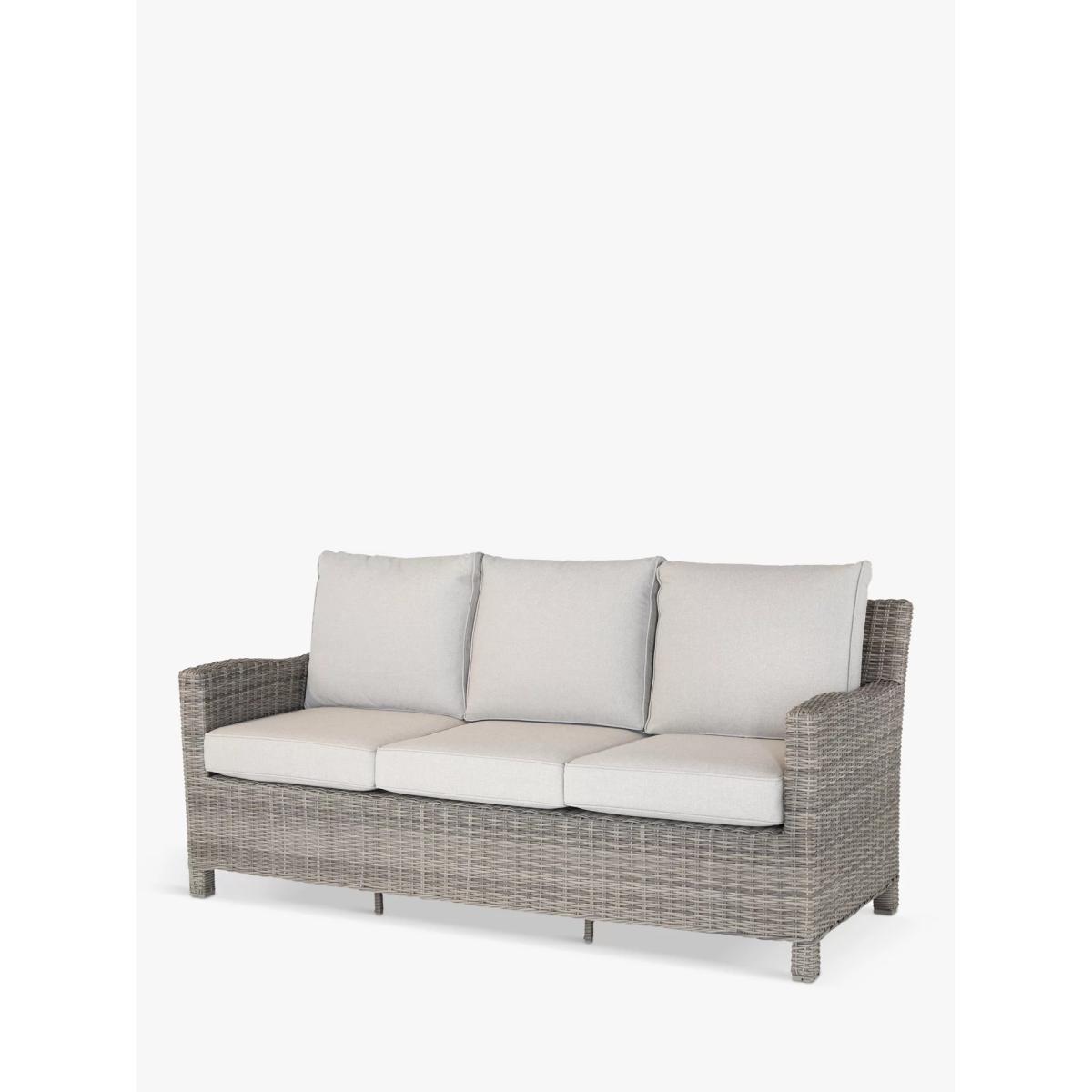 KETTLER Palma three-seater garden sofa for indoors or outdoors. Made with a strong aluminium frame, ergonomic design and 6mm half-round UV-resistant hand-woven synthetic wicker, a hard-wearing traditional rattan look. Made for comfort with weatherproof cushions that retain their shape thanks to the double piping and 8cm foam core seat. The sofa can be left outdoors all year round but bring the cushions in during inclement weather and over winter. Key features: Garden sofa seats up to three people Traditional-style handwoven synthetic wicker Weatherproof, rustproof and UV-resistant Lightweight yet robust aluminium frame Weatherproof double-piped cushions and 8cm foam core seat cushions Easy to maintain Match with other furniture in the Palma range Durable and weatherproof Built to last, the sofa is made with a lightweight yet sturdy aluminium frame and handwoven synthetic wicker with a 6mm half-round weave. The sofa is weatherproof, rustproof and UV-resistant, so it can remain outdoors all year round without it fading or cracking. Low maintenance The sofa needs just an annual clean with mild soapy water (without abrasive solvents). The cushions are sponge-clean only. If you wish to cover your furniture, a breathable cover can be used but make sure the furniture is dry before pulling it over the top. Soft and comfortable cushions The sofa comes with soft, comfortable cushions that are weatherproof and retain their shape thanks to double piping and the 8cm foam core seat cushion. Bring them inside when not in use.