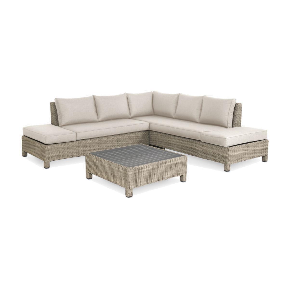 A versatile Palma garden lounging set, with seating for up to five people. The corner set includes a three-seater sofa, two-seater sofa and a low coffee table. With style and durability at the heart of the design, KETTLER's Palma outdoor furniture is made of weatherproof synthetic wicker with a 6mm half-round weave on powder-coated aluminium frames, creating a hard-wearing traditional rattan look. Key features: Square garden coffee table 3-seater sofa, 2-seater sofa Traditional-style handwoven synthetic wicker Weatherproof, rustproof and UV-resistant Lightweight yet robust aluminium frames Comfortable shower-resistant cushions Easy to maintain Match with other furniture in the Palma range Square coffee table The aluminium table has a painted wood-effect slatted table top, creating a natural feel that matches the sofa end side tables. Remove the cushions from the sofa ends to show the side tables and place the cushions on the coffee table to create a comfortable footrest. Durable and weatherproof Built to last, the set is made with lightweight yet sturdy powder-coated aluminium frames and handwoven synthetic wicker with a 6mm half-round weave. The set is weatherproof, rustproof and UV-resistant, so it can remain outdoors all year round without it fading or cracking. Low maintenance The set needs just an annual clean with mild soapy water (without abrasive solvents). The cushions are sponge clean only. If you wish to cover your furniture, a breathable cover can be used but make sure the furniture is dry before pulling it over the top. Soft and comfortable cushions The seating comes with soft, comfortable seat cushions and backrests that keep their shape. The double-piped cushions are shower-resistant and easy to remove. Bring them inside when not in use. Want to see it first? You may want to see and get a feel for the product in one of our shops before ordering. We'll be able to tell you where the range you'd like to view is on display.