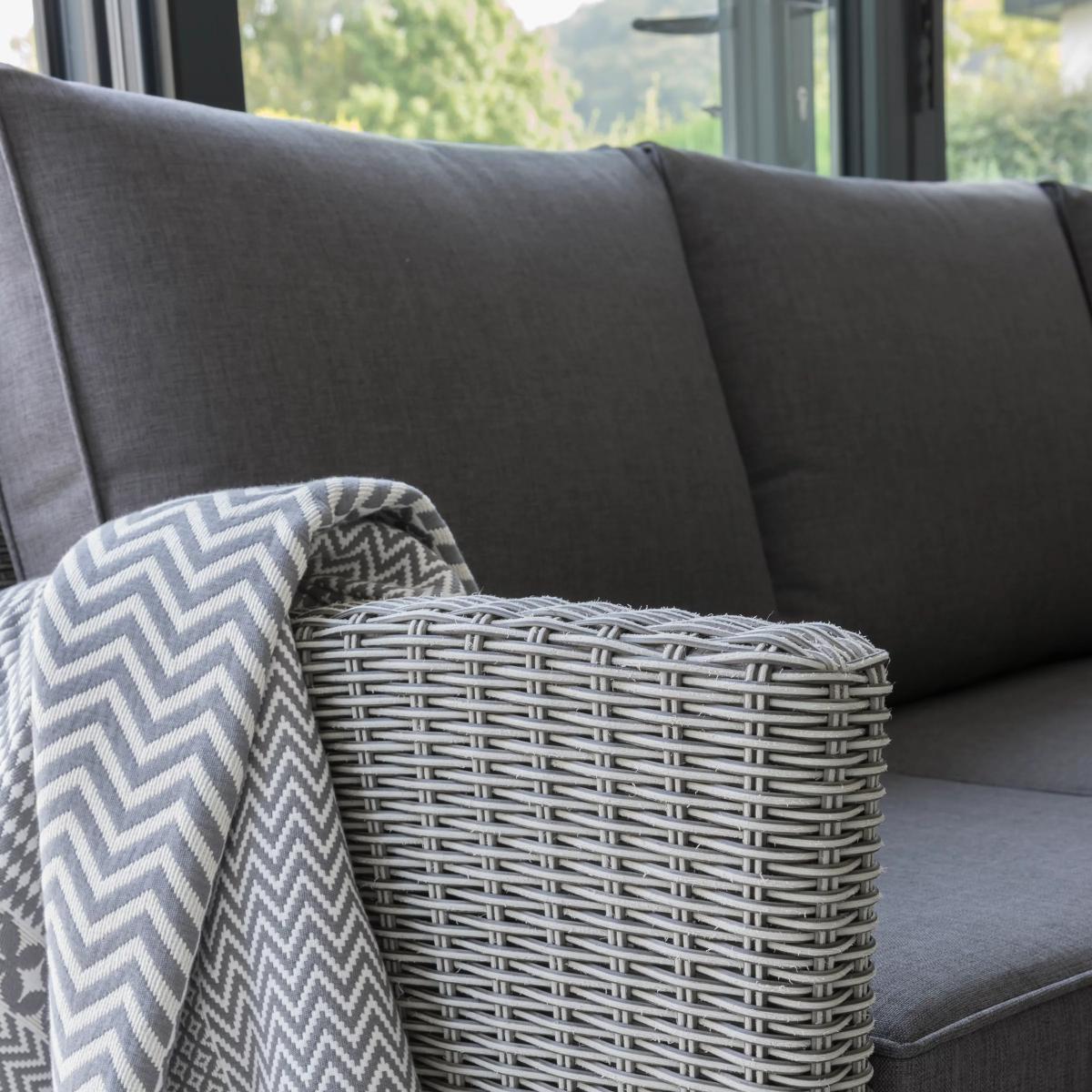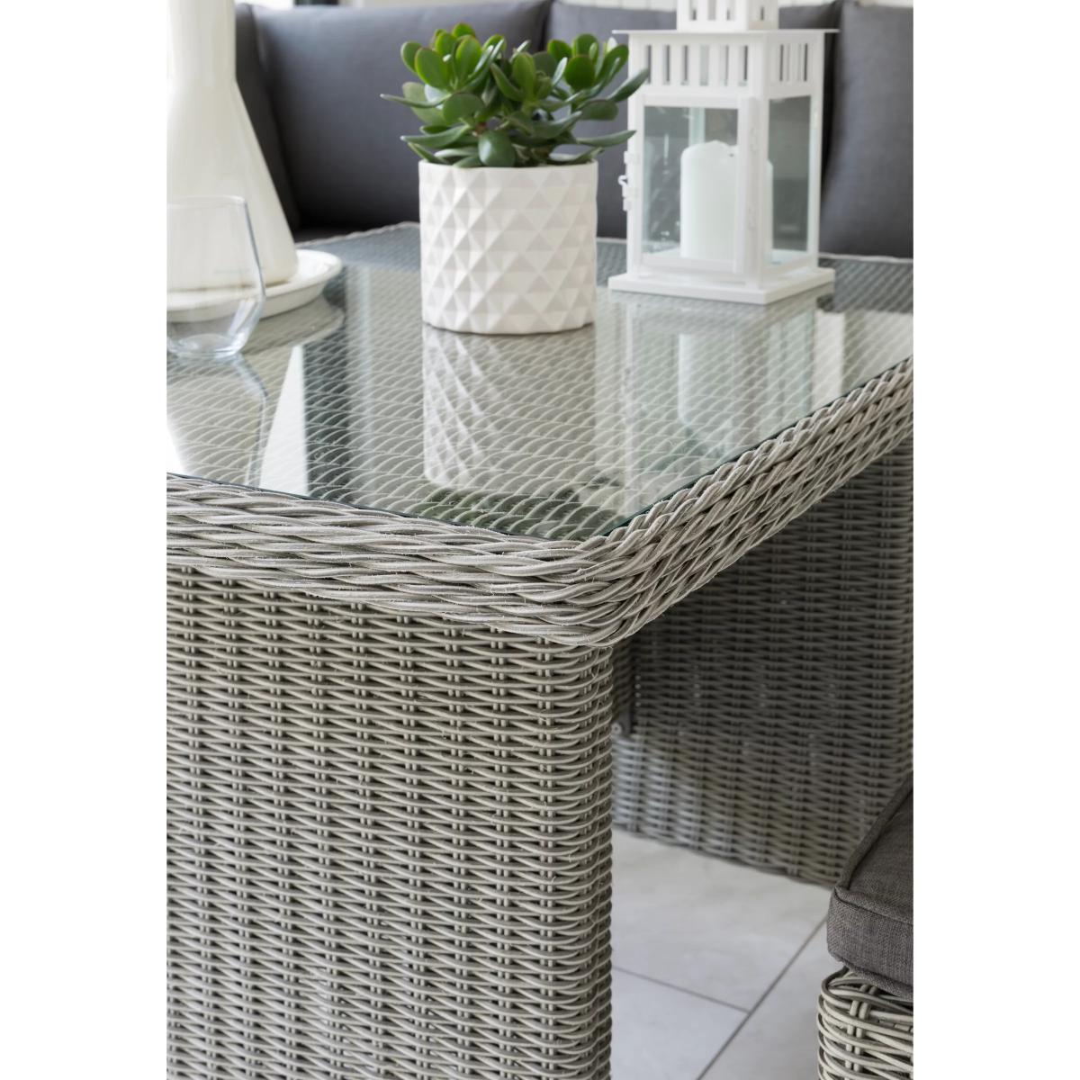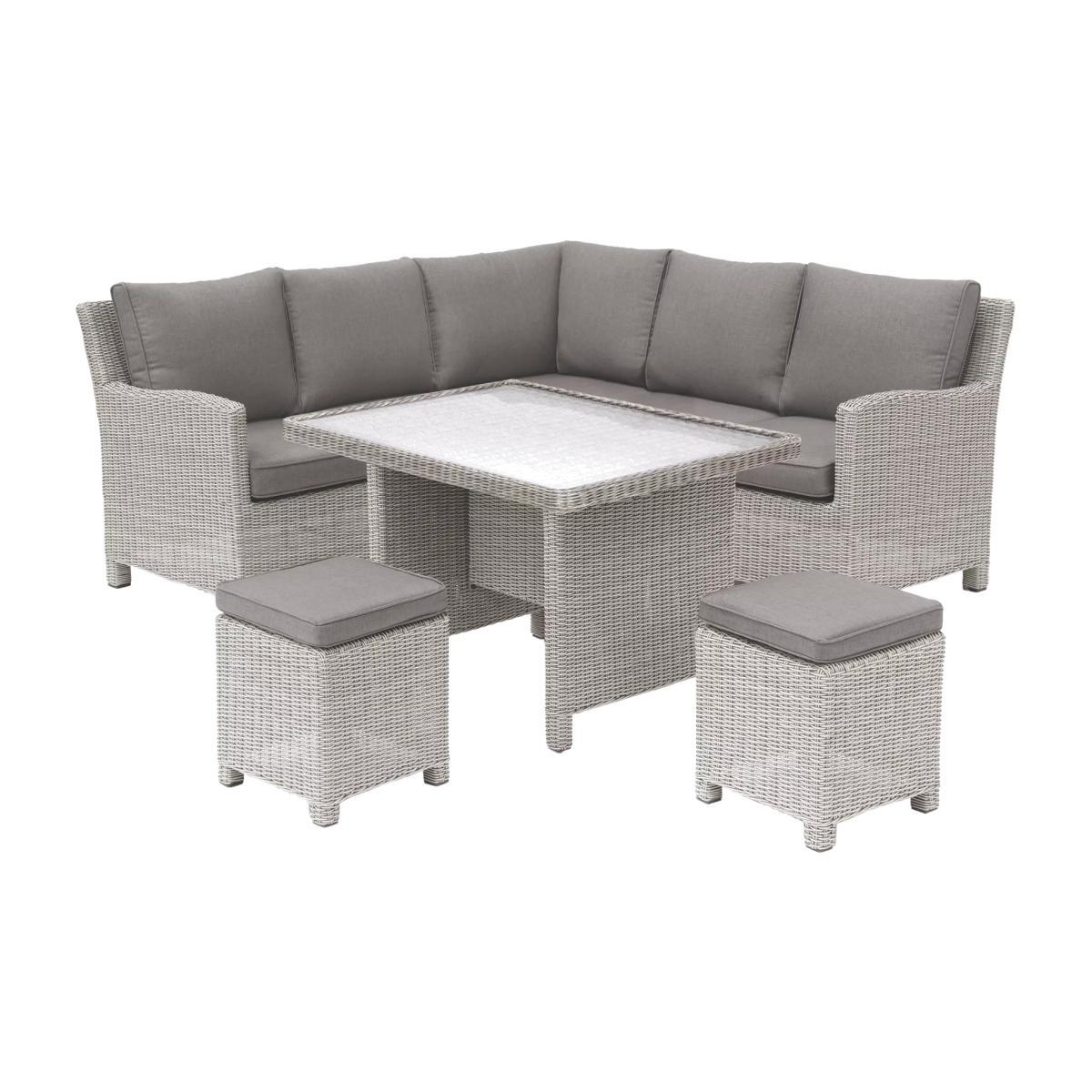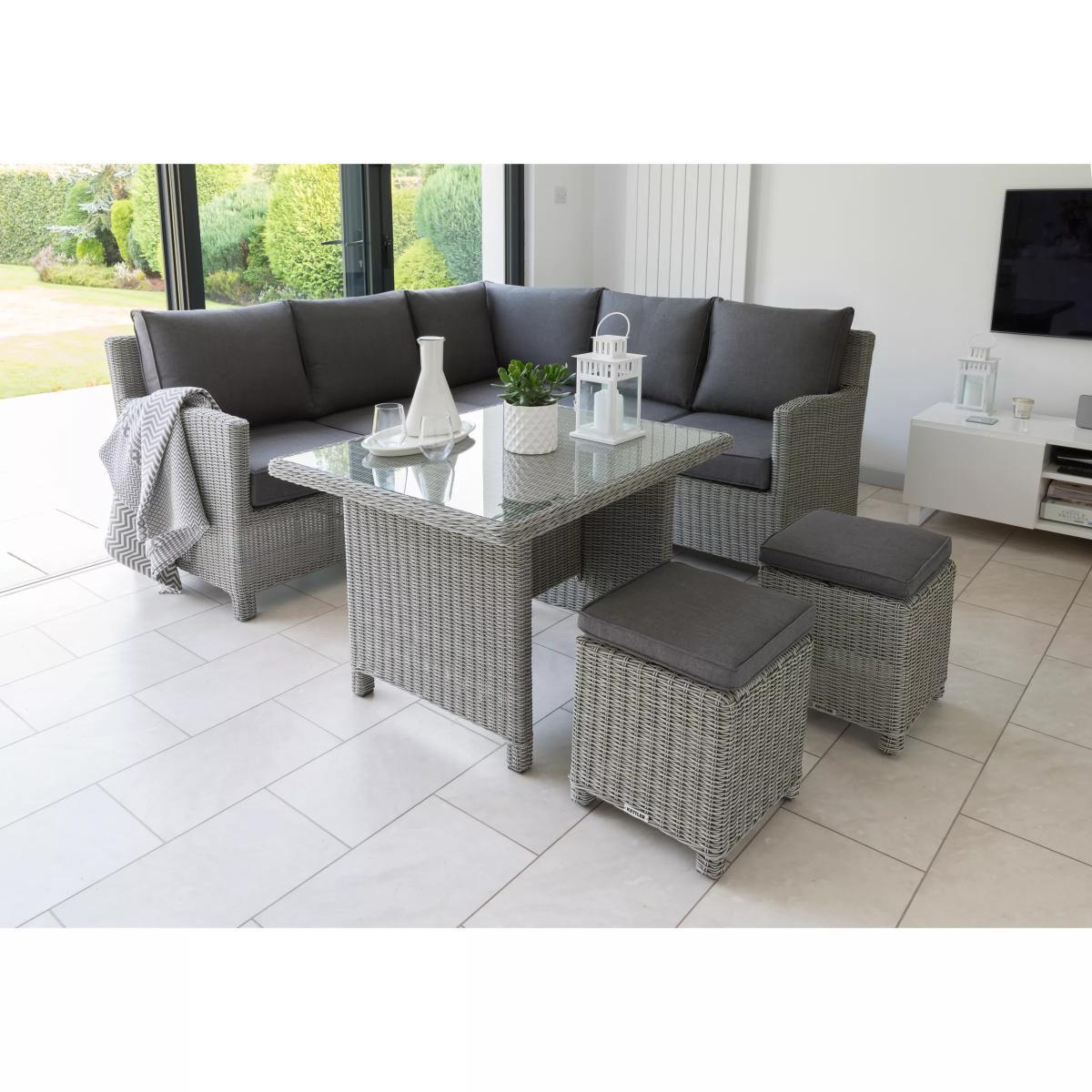 A Palma corner set for casual dining outdoors, with seating for up to seven people. This set includes an 'L' shaped sofa, a casual dining table with a glass top and two footstools. With style and durability at the heart of the design, KETTLER's Palma outdoor furniture is made of weatherproof synthetic wicker with a 6mm half-round weave on powder-coated aluminium frames, creating a hard-wearing traditional rattan look. Key features: Corner garden sofa unit, 2 footstools, dining table Comfortable shower-resistant cushions Traditional-style handwoven synthetic wicker Weatherproof, rustproof and UV-resistant Lightweight yet robust aluminium frames Easy to maintain Match with other furniture in the Palma range Seven-seater set The set includes a corner sofa unit that comfortably seats up to five people. A pair of matching footstools add two extra seats. The dining table has a glass top snugly set within the synthetic weave. Durable and weatherproof Built to last, the set is made with lightweight yet sturdy powder-coated aluminium frames and handwoven synthetic wicker with a tight 6mm half-round weave. The set is weatherproof, rustproof and UV-resistant, so it can remain outdoors all year round without it fading or cracking. Low maintenance The set needs just an annual clean with mild soapy water (without abrasive solvents). The cushions are sponge clean only. If you wish to cover your furniture, a breathable cover can be used but make sure the furniture is dry before pulling it over the top. Soft and comfortable cushions The seating comes with soft, comfortable seat cushions and backrests that keep their shape. The double-piped cushions are shower-resistant and easy to remove. Store them when not in use and bring them inside during winter months. Want to see it first? You may want to see and get a feel for the product in one of our shops before ordering. We'll be able to tell you where the range you'd like to view is on display.