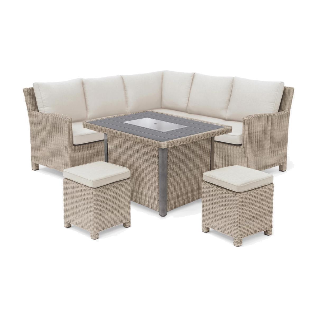 A more compact Palma garden casual dining set, this corner set has seating for up to seven people. The set includes corner sofa seating, two footstools and a table with a central firepit. With style and durability at the heart of the design, KETTLER's Palma outdoor furniture is made of synthetic wicker with a rounded weave and traditional rattan look. Key features: Rectangular table with firepit 3-seater sofa, 2-seater sofa and 2 footstools Traditional-style handwoven synthetic wicker Weatherproof, rustproof and UV-resistant Lightweight yet robust aluminium frames Comfortable shower-resistant cushions Easy to maintain Match with other furniture in the Palma range Firepit and casual dining table The aluminium table has a painted wood-effect slatted table top, creating a natural feel. The table has a central firepit and comes with a stainless steel cover so it can still be used as a conventional table when required. It also features a discreet storage section to keep a gas bottle out of sight. It's compatible with a 5kg propane gas patio cylinder with a type 1 connection (not included). Durable and weatherproof Built to last, the set is made with lightweight yet sturdy powder-coated aluminium frames and handwoven synthetic wicker with a 6mm half-round weave. The set is weatherproof, rustproof and UV-resistant, so it can remain outdoors all year round without it fading or cracking. Low maintenance The set needs just an annual clean with mild soapy water (without abrasive solvents). The cushions are sponge clean only. If you wish to cover your furniture, a breathable cover can be used but make sure the furniture is dry before pulling it over the top. Soft and comfortable cushions The seating comes with soft, comfortable seat cushions and backrests that keep their shape. The double-piped cushions are shower-resistant and easy to remove. Bring them inside when not in use. Want to see it first? You may want to see and get a feel for the product in one of our shops before ordering. We'll be able to tell you where the range you'd like to view is on display.