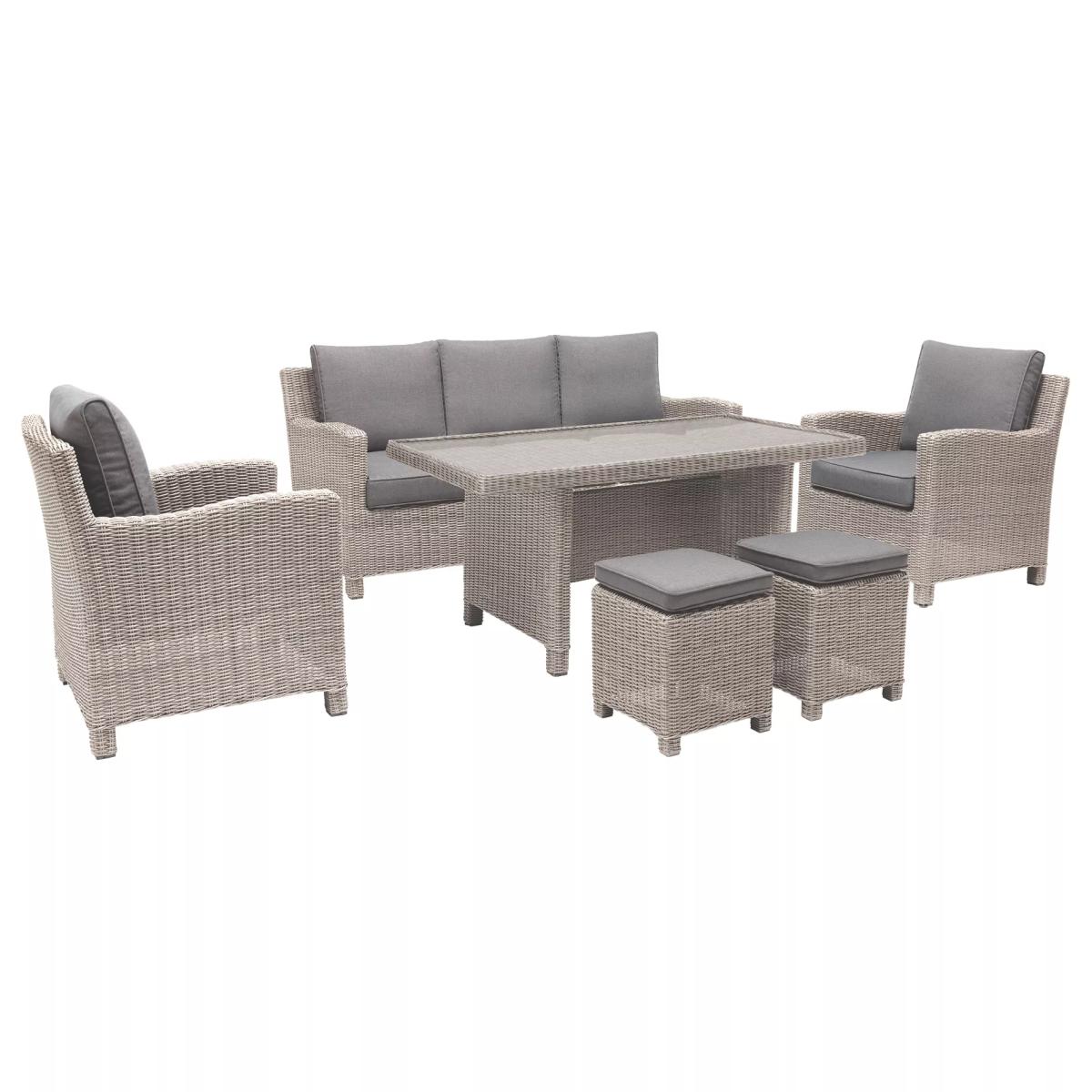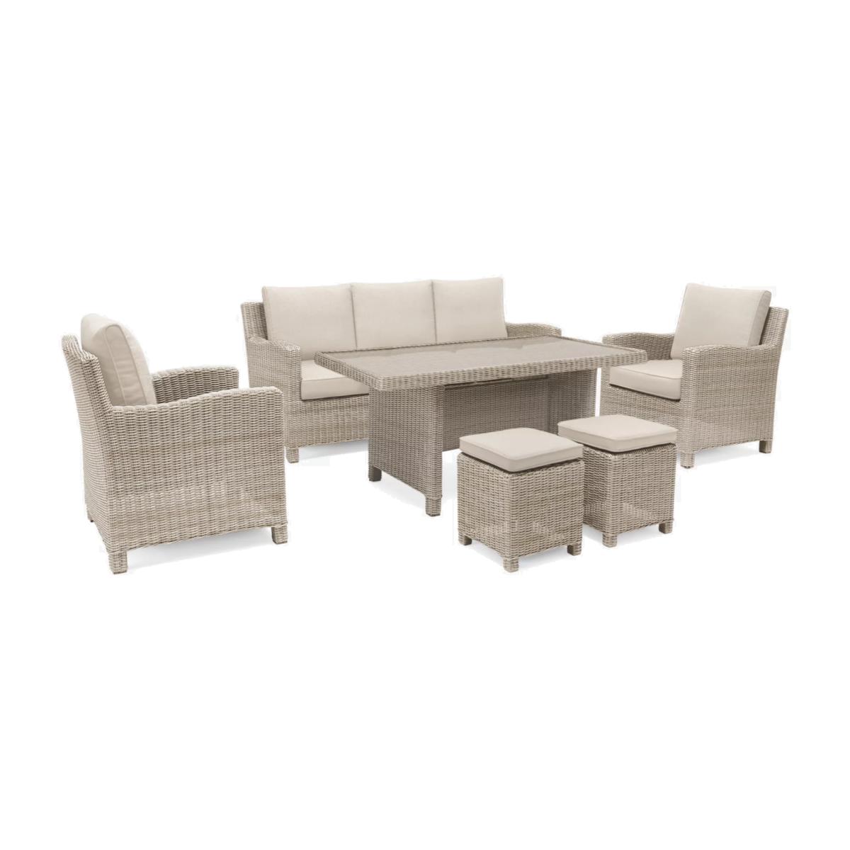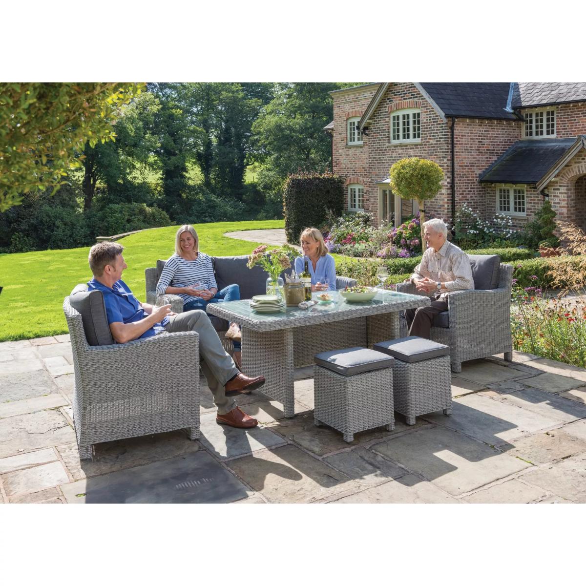 Versatile lounging or dining Palma furniture from KETTLER, this seven-seater set includes a rectangular dining table with a glass top, two stools, a three-seater sofa and two matching armchairs, ergonomically designed for comfort. With style and durability at the heart of the design, KETTLER's Palma outdoor furniture is made of weatherproof synthetic wicker with a 6mm half-round weave on powder-coated aluminium frames, creating a hard-wearing traditional rattan look. Key features: Rectangular dining table, 2 stools, 2 armchairs and 3-seater sofa set Traditional-style handwoven synthetic wicker Weatherproof, rustproof and UV-resistant Lightweight yet robust aluminium frames Adjustable feet on all chairs and table legs Double piped back cushions and 5cm foam core seat cushions Soft, shower-resistant cushions Easy to maintain Seat height: 36cm Match with other furniture in the Palma range Strong and stylish table The aluminium frame and wicker table has a glass table top. The stools fit neatly under the table for compact storage. Durable and weatherproof Built to last, the set is made with lightweight yet sturdy powder-coated aluminium frames and handwoven synthetic wicker with a 6mm half-round weave. The set is weatherproof, rustproof and UV-resistant, so it can remain outdoors all year round without it fading or cracking. Low maintenance The set needs just an annual clean with mild soapy water (without abrasive solvents). The cushions are sponge clean only. If you wish to cover your furniture, a breathable cover can be used but make sure the furniture is dry before pulling it over the top. Soft and comfortable cushions The chairs come with soft, comfortable seat cushions. The cushions are shower-resistant and easy to remove. Bring them inside when not in use. Want to see it first? You may want to see and get a feel for the product in one of our shops before ordering. We'll be able to tell you where the range you'd like to view is on display.