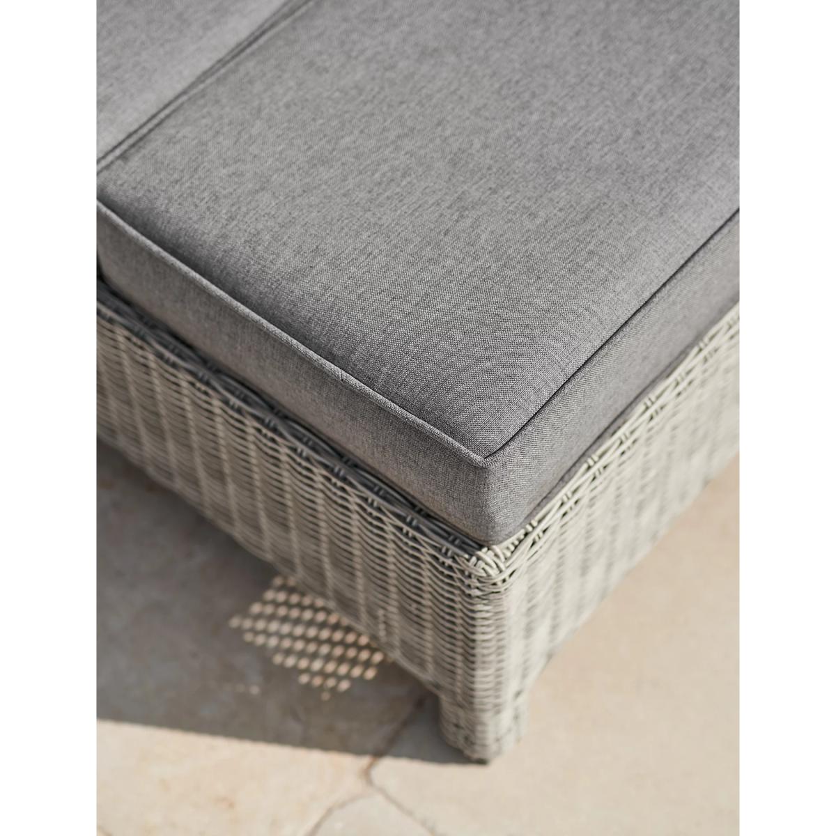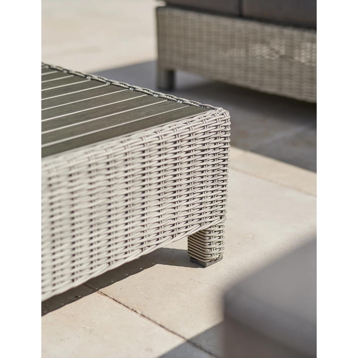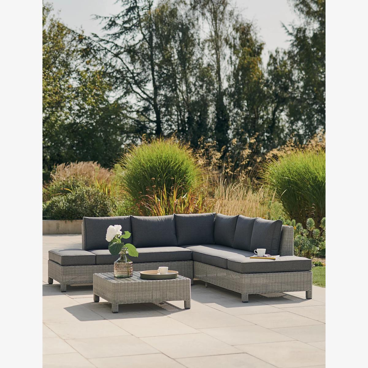 Create a comfy space for outdoor socialising with this garden lounge set from Kettler. It features a stylish corner sofa that can comfortably seat five people, plus a low coffee table with a sturdy slatted top. Each piece is crafted with a strong aluminium frame and hand-woven with a tactile wicker-look material. The comfy cushions are weatherproof for year-round use, and the coffee table can be converted into a footstool by using the end cushion from each sofa.