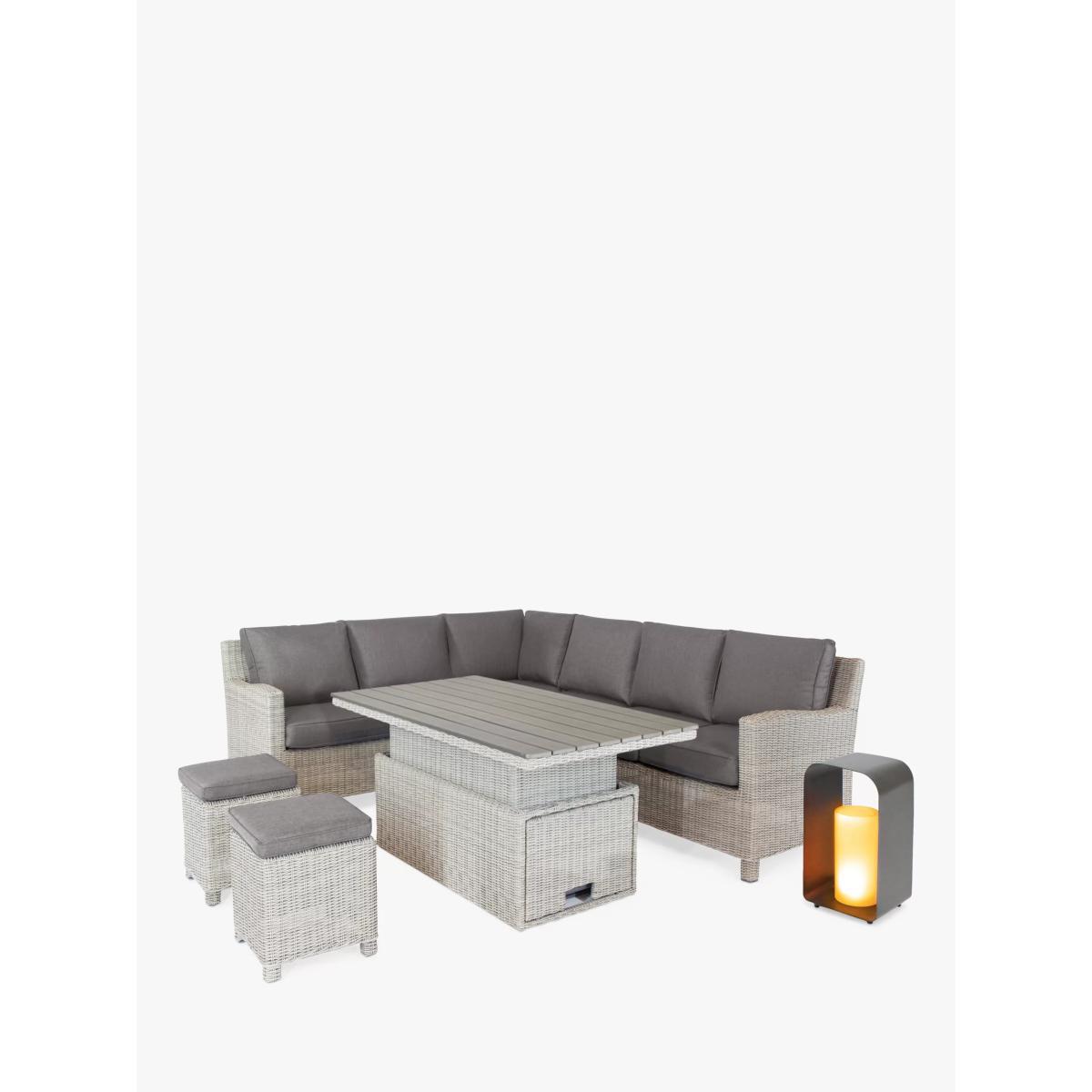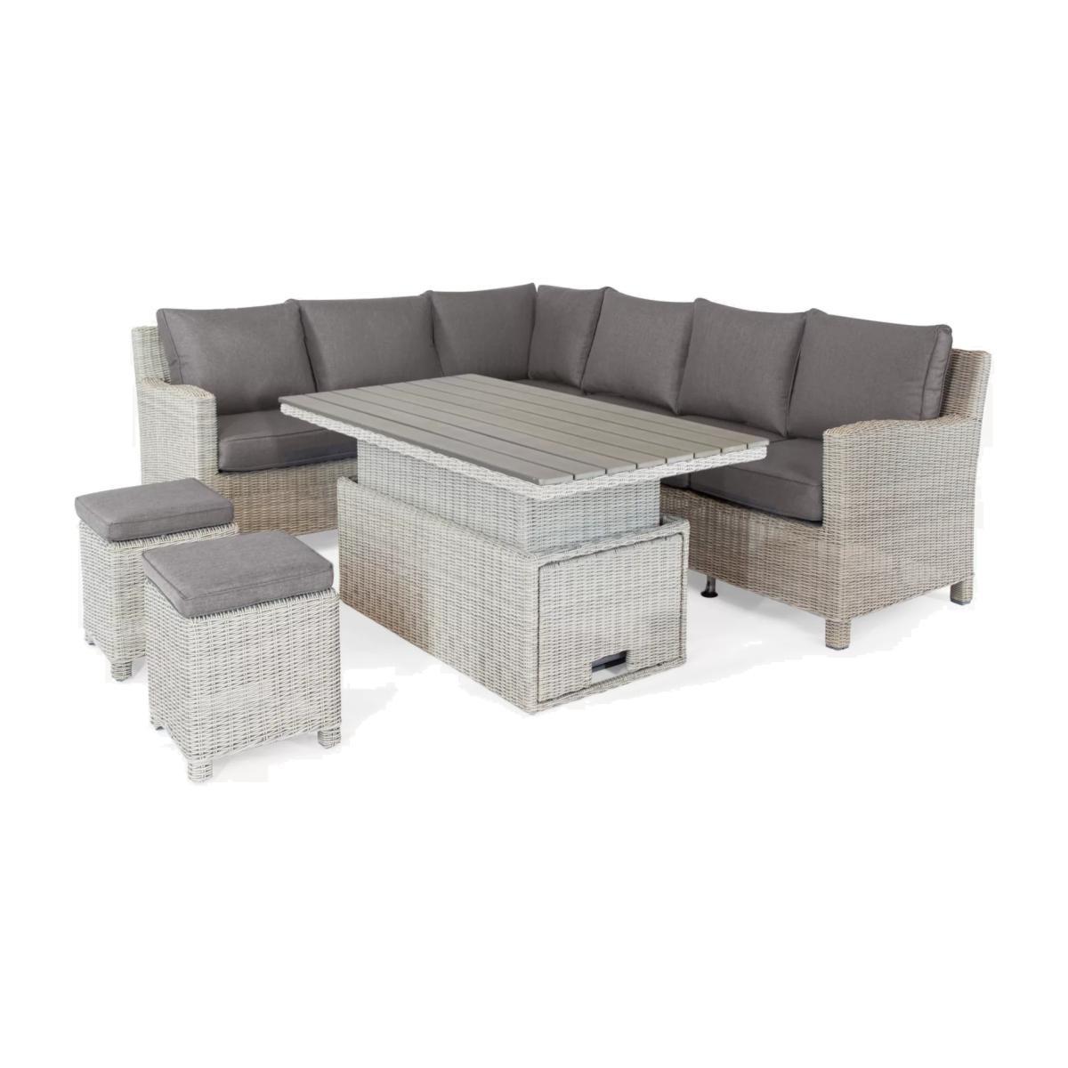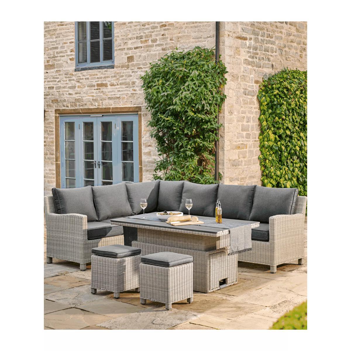 With style and durability at the heart of their designs, KETTLER's Palma garden furniture is made of synthetic wicker with a traditional look that suits the garden or conservatory. This roomy set includes a six-seater corner sofa, two matching stools and a rectangular table that adjusts in height to take the set from relaxed lounging to casual dining. The table has a wood-effect slatted top which is weather-resistant. All furniture pieces are made from weather-proof wicker, handwoven with a 5mm half-round weave on square-tube aluminium frames for low maintenance and strength. Ultra-soft cushioning is included on all seating, with smart double piping for extra durability. The cushions are UV, stain and shower resistant. Key features: Six-seater corner sofa, two stools Adjustable height rectangular table Traditional style synthetic wicker Lightweight yet robust aluminium frames Ultra-soft cushioning with double piping Easy to maintain Want to see it first? You may want to see and get a feel for the product in one of our shops before ordering. We'll be able to tell you where the range you'd like to view is on display. Choose the perfect outdoor furniture We have a vast selection of furniture for you to choose from which will suit the home or garden. The majority of our furniture ranges have been hand woven using a synthetic wicker. The thinner the weave, the longer it takes for the skilled workers to complete. All weave types are durable so they'll last throughout the seasons. All woven outdoor furniture is UV protected so it will not fade in direct sunlight. All woven outdoor furniture is easy to maintain, simply wipe clean using warm water Flat. A weave of various widths which offers incredible value for money Half round. More detailed with a 3D effect, the half round is a round weave in half which displays a wicker appearance on the top and hollowed underside Double half round. A double strand of half round, this is a wider width of weave which achieves an expensive appearance. Round weave. A very tight weave which is available in various widths, from 2mm to 5mm Rope A selection of our ranges have been made using rope. The yarn is made up of 10,000 (approx) woven strands with a double core for extreme strength, does not attract mould even if wet for a long time and is UV resistant.
