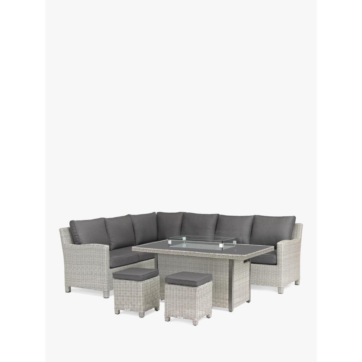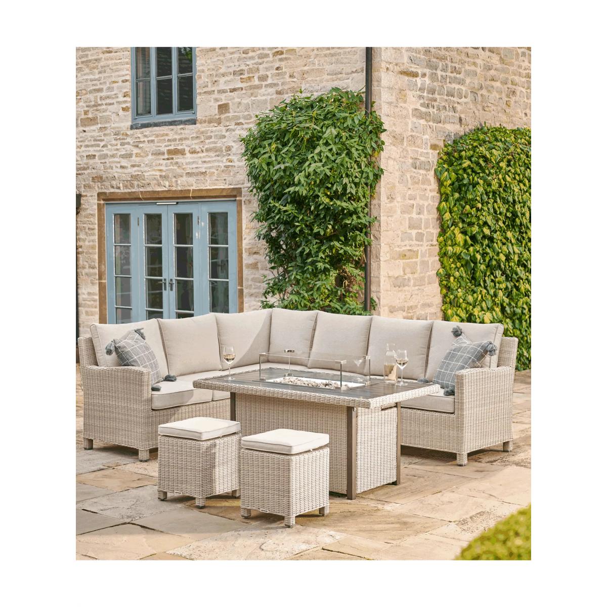 Relax in the sunshine with this Palma garden casual dining set, with seating for up to eight people. The set includes a six-seater corner sofa set, two footstools and a table with a central firepit. With style and durability at the heart of the design, KETTLER's Palma outdoor furniture is made of weatherproof synthetic wicker with a 6mm half-round weave on powder-coated aluminium frames, creating a hard-wearing traditional rattan look. Key features: Rectangular table with firepit 6-seater corner sofa set, 2 footstools Traditional-style handwoven synthetic wicker Weatherproof, rustproof and UV-resistant Lightweight yet robust aluminium frames Comfortable shower-resistant cushions Easy to maintain Match with other furniture in the Palma range Firepit and casual dining table The aluminium table has a painted wood-effect slatted table top, creating a natural feel. The table has a central firepit and comes with a stainless steel cover so it can still be used as a conventional table when required. It also features a discreet storage section to keep a gas bottle out of sight. It's compatible with a 5kg propane gas patio cylinder with a type 1 connection (not included). Durable and weatherproof Built to last, the set is made with lightweight yet sturdy powder-coated aluminium frames and handwoven synthetic wicker with a 6mm half-round weave. The set is weatherproof, rustproof and UV-resistant, so it can remain outdoors all year round without it fading or cracking. Low maintenance The set needs just an annual clean with mild soapy water (without abrasive solvents). The cushions are sponge clean only. If you wish to cover your furniture, a breathable cover can be used but make sure the furniture is dry before pulling it over the top. Soft and comfortable cushions The seating comes with soft, comfortable seat cushions and backrests that keep their shape. The double-piped cushions are shower-resistant and easy to remove. Bring them inside when not in use.