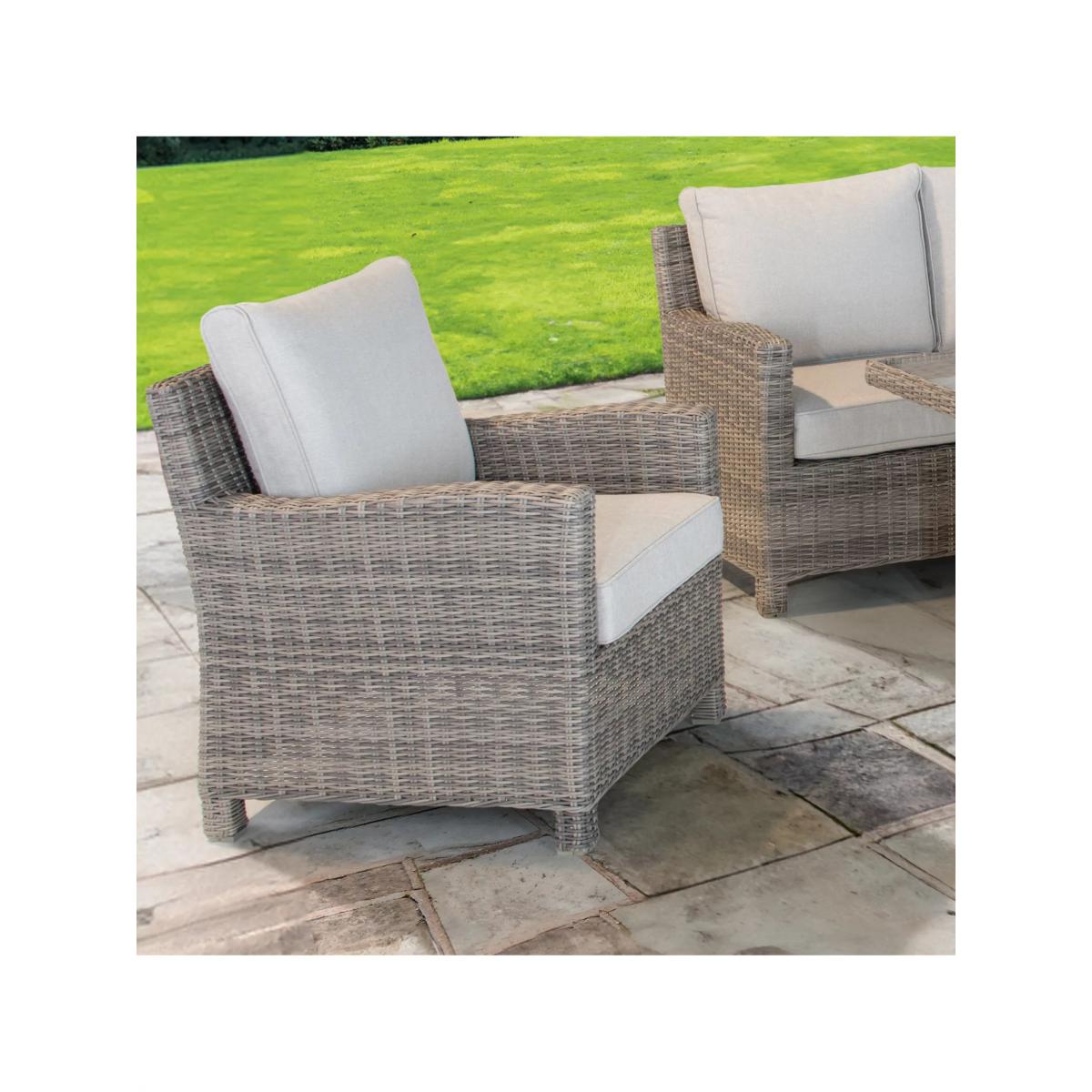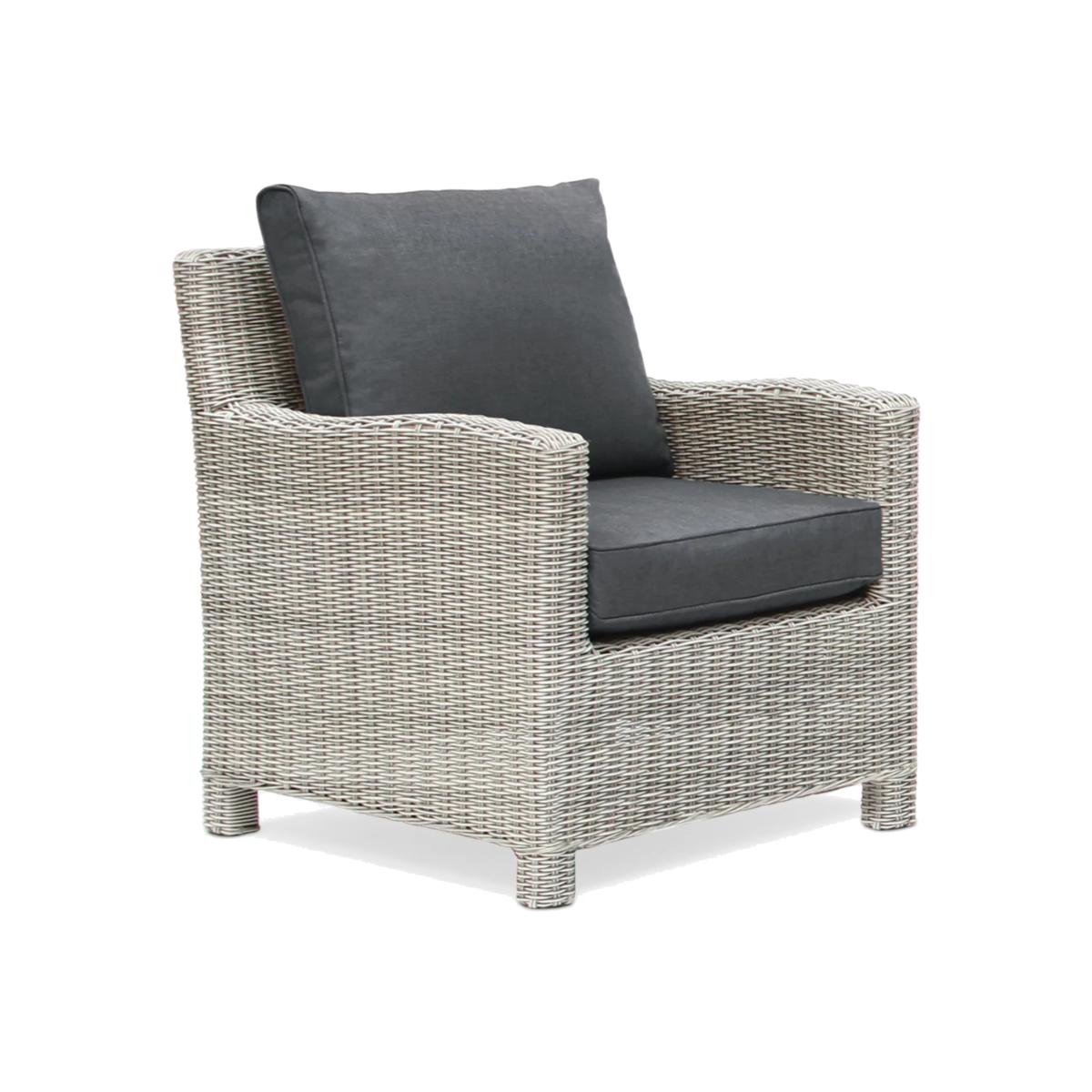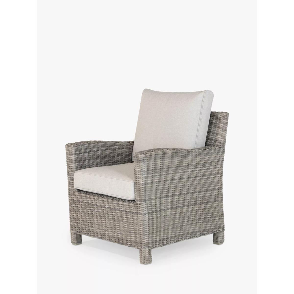 KETTLER Palma garden armchair for indoors or outdoors. Made with a strong aluminium frame, ergonomic design and 6mm half-round UV-resistant hand-woven synthetic wicker, a hard-wearing traditional rattan look. Made for comfort with weatherproof cushions that retain their shape thanks to the double piping and 8cm foam core seat. The armchair can be left outdoors all year round but bring the cushions in during inclement weather and over winter. Key features: Garden armchair Traditional-style handwoven synthetic wicker Weatherproof, rustproof and UV-resistant Lightweight yet robust aluminium frame Weatherproof double-piped cushions and 8cm foam core seat cushion Easy to maintain Match with other furniture in the Palma range Durable and weatherproof Built to last, the armchair is made with a lightweight yet sturdy aluminium frame and handwoven synthetic wicker with a 6mm half-round weave. The armchair is weatherproof, rustproof and UV-resistant, so it can remain outdoors all year round without it fading or cracking. Low maintenance The armchair needs just an annual clean with mild soapy water (without abrasive solvents). The cushions are sponge-clean only. If you wish to cover your furniture, a breathable cover can be used but make sure the furniture is dry before pulling it over the top. Soft and comfortable cushions The armchair comes with soft, comfortable cushions that are weatherproof and retain their shape thanks to double piping and the 8cm foam core seat cushion. Bring them inside when not in use.