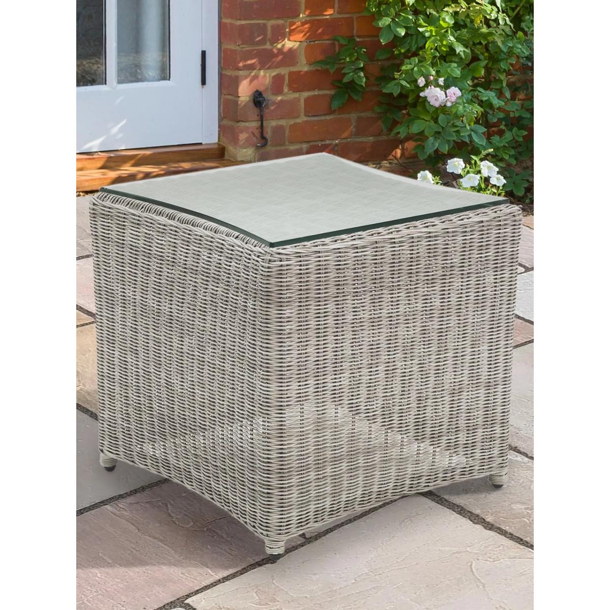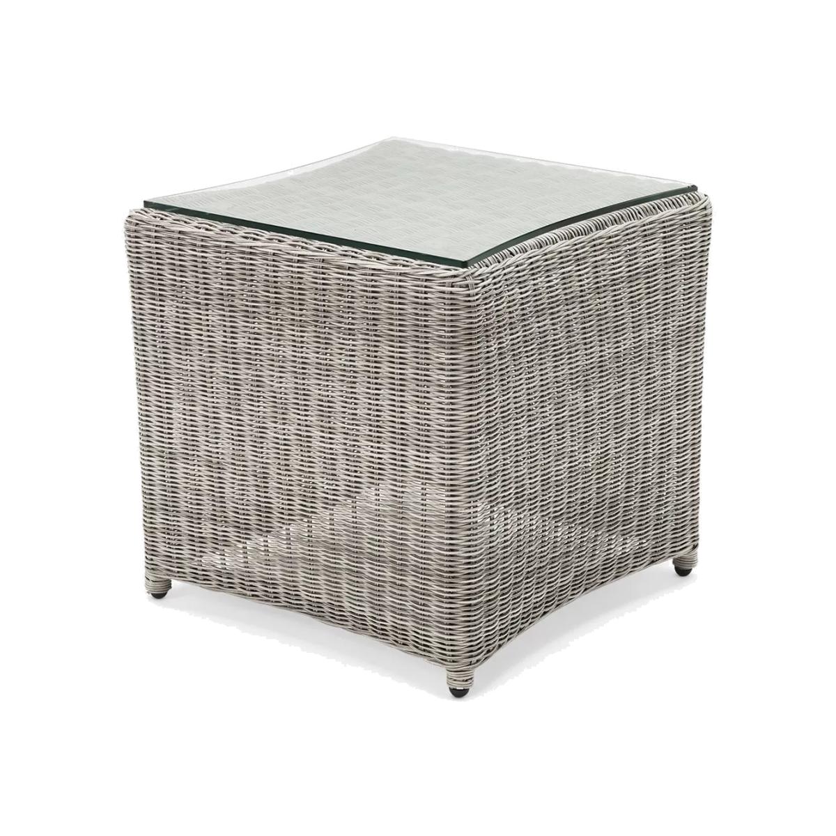 KETTLER Palma glass top side table made with a strong aluminium frame and 6mm half-round UV-resistant hand-woven synthetic wicker, a hard-wearing traditional rattan look. The table can be left outdoors all year round and has a 5mm toughened glass top. Key features: Square garden side table Traditional-style handwoven synthetic wicker Weatherproof, rustproof and UV-resistant Lightweight yet robust aluminium frame 5mm toughened glass top Easy to maintain Match with other furniture in the Palma range Durable and weatherproof Built to last, the table is made with a lightweight yet sturdy aluminium frame and handwoven synthetic wicker with a 6mm half-round weave. It's weatherproof, rustproof and UV-resistant, so it can remain outdoors all year round without fading or cracking. Low maintenance The table needs just an annual clean with mild soapy water (without abrasive solvents). If you wish to cover your furniture, a breathable cover can be used but make sure the furniture is dry before pulling it over the top.
