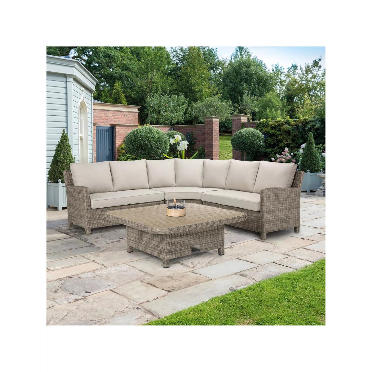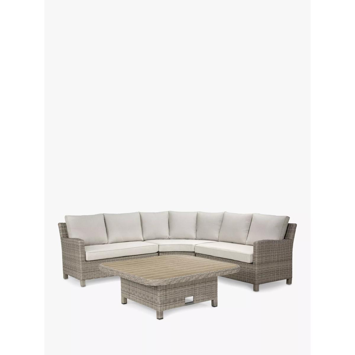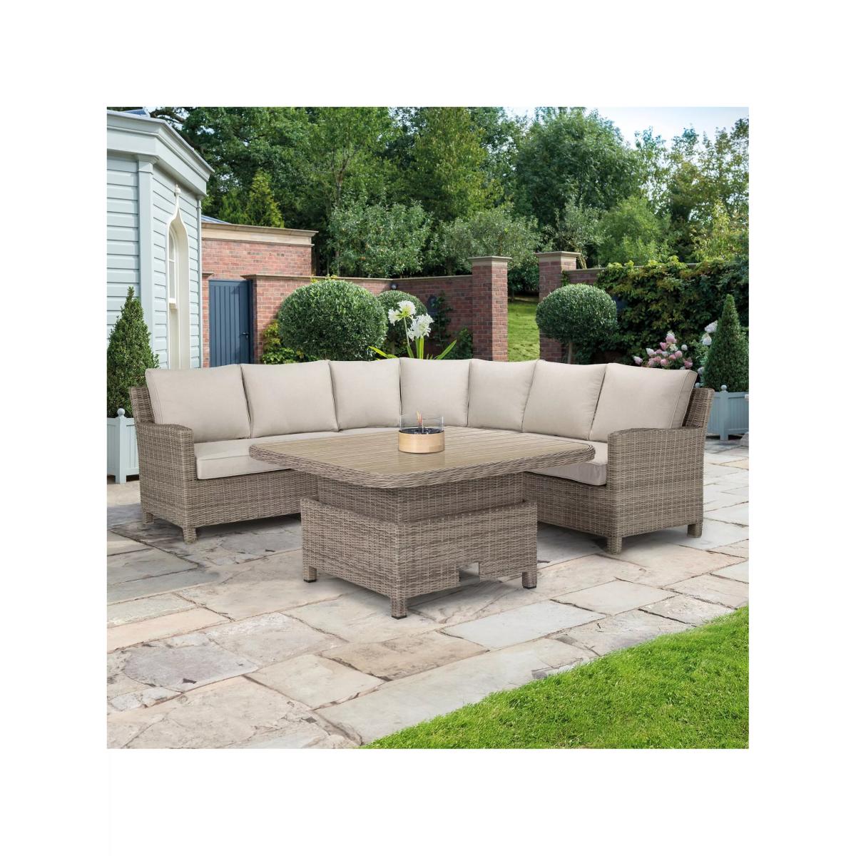 This Palma Grande set is the largest of the KETTLER range of wicker corner sets, seating up to ten people. The versatile design means that you can dine or lounge on this set, indoors or outdoors. The set includes a corner sofa and a square slatted aluminium top high-low table. The table perfectly follows the curved shape of the seating and is height-adjustable to go from a coffee table to a casual dining table. Made with strong aluminium frames and extra supports on the sofa, along with 6mm half-round UV-resistant hand-woven synthetic wicker, a hard-wearing traditional rattan look. Made for comfort with weatherproof cushions that retain their shape thanks to the 8cm foam core and double piping. The set can be left outdoors all year round but bring the cushions in during inclement weather and over winter. Key features: Corner garden sofa seats up to 10 people Height-adjustable square garden coffee table with slatted aluminium top Traditional-style handwoven synthetic wicker Weatherproof, rustproof and UV-resistant Lightweight yet robust aluminium frames Double piped cushions and 8cm foam core seat cushions Soft, weatherproof cushions Easy to maintain Match with other furniture in the Palma range Durable and weatherproof Built to last, the set is made with lightweight yet sturdy powder-coated aluminium frames and handwoven synthetic wicker with a 6mm half-round weave. The set is weatherproof, rustproof and UV-resistant, so it can remain outdoors all year round without it fading or cracking. Low maintenance The set needs just an annual clean with mild soapy water (without abrasive solvents). The cushions are sponge-clean only. If you wish to cover your furniture, a breathable cover can be used but make sure the furniture is dry before pulling it over the top. Soft and comfortable cushions The set comes with soft, comfortable cushions that are weatherproof and retain their shape thanks to the 8cm foam core and double piping. Bring them inside when not in use.
