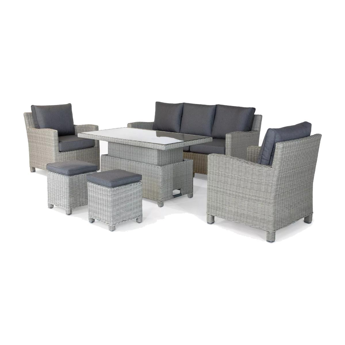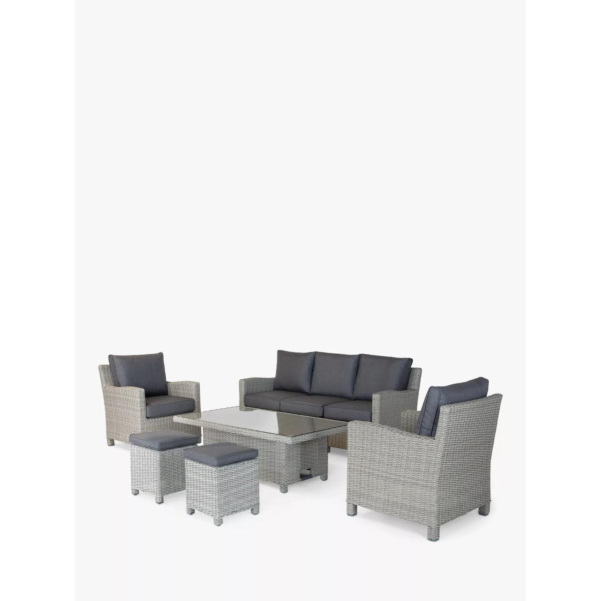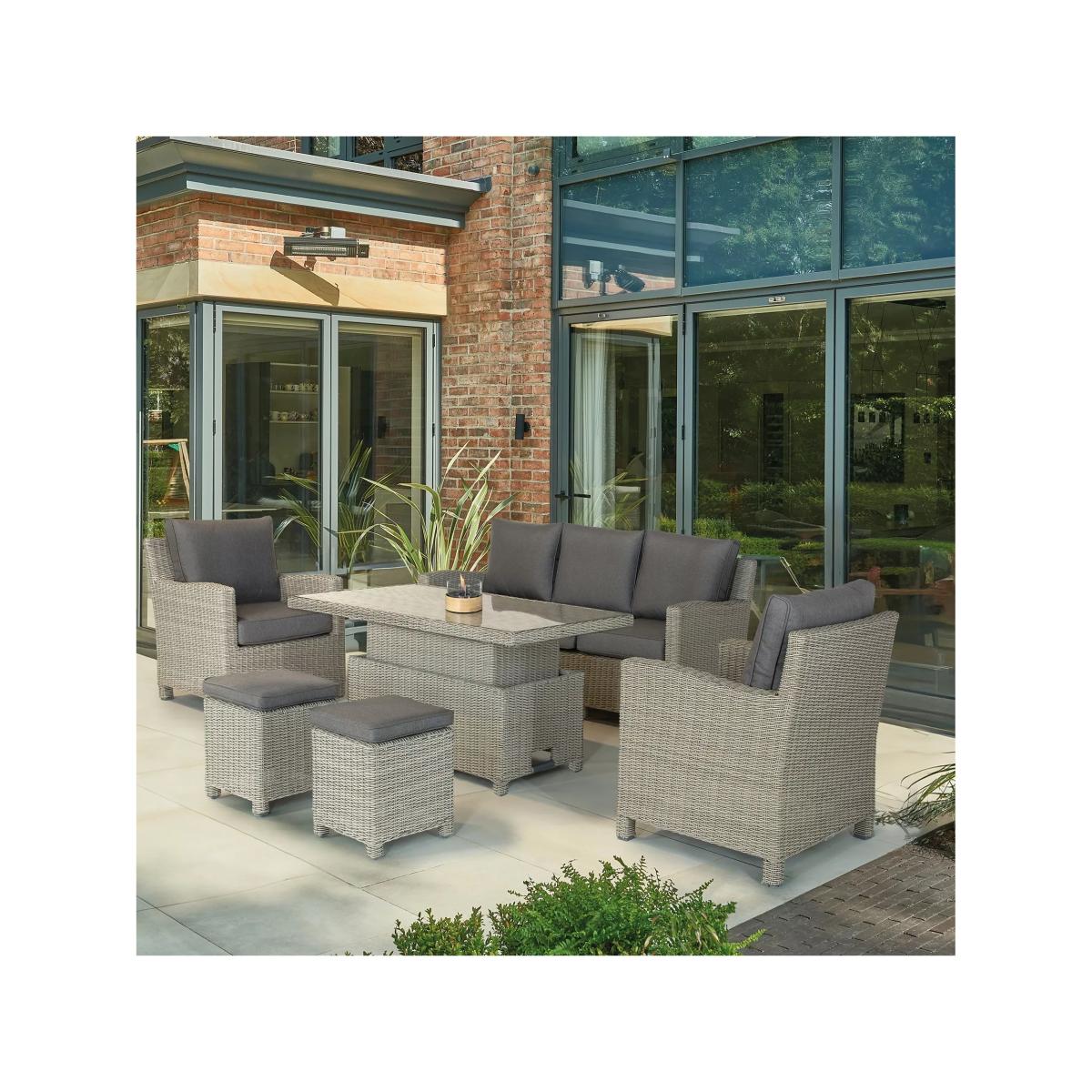 Roomy Palma Signature Sofa set with a three-seater sofa and two matching lounge chairs, along with two stools and a rectangular glass-top table that adjusts in height to take the set from relaxed lounging to casual dining. With style and durability at the heart of the design, KETTLER's Palma outdoor furniture is made of weatherproof synthetic wicker with a 6mm half-round weave on powder-coated aluminium frames, creating a hard-wearing traditional rattan look. Key features: Three-seater sofa, two lounge chairs, two stools Adjustable height rectangular table with glass top Traditional-style handwoven synthetic wicker Weatherproof, rustproof and UV-resistant Lightweight yet robust aluminium frames Double piped back cushions and 8cm foam core seat cushions Soft, weatherproof cushions Easy to maintain Match with other furniture in the Palma range Durable and weatherproof Built to last, the set is made with lightweight yet sturdy powder-coated aluminium frames and handwoven synthetic wicker with a 6mm half-round weave. The set is weatherproof, rustproof and UV-resistant, so it can remain outdoors all year round without fading or cracking. Low maintenance The set needs just an annual clean with mild soapy water (without abrasive solvents). The cushions are sponge-clean only. If you wish to cover your furniture, a breathable cover can be used but make sure the furniture is dry before pulling it over the top. Soft and comfortable cushions The set comes with soft, comfortable cushions that are weatherproof and retain their shape thanks to the 8cm foam core seat cushions and double piping. Bring them inside when not in use.