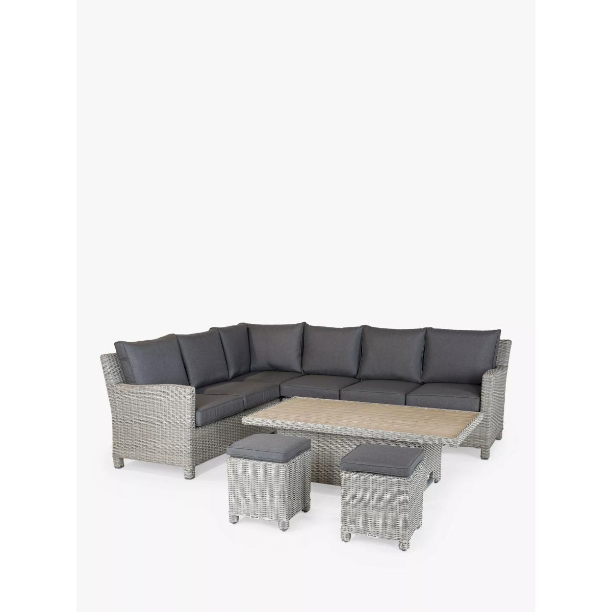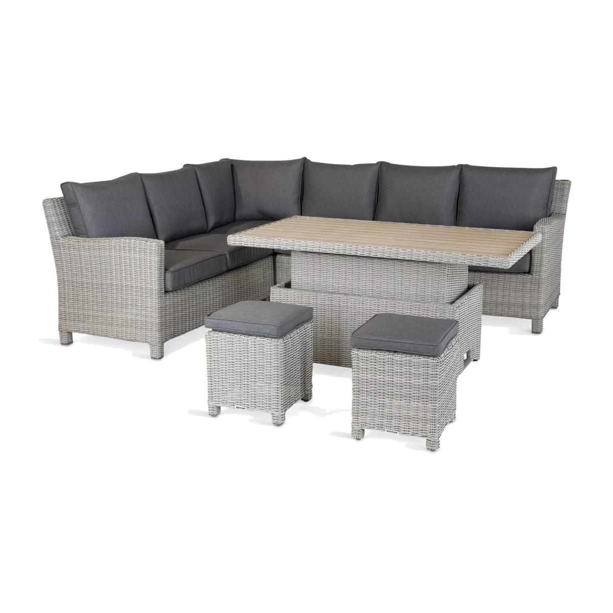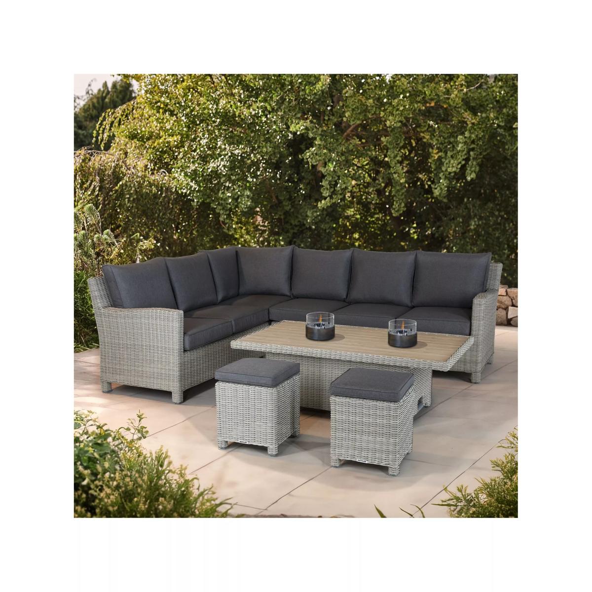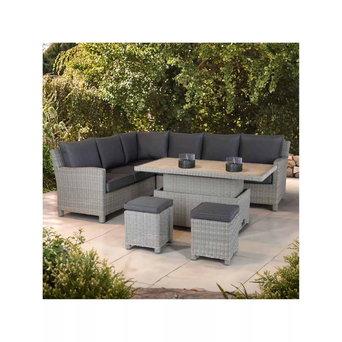 Palma corner set from KETTLER, seating up to seven people. The versatile design means that you can dine or lounge on this set, indoors or outdoors. The set includes a corner sofa, two stools and a rectangular slatted aluminium top high-low table. The table is height-adjustable to go from a coffee table to a casual dining table. Made with strong aluminium frames, along with 6mm UV-resistant hand-woven synthetic wicker, a hard-wearing traditional rattan look. Made for comfort with weatherproof cushions that retain their shape thanks to the 8cm foam core seat cushions and double piping. The set can be left outdoors all year round but bring the cushions in during inclement weather and over winter. Key features: Standard corner garden sofa seats up to five people; two garden stools Height-adjustable rectangular garden coffee table with slatted aluminium top Traditional-style handwoven synthetic wicker Weatherproof, rustproof and UV-resistant Lightweight yet robust aluminium frames Double piped cushions and 8cm foam core seat cushions Soft, weatherproof cushions Easy to maintain Match with other furniture in the Palma range Durable and weatherproof Built to last, the set is made with lightweight yet sturdy powder-coated aluminium frames and handwoven synthetic wicker with a 6mm weave. The set is weatherproof, rustproof and UV-resistant, so it can remain outdoors all year round without it fading or cracking. Low maintenance The set needs just an annual clean with mild soapy water (without abrasive solvents). The cushions are sponge-clean only. If you wish to cover your furniture, a breathable cover can be used but make sure the furniture is dry before pulling it over the top. Soft and comfortable cushions The set comes with soft, comfortable cushions that are weatherproof and retain their shape thanks to the 8cm foam core seat cushions and double piping. Bring them inside when not in use.