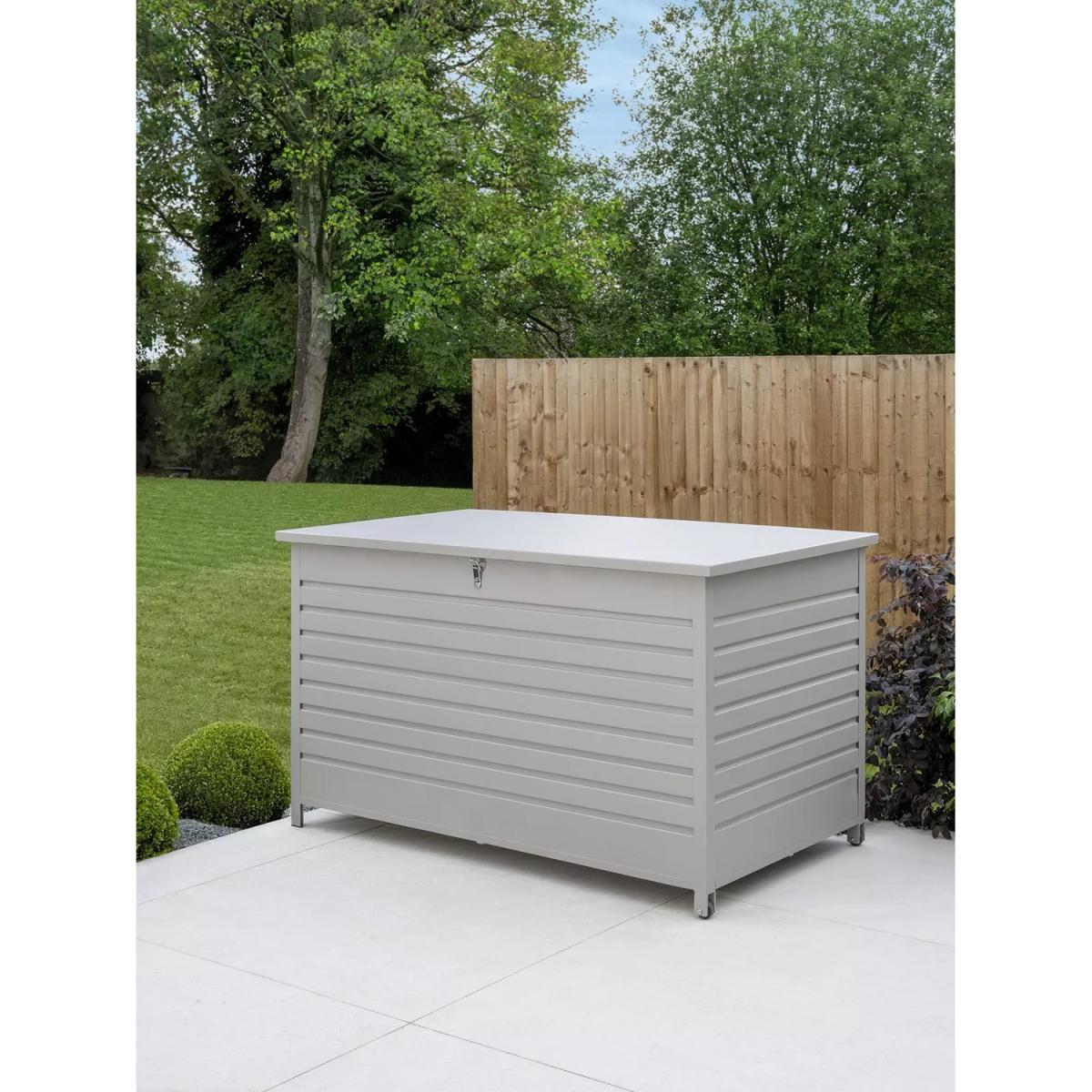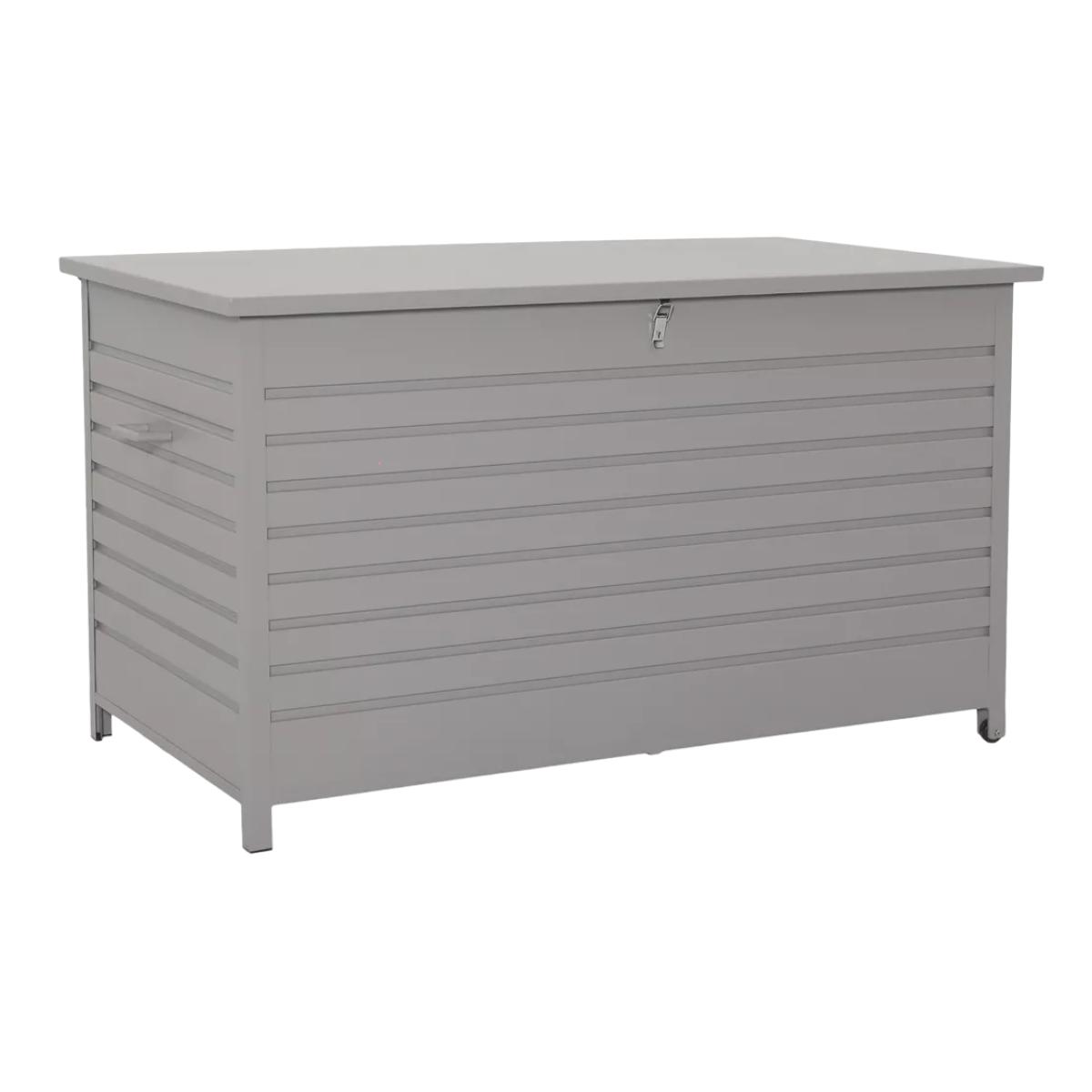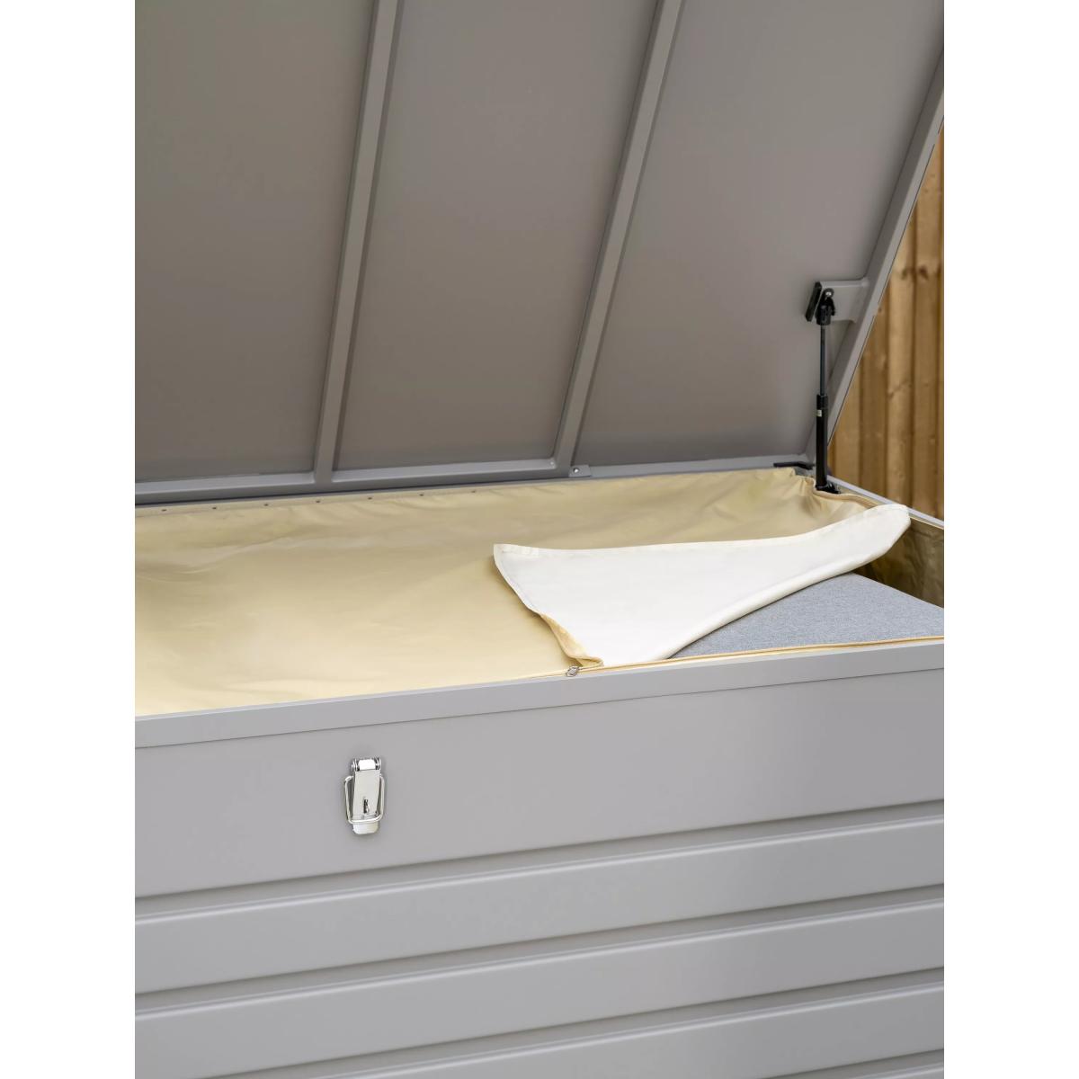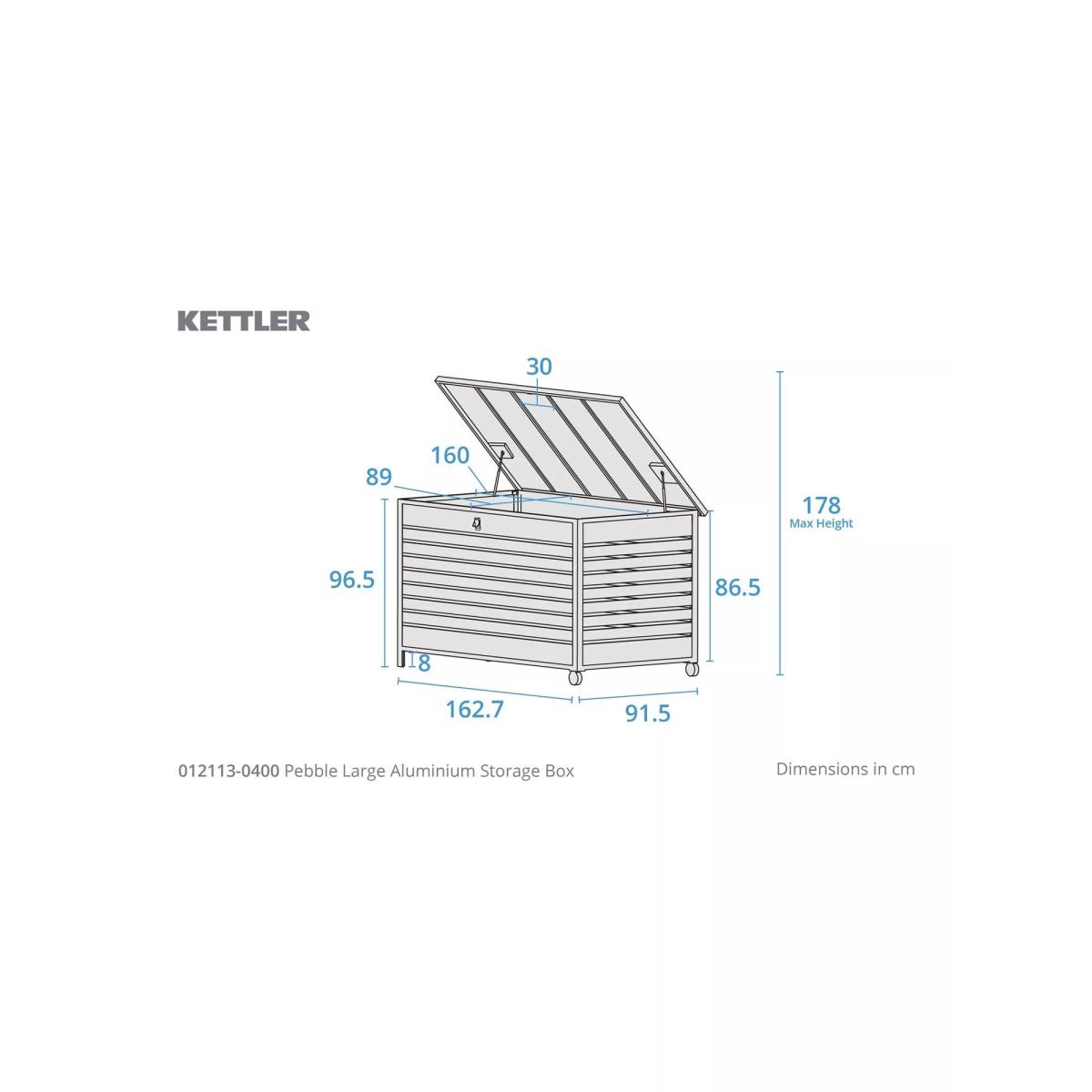Large aluminium garden storage box from KETTLER, a universal design making it suitable as a standalone item or to match KETTLER garden furniture. It has a waterproof liner and accommodates cushions from any of the standard KETTLER Palma sets. Comes with a lockable fastener for use with your own padlock. Hydraulic hinges make it easy to open and close, and there are wheels and handles for convenience. Strong yet lightweight aluminium Waterproof liner to protect cushions Lockable fastener Hydraulic hinges Wheels and handles for manoeuvrability