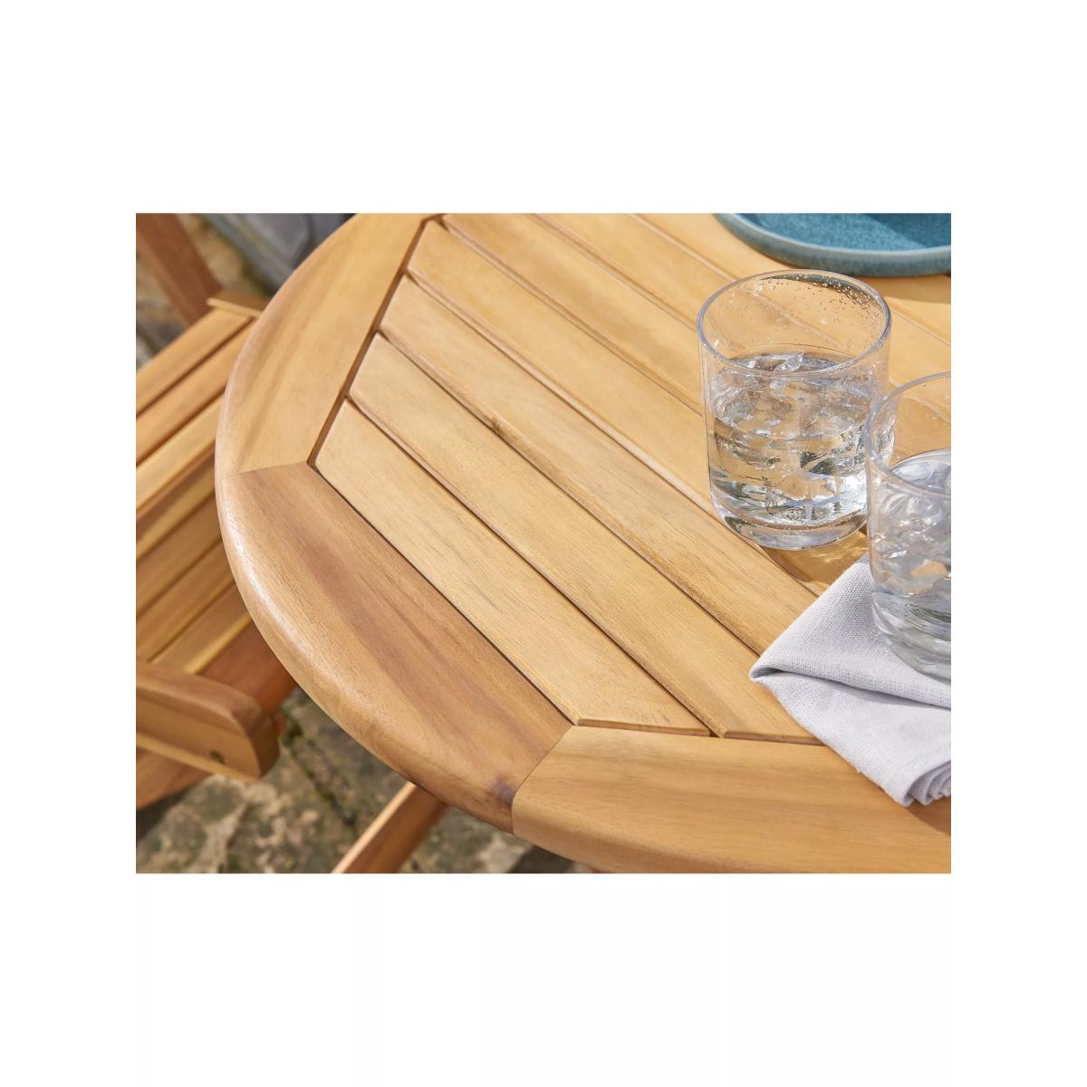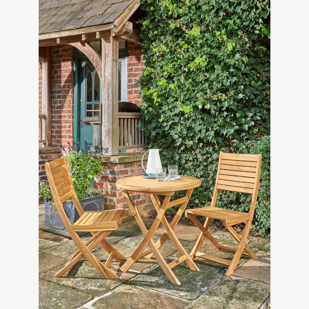 This high-quality eucalyptus wood Chelsea table and chairs set would look right at home in an RHS show garden. Designed in a classic bistro style, the set is naturally durable and made from weather-resistant, FSC-certified eucalyptus wood following best practices for forest management. A teak oil coating adds a protective layer. Royal Horticultural Society branding has been etched into the wood. The set folds away for easy storage. Choose the perfect outdoor furniture We have a selection of wooden furniture for you to choose from which will suit the home or garden. Below are a few options to consider when choosing your perfect outdoor furniture. Teak (Best)A premium and popular wood with an attractive appearance which ages beautifully. Strong, durable and resistant to rot and decay, this furniture requires little maintenanceEucalyptus (Better)Distinctive scent and appearance which darkens as it ages. Provides similar natural benefits to teak including moisture resistance, hardness and durability. It's plentiful in supply which makes the furniture an inexpensive choice. This wood can be treated to have a different appearance, like our Islay range Karri Gum (Eucalyptus)An extremely strong and stable premium eucalyptus timber ideal for outdoor furniture use. Through the multi-stage timber processing, the timber is completely cured with no risk of leeching. Due to the high density and tight grain of the timber it is highly resistant to cracking and splitting Acacia (Good)Naturally durable, this wood is incredibly hard and is unlikely to suffer damage during everyday use. It provides similar natural benefits to teak, yet unlike many other hardwoods, acacia is also relatively fast growing which minimises the environmental impact.