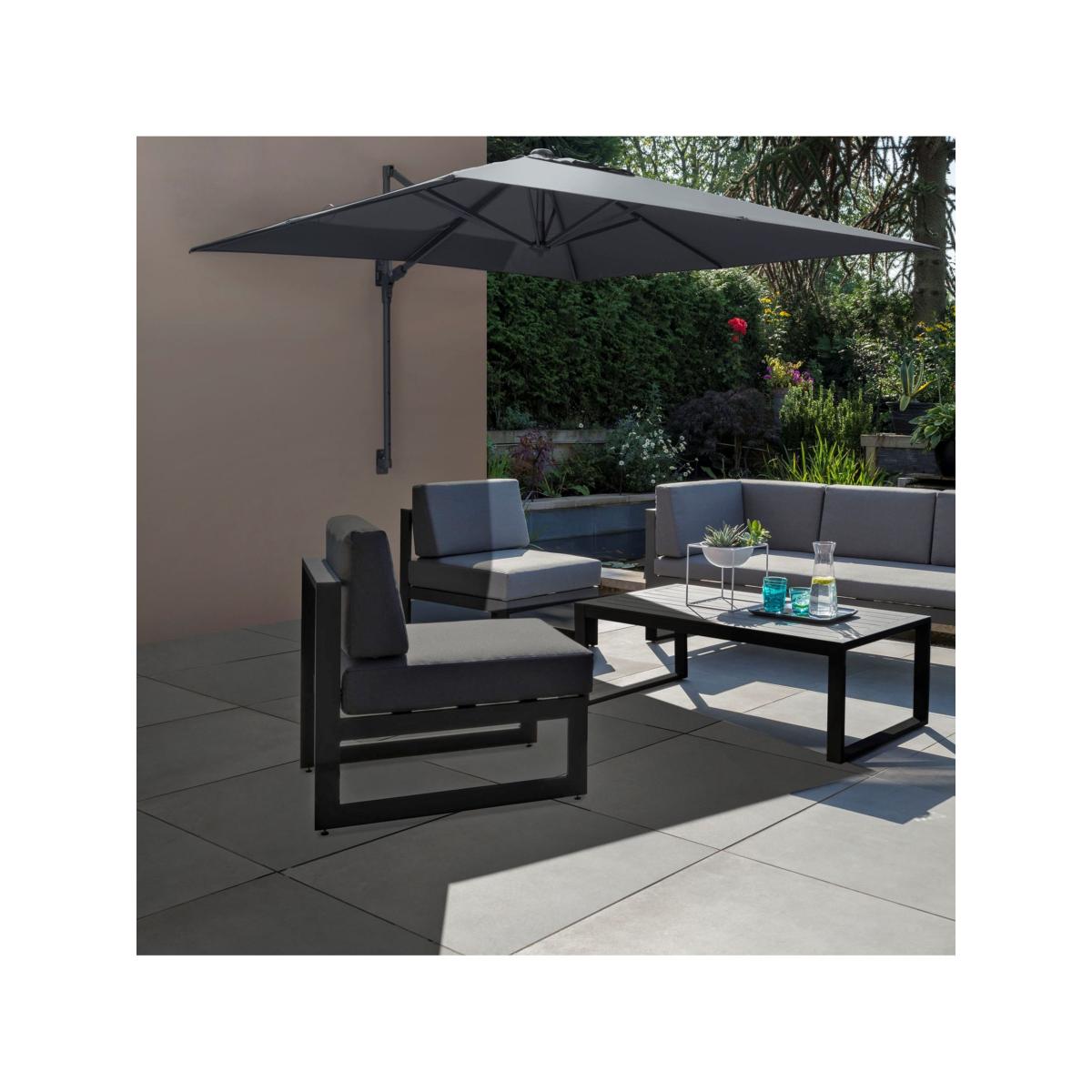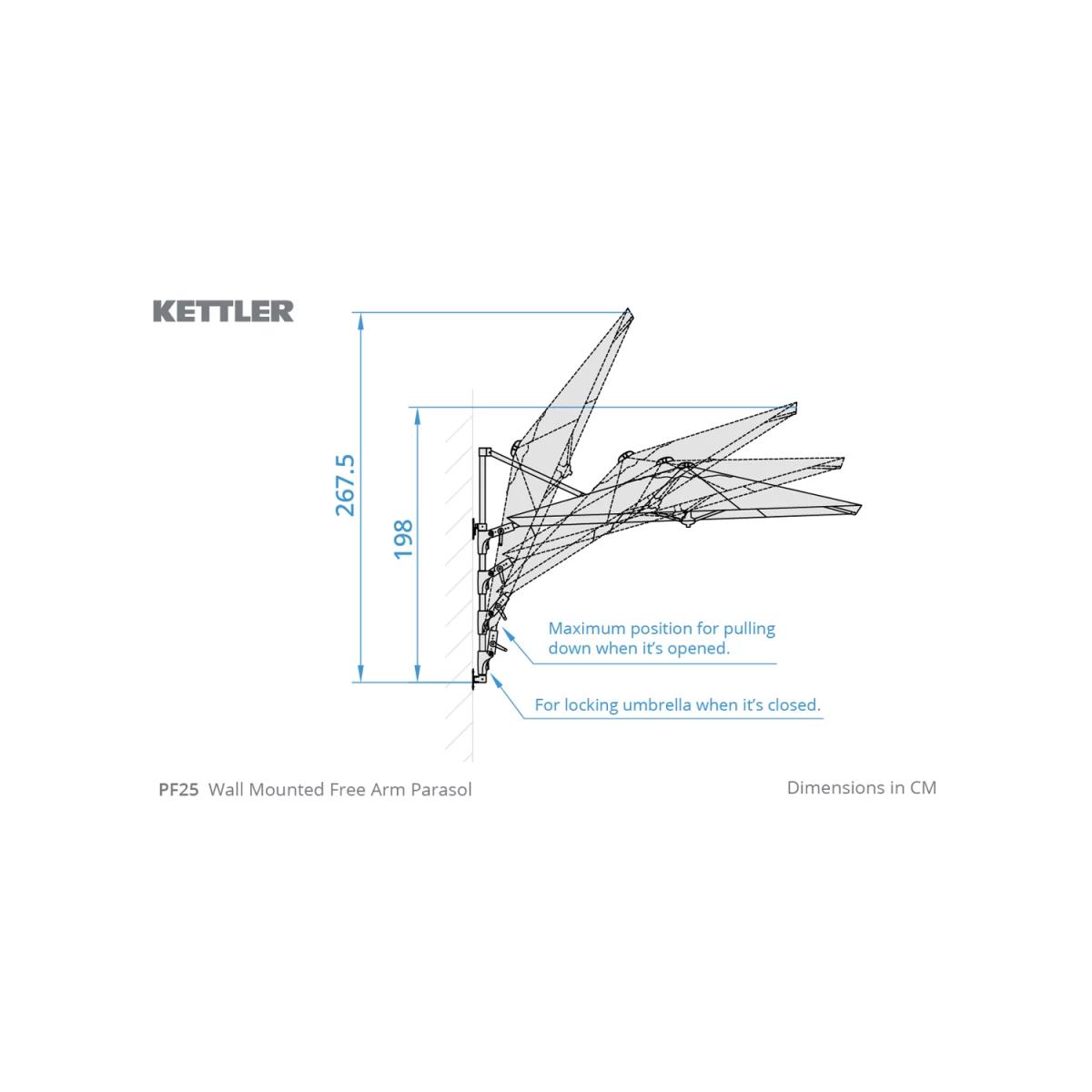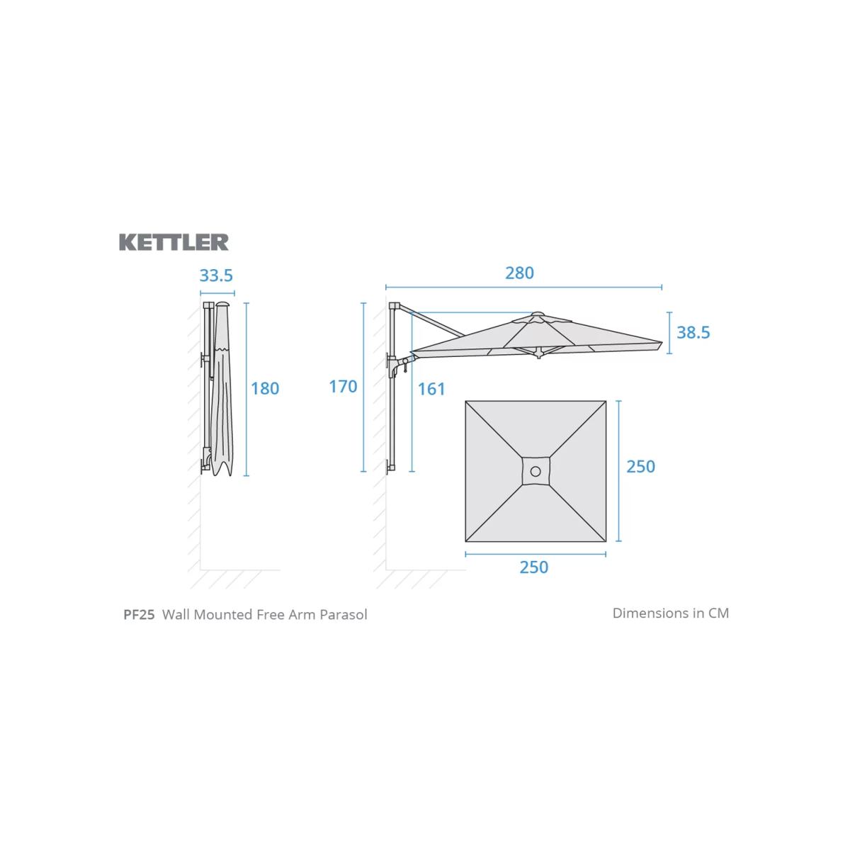 The KETTLER 2.5m wall mounted parasol is ideal when space is limited. With a smooth cantilever mechanism, the parasol is fitted with an easy wind handle and smooth tilt function. Made with a high-quality aluminium frame, designed to be lightweight yet robust. The canopy boasts UV50+ sun protection - ideal for keeping diners protected from harmful rays while the shower resistant fabric protects during a light shower.