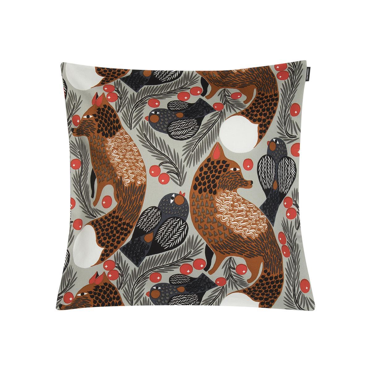 Chic and graphical, the collection of Marimekko fabrics brightens up your interior! Expressive and colourful, the wonderful Ketunmarja motif shows foxes and birds which have, in the twilight, slipped onto the branches of a yew with red berries. Created in 1951, Marimekko is a state of mind, a way of life based on creativity, freedom of spirit and inventiveness. Its fame dates back to 1960, when Jackie Kennedy made several public appearances in Marimekko dresses. From that moment, the brand was immensely successful, and still is, with a range of clothing and decorative accessories in bright colours, for an inspired house! PLEASE NOTE: Cushion cover sold on its own (without padding).