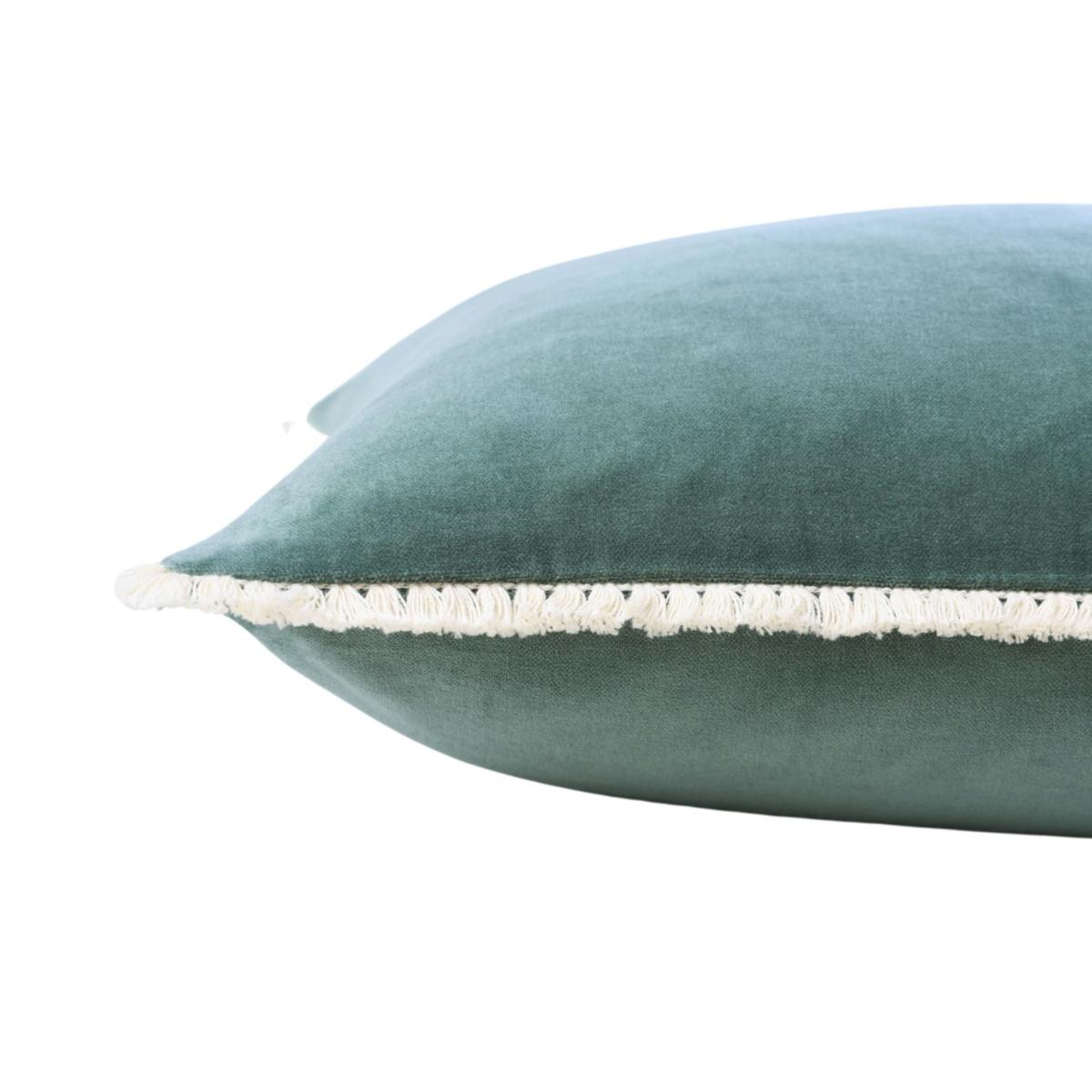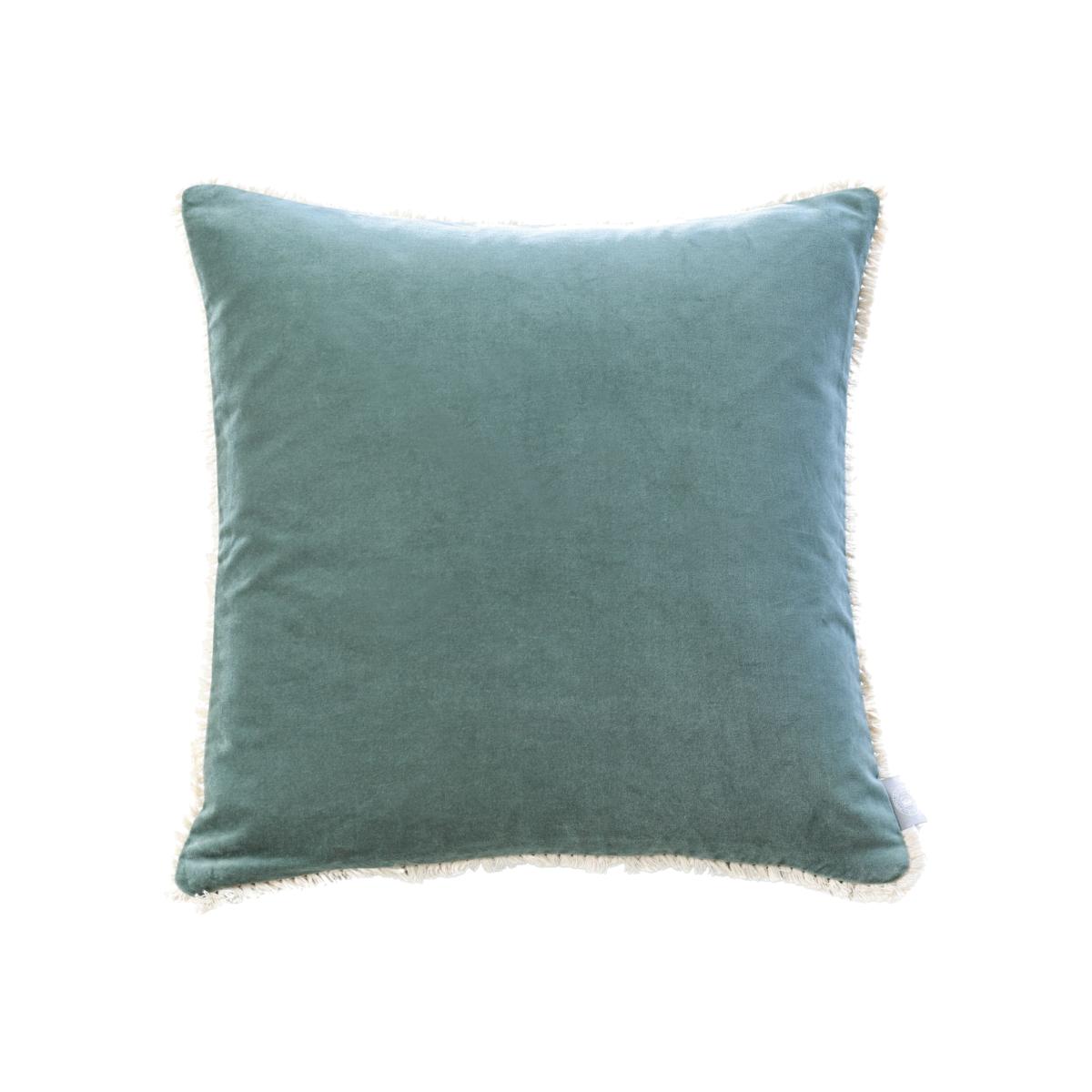 This timeless collection of  statement cushions form an exquisite home textile range that exudes an effortless sense of sophisticated style and grandeur. Front & Reverse: Green cotton velvet with neutral fringe details. Feather filled