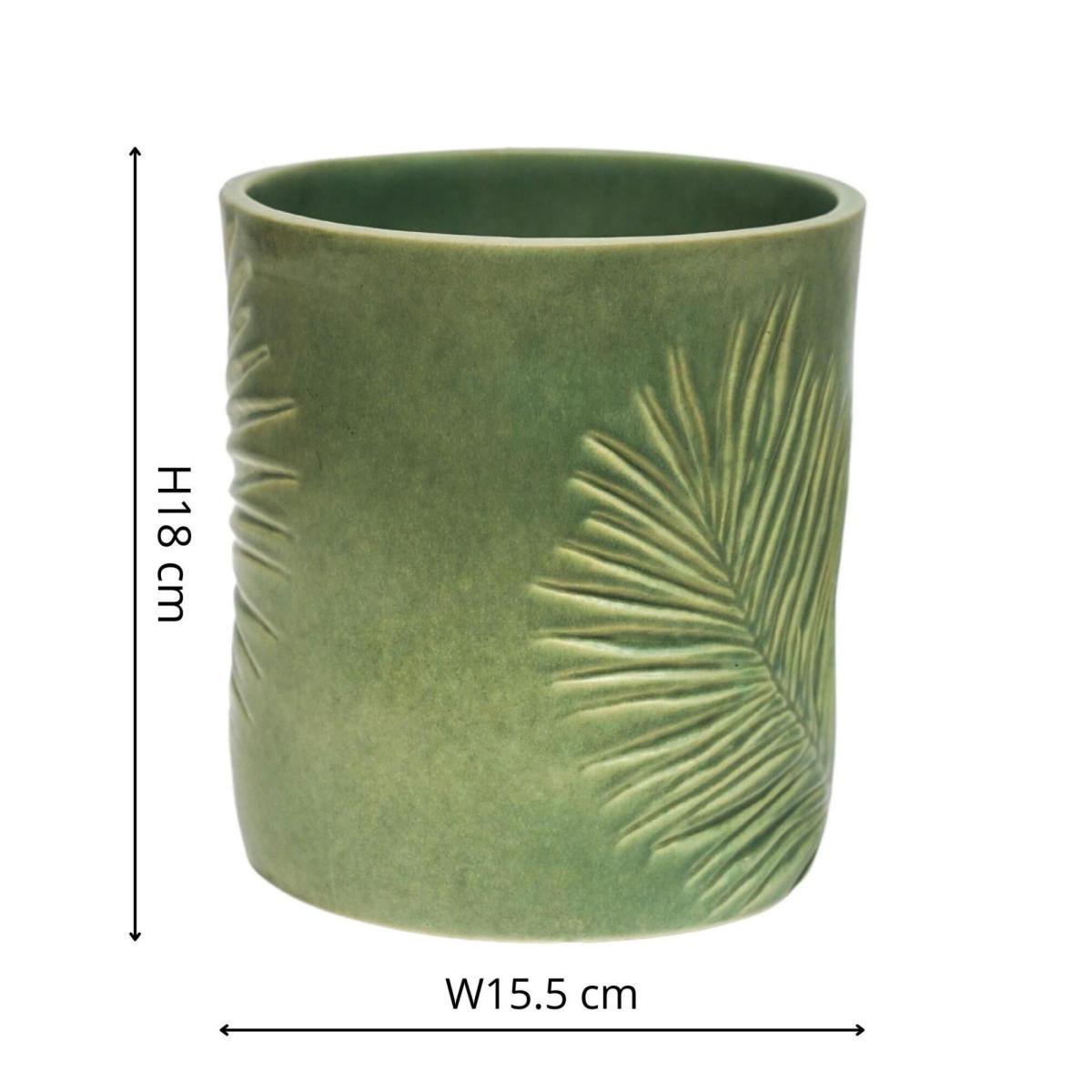 * Indoor Planter * Elegant Leaf design* Available in a 18cm diameter* Durable Composition* Corresponding Bowl Planter available Handcrafted in Southern Europe, the Kew Stoneware Sago Palm Planter in ivory offers a timeless leaf design. With a durable stoneware composition and a reactive glaze finish, this 18cm planter adapts effortlessly to any decor, leaving a lasting impression.