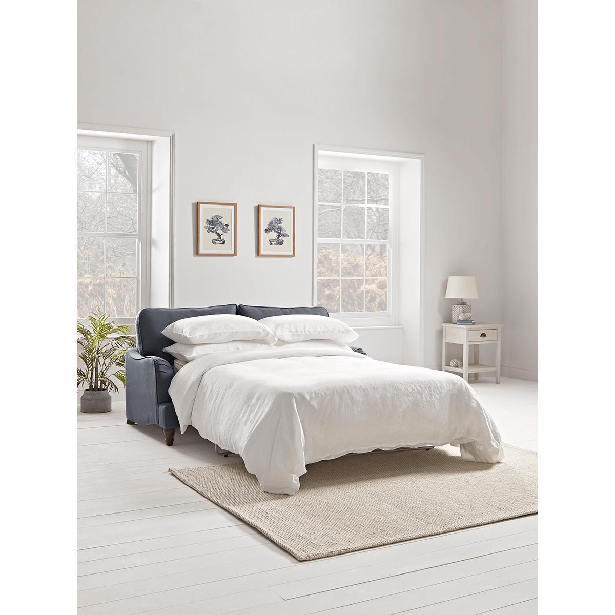 Our Kew Three Seater Sofa Bed showcases the very best in New England refinement, yet simultaneously delivers an inviting, homely feel. Low, undulating arms, hand-applied folds, piping detail and solid oak legs give this piece a classic look, ideal for enhancing spaces with a soft spot for traditional living room styling. Our. Kew range. Can be upholstered in a choice of 11 distinctive shades and two fabrics to suit your style; an. Armchair. And a. Three seater sofa. Are also available. Linen Blend. The classic choice for well designed, handcrafted furniture, a highly durable yet elegant 60% cotton, 40% linen plain weave that showcases form with a wonderfully soft brushed finish. Easy Care Velvet. A highly durable polyester fabric despite its luxurious appearance, Easy Care Velvet is well suited to busy homes, it comes with an outstanding richness of tone and the familiar soft hand feel of velvet. Please note that we have introduced a new polyester velvet to our Custom Made collection which replaces the traditional cotton velvet from our old range. To read more about the qualities of our new fabric, and how it might differ from items previously purchased from the old collection, please refer to our. Upholstery FAQs. For further information on the range, please select one of the following:. Order a fabric swatch. Read our Upholstery FAQs. View our full Upholstery Terms and Conditions.