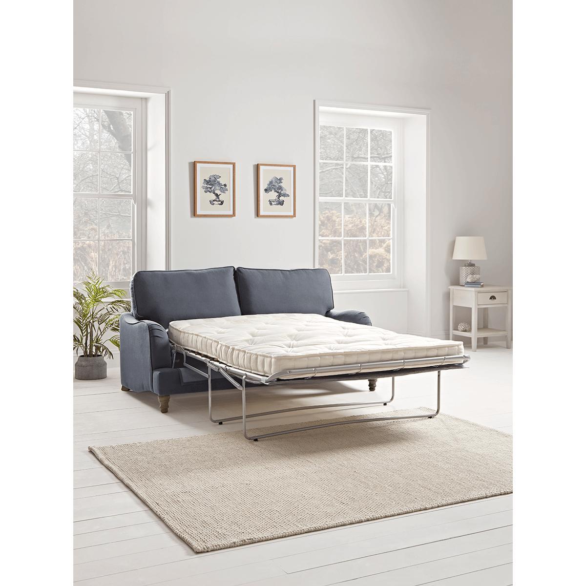 Our Kew Three Seater Sofa Bed showcases the very best in New England refinement, yet simultaneously delivers an inviting, homely feel. Low, undulating arms, hand-applied folds, piping detail and solid oak legs give this piece a classic look, ideal for enhancing spaces with a soft spot for traditional living room styling. Our. Kew range. Can be upholstered in a choice of 11 distinctive shades and two fabrics to suit your style; an. Armchair. And a. Three seater sofa. Are also available. Linen Blend. The classic choice for well designed, handcrafted furniture, a highly durable yet elegant 60% cotton, 40% linen plain weave that showcases form with a wonderfully soft brushed finish. Easy Care Velvet. A highly durable polyester fabric despite its luxurious appearance, Easy Care Velvet is well suited to busy homes, it comes with an outstanding richness of tone and the familiar soft hand feel of velvet. Please note that we have introduced a new polyester velvet to our Custom Made collection which replaces the traditional cotton velvet from our old range. To read more about the qualities of our new fabric, and how it might differ from items previously purchased from the old collection, please refer to our. Upholstery FAQs. For further information on the range, please select one of the following:. Order a fabric swatch. Read our Upholstery FAQs. View our full Upholstery Terms and Conditions.