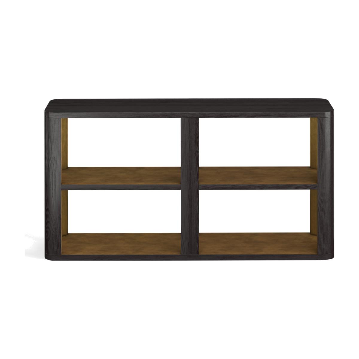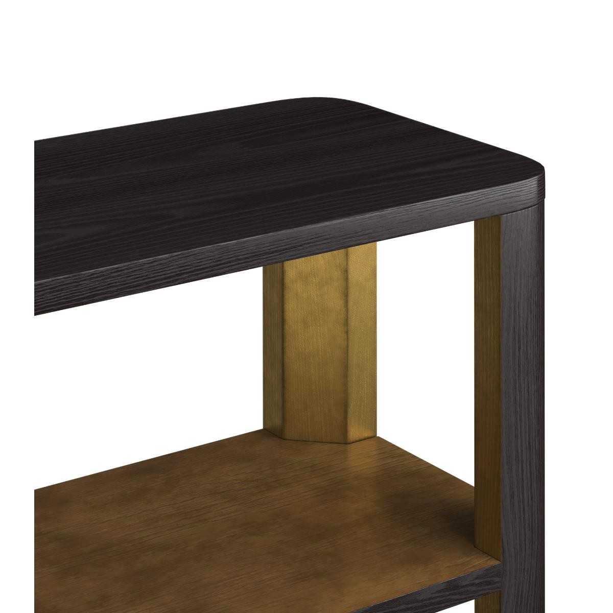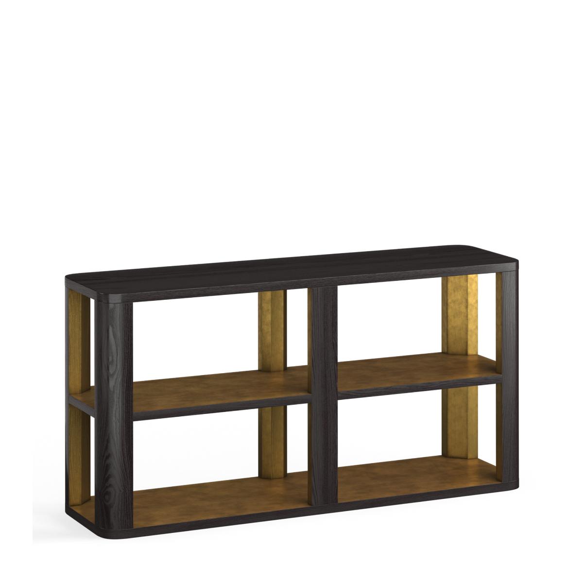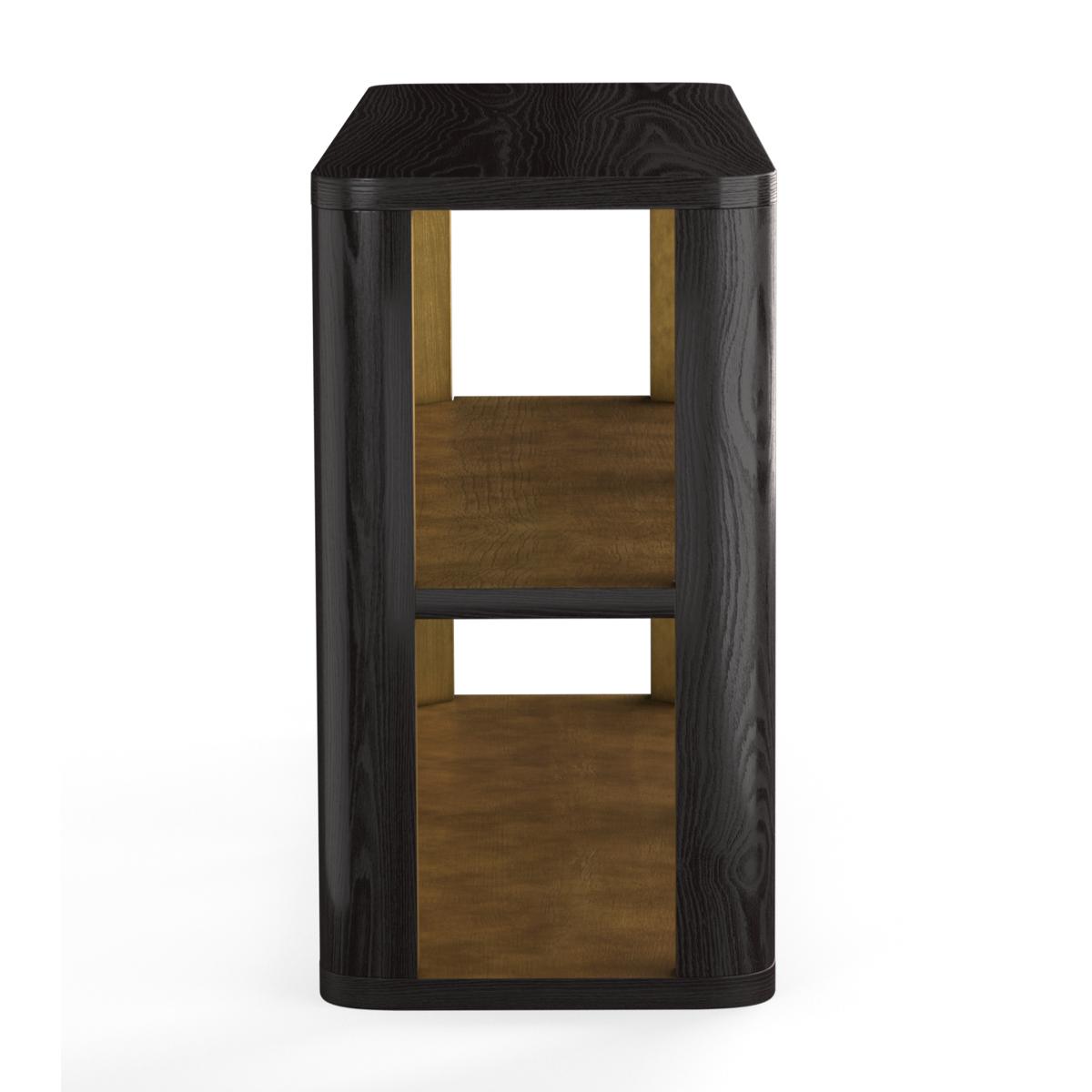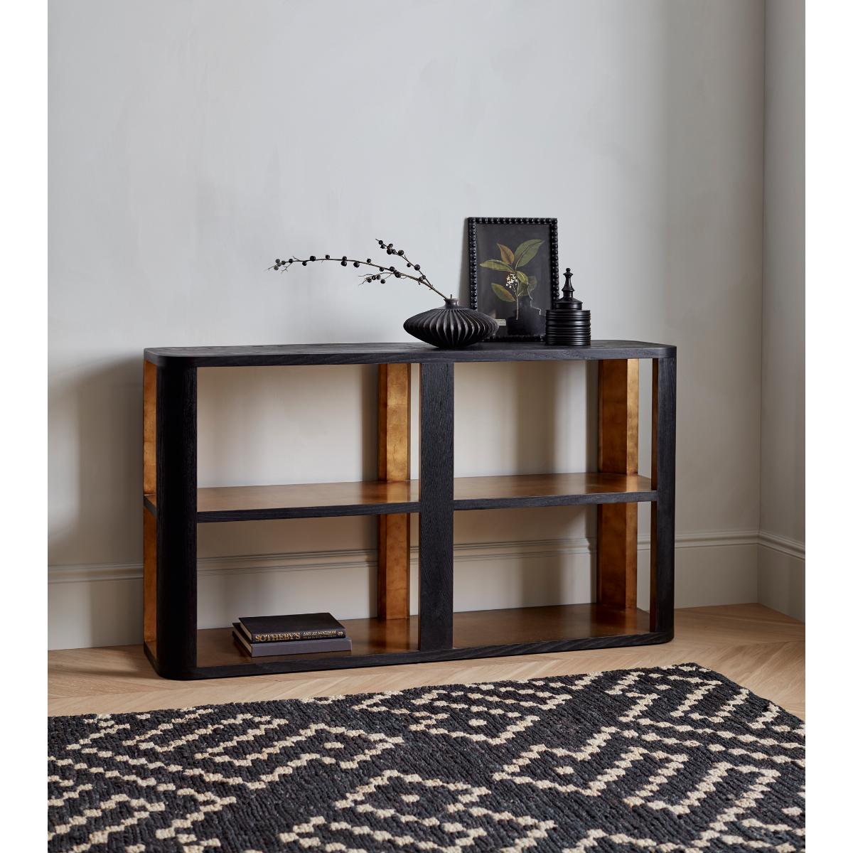 Displayed on the shelves of the Khafra Console Table, your curios will earn extra attention. The black-finished surface, which allows the natural wood grain to show, is offset by a hand-applied gold-leaf interior that sheds a warm glow on everything it holds. Intended to bring a dash of beauty to a room, while blending into the fabric of your everyday, don't be afraid to use this table to store your keys, letters and loose change alongside your decorative accessories.