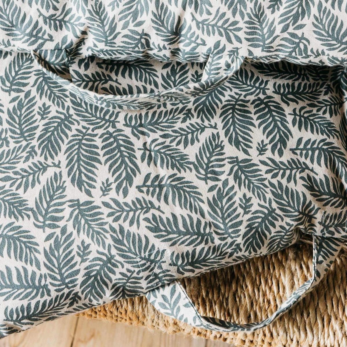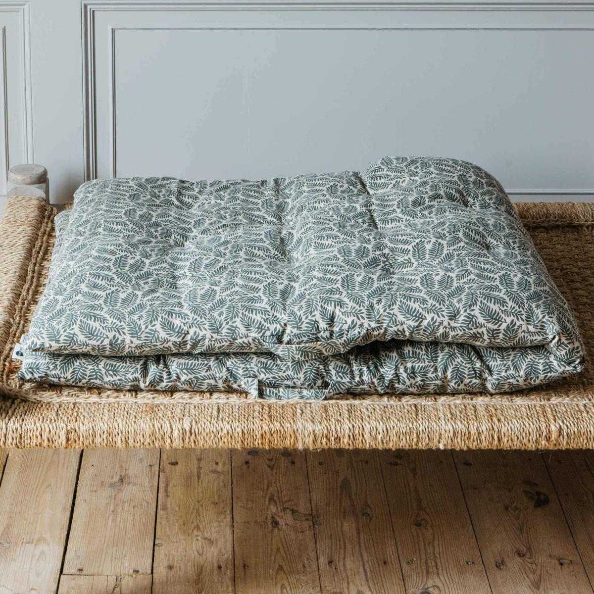 An extra-large retro padded mat with a contemporary fern design printed across and a striped reverse, ideal for a bohemian-inspired bedroom.