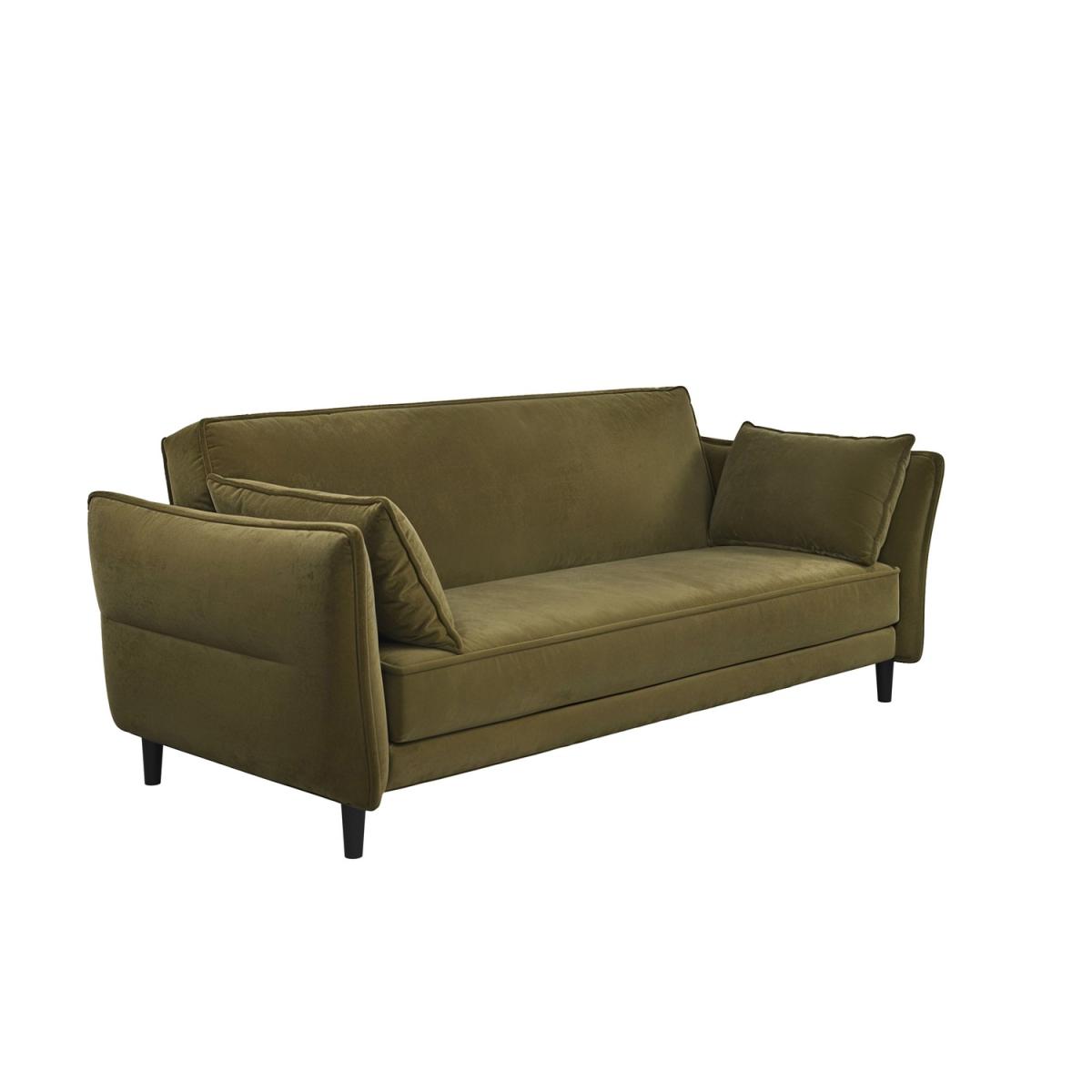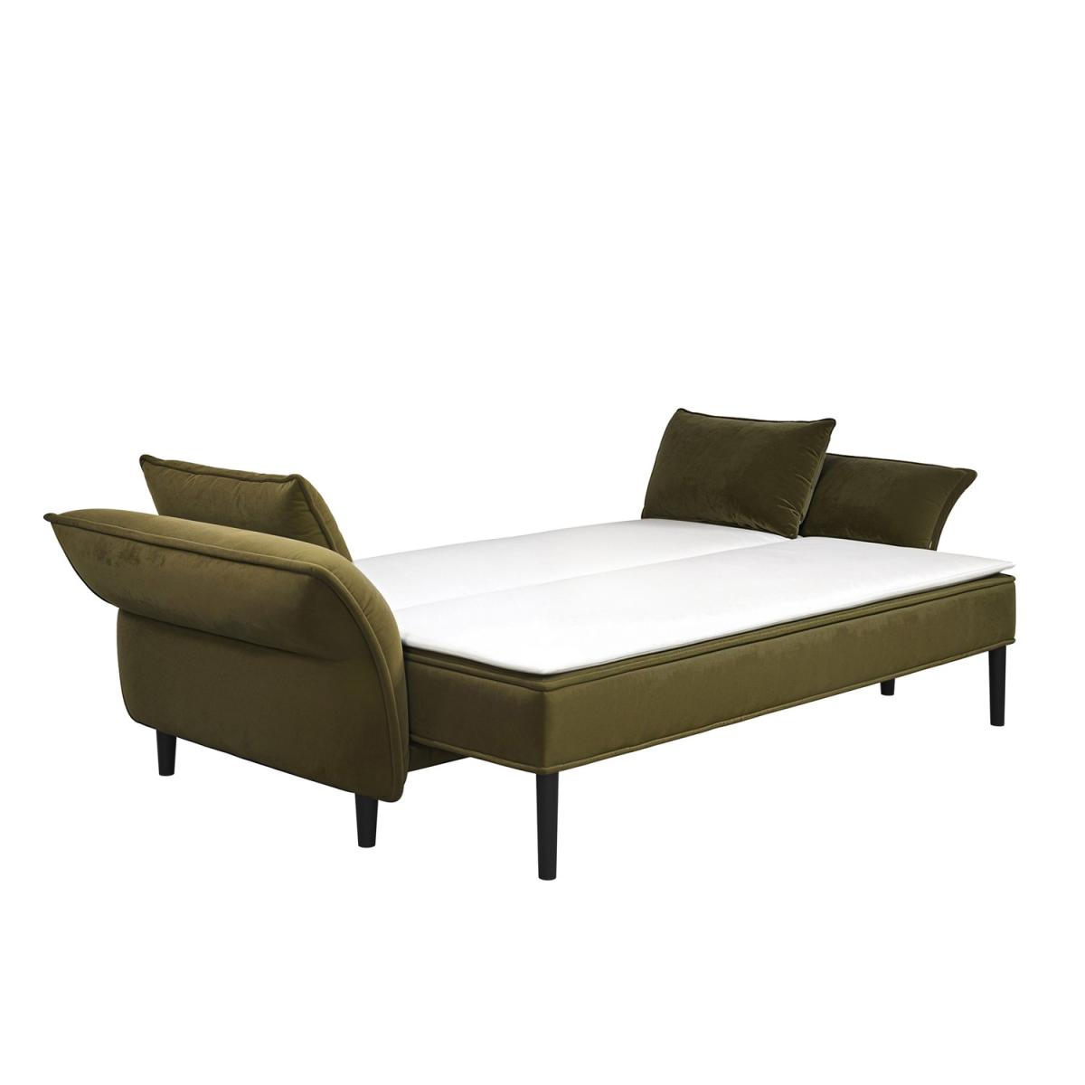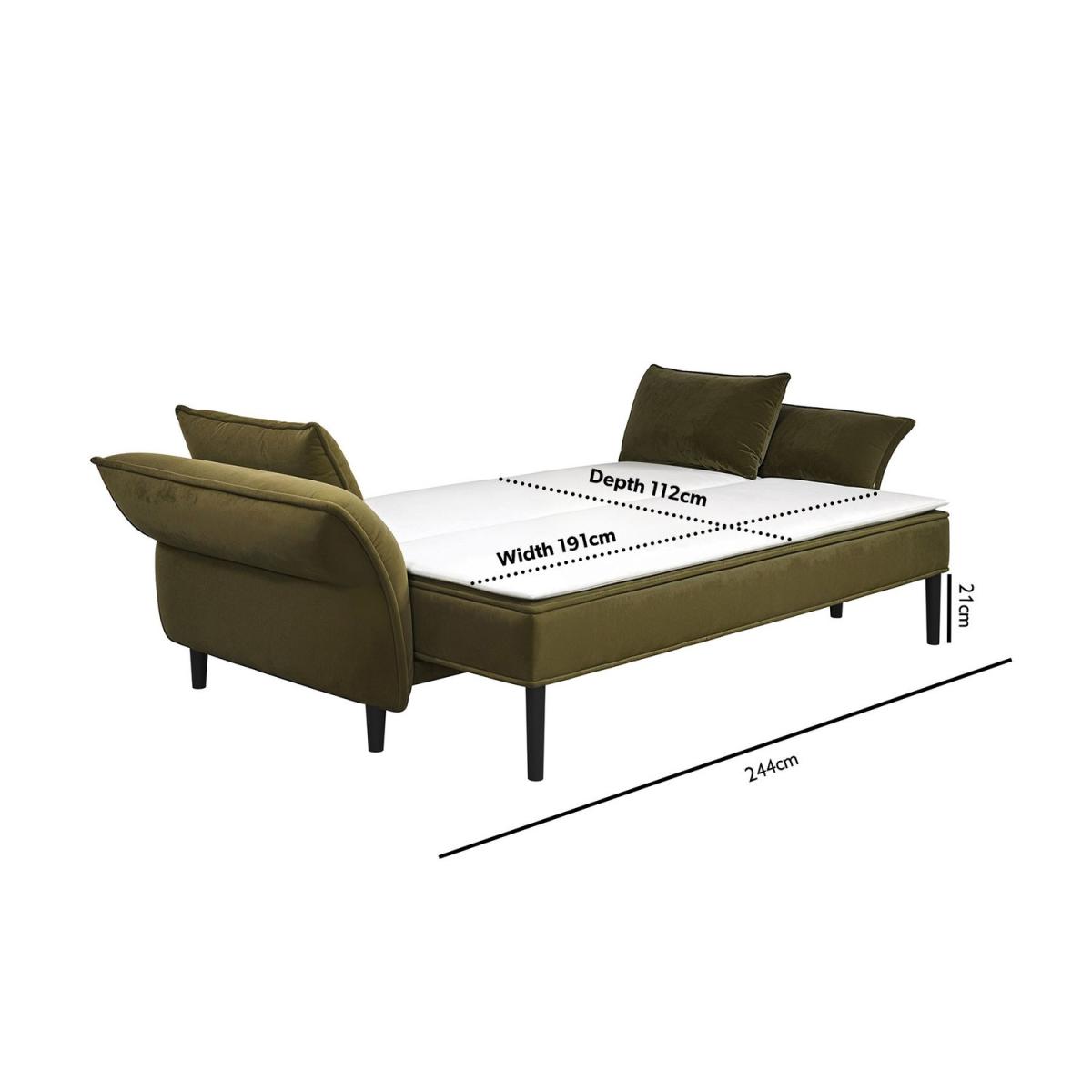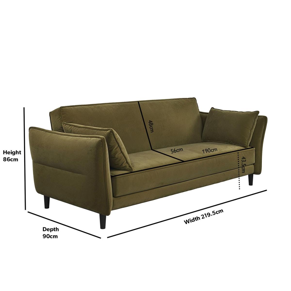 Foam filled Wrapped throughout in a calming Khaki Green velvet, this piece adds a warm and relaxing splash of colour and texture to any living space. Quickly transform from a cosy sofa to a spacious bed, ideal for overnight guests and small spaces. The arms fold out to provide a comfy headrest and ensure your guests can stretch out and relax A built-in mattress and plush cushioning provide cosy seating and ensure a restful sleep. Ideal for small apartments, guest rooms, or multipurpose spaces, offering seating and sleeping in one smart design. The Bobby Sofa Bed is perfect for overnight guests. It effortlessly transforms from a cosy 3-seater to a spacious double bed with a smooth click-clack mechanism. It features a fold-out foam layer to add to the comfort and ensure a great night's sleep. Its sleek silhouette is fully upholstered in a calming khaki green velvet, keeping it looking great wherever you choose to place it in the room. The armrests fold out to provide the perfect headrest and keep you comfy for a restful night’s sleep. Two matching scatter cushions are included to complete the look and add extra comfort.