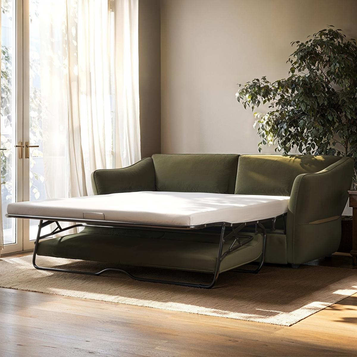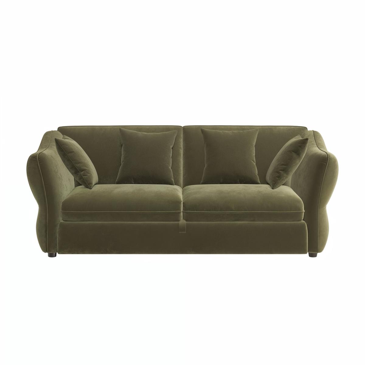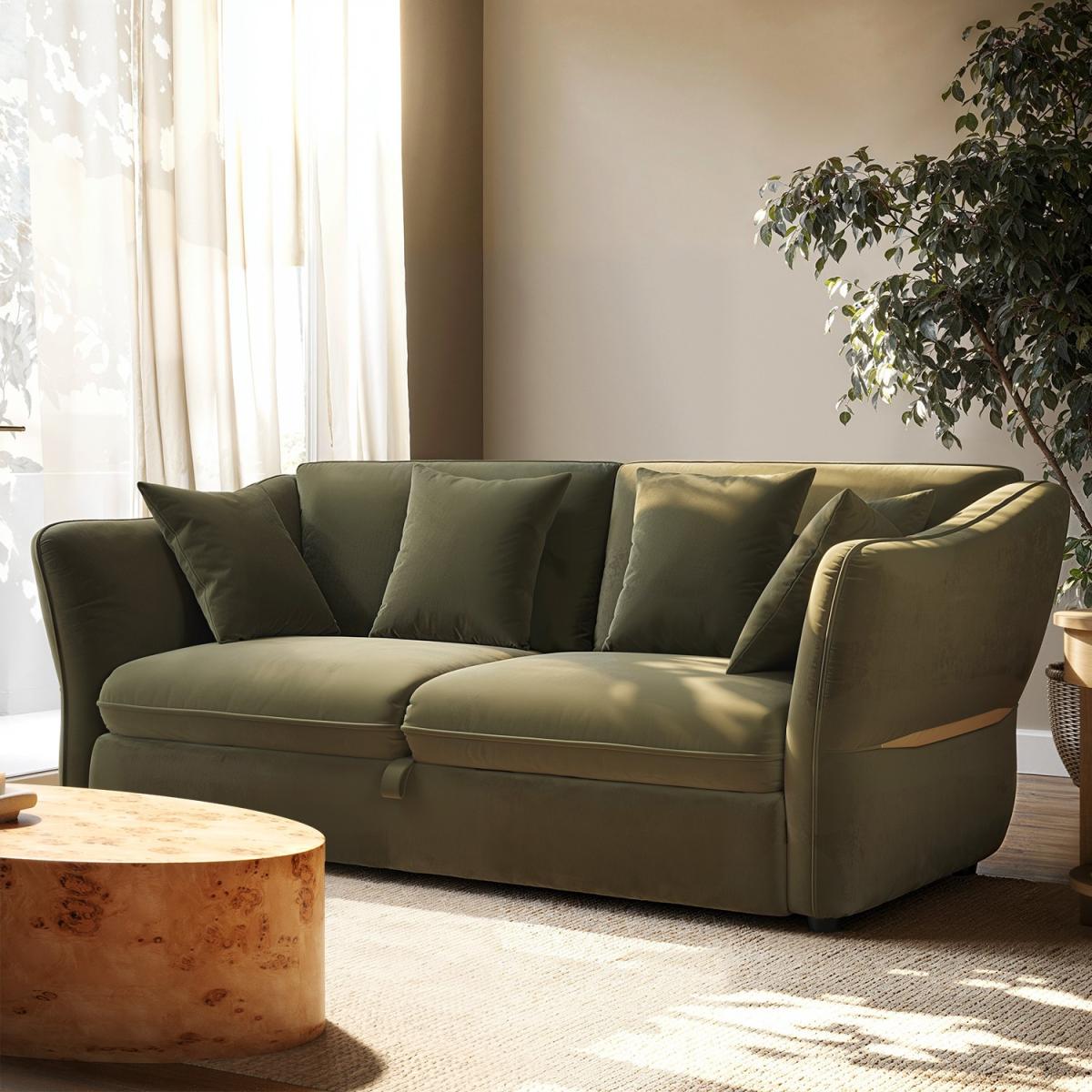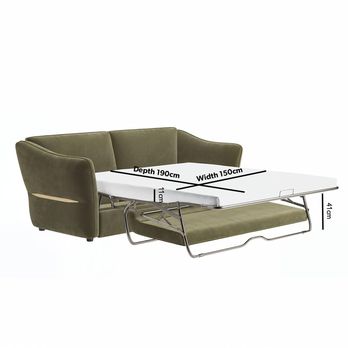 Foam filled The velvet upholstery and curved armrests give it a luxurious, sophisticated look that enhances any interior. Quickly transforms from a cosy sofa to a spacious bed with the simple pull-out mechanism, ideal for guests and small spaces. Carmela is upholstered throughout in a calming khaki green and features gold accents on the arms for a stunning look from any angle. A built-in mattress and plush cushioning provide cosy seating and ensure a restful sleep. Ideal for small apartments, guest rooms, or multipurpose spaces, offering seating and sleeping in one smart design. Add a touch of elegance to your home with the Carmela 3-Seater Sofa Bed. Its luxurious velvet upholstery, curved armrests, and plush cushions create a stylish and inviting look. It effortlessly transforms from a cosy 3-seater sofa into a spacious double bed with its pull-out mechanism, making it perfect for guests or everyday relaxation. The adjustable mattress angle ensures a great night’s sleep and provides ultimate comfort. It comes with four matching scatter cushions for added style and support. Crafted from a durable wooden sofa frame and a sturdy metal bed frame, it's built to last.