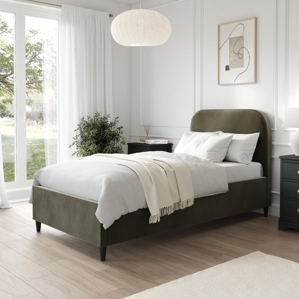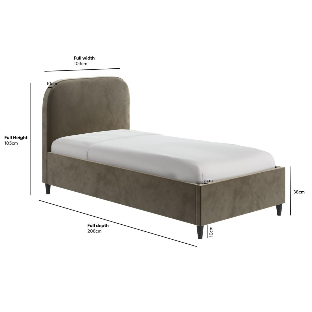 Adds a touch of sophistication and style to your bedroom. Provides strong support and stability while adding a touch of elegance to the overall design. Provides excellent support for the mattress, promoting airflow for added comfort and longevity. Soft, sumptuous velvet fabric in a versatile khaki green shade complements various interior styles. Crafted with a hardwood and metal internal frame for long-lasting durability. The Zara bed frame is perfect for lovers of minimalist style. This modern bed combines simplicity and comfort in one contemporary design. Featuring a thick padded headboard upholstered in luxurious, soft-to-touch khaki green velvet fabric and stylish tapered legs. Built with a sturdy wooden frame and a sprung-slatted base supported by central legs, this bed ensures long-lasting durability and stability. This bed fits a UK standard single-size mattress, which can be purchased with a 10% discount when bought with this bed - see our package deals below.