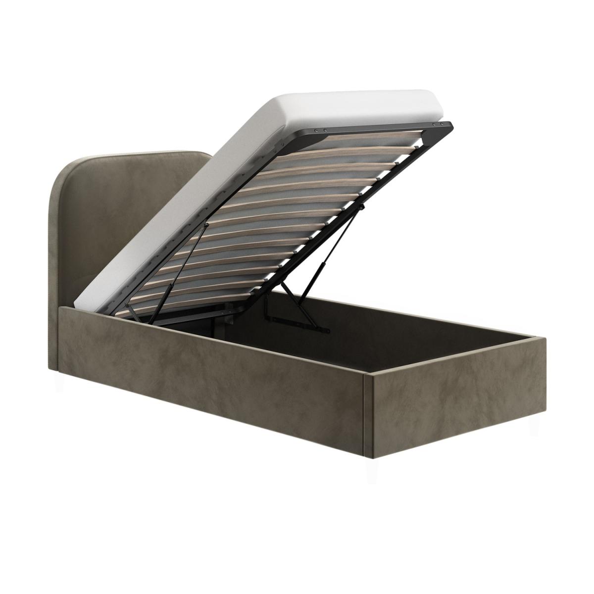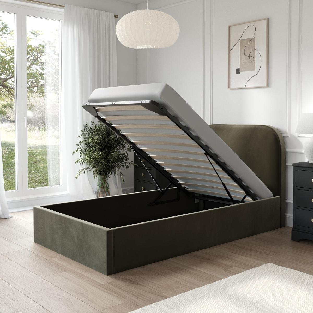 Adds a touch of sophistication and style to your bedroom. Convenient storage space accessible via a smooth gas-lift mechanism, ideal for bedding, pillows, or seasonal items. The storage compartment features a fabric-lined base, protecting stored items from dust and wear. Provides excellent support for the mattress, promoting airflow for added comfort and longevity. Soft, sumptuous velvet fabric in a versatile khaki green shade complements various interior styles. Ideal for maximising bedroom storage without compromising on style. The Zara ottoman bed frame is perfect for lovers of a minimalist style. This modern bed combines functionality and comfort in one contemporary design. Featuring a thick padded headboard upholstered in luxurious, soft-to-touch khaki green velvet fabric and easy-access ottoman storage for keeping clothes and bedding neatly tucked away. Built with a sturdy wooden frame and a sprung-slatted base supported by central legs, this bed ensures long-lasting durability and stability. This bed fits a UK standard single-size mattress, which can be purchased with a 10% discount when bought with this bed - see our package deals below.