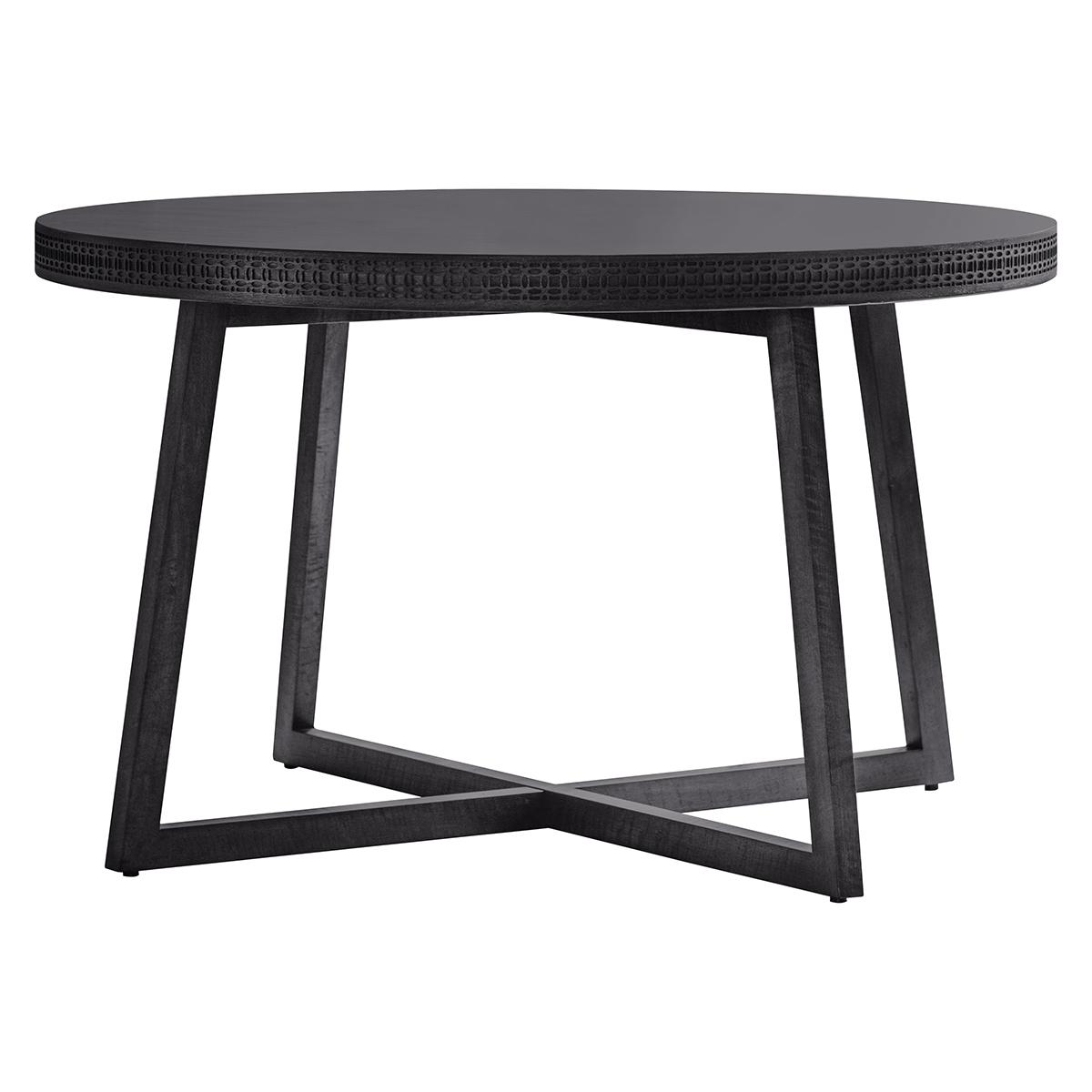 The Boho Boutique Round Dining Table is made using Mango solids with mixed timber veneers of Teak-Mahogany-Mindy Ash and Mango which give contrast and make the inlaid pattern stand out. It has a stunning mat black charcoal finish – the different grains in the mixed timbers stand out in the light and catch your eye with this beautiful detail.