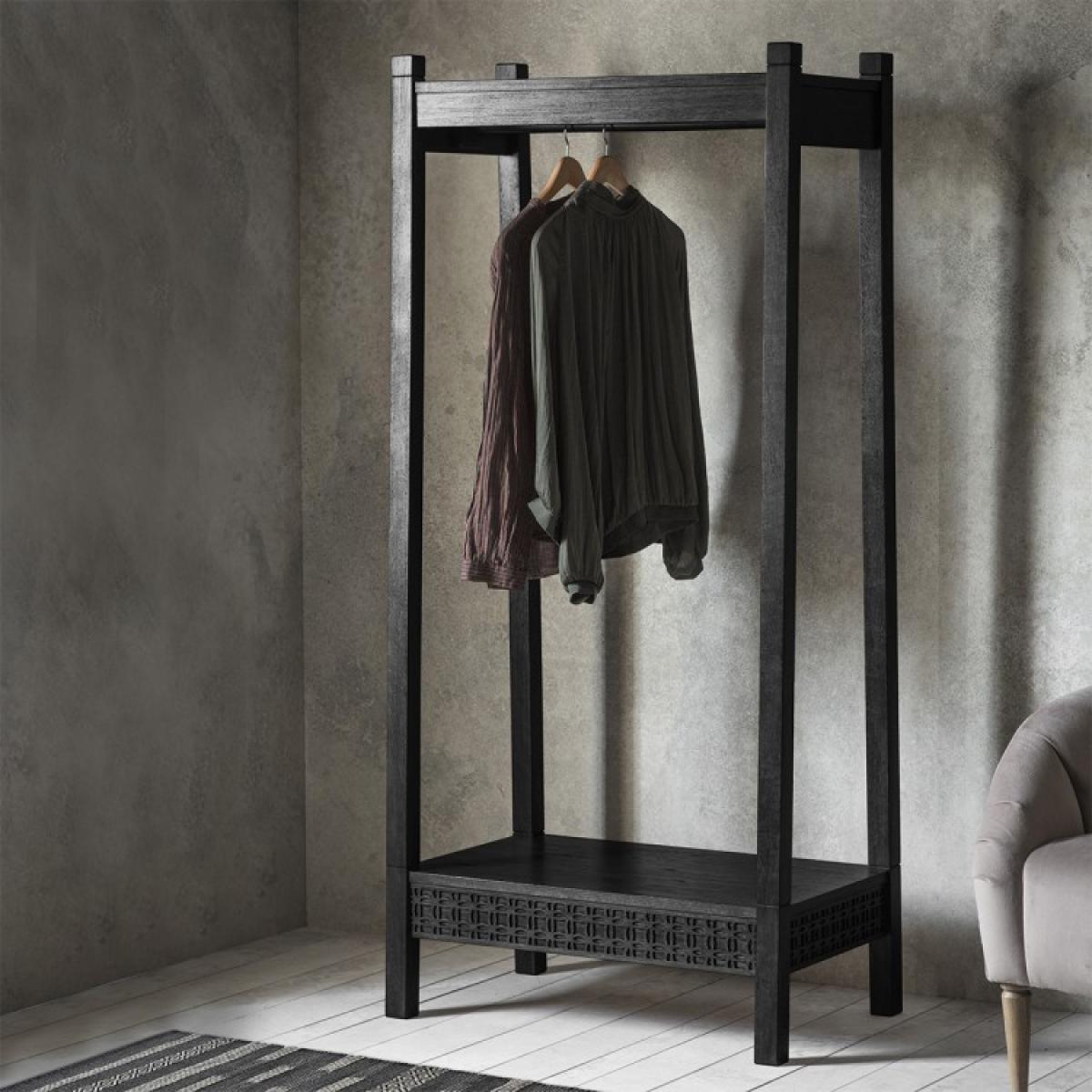 The Khaleesi Open Wardrobe is made using Mango solids with mixed timber veneers of Teak-Mahogany-Mindy Ash and Mango which give contrast and make the inlaid pattern stand out. It has a stunning matt black charcoal finish – the different grains in the mixed timbers stand out in the light and catch your eye with this beautiful detail. The wardrobe features a patterned frieze of blind fret work around the bottom shelf, made from solid mango wood. It has a hanging rail and a shelf across the bottom.