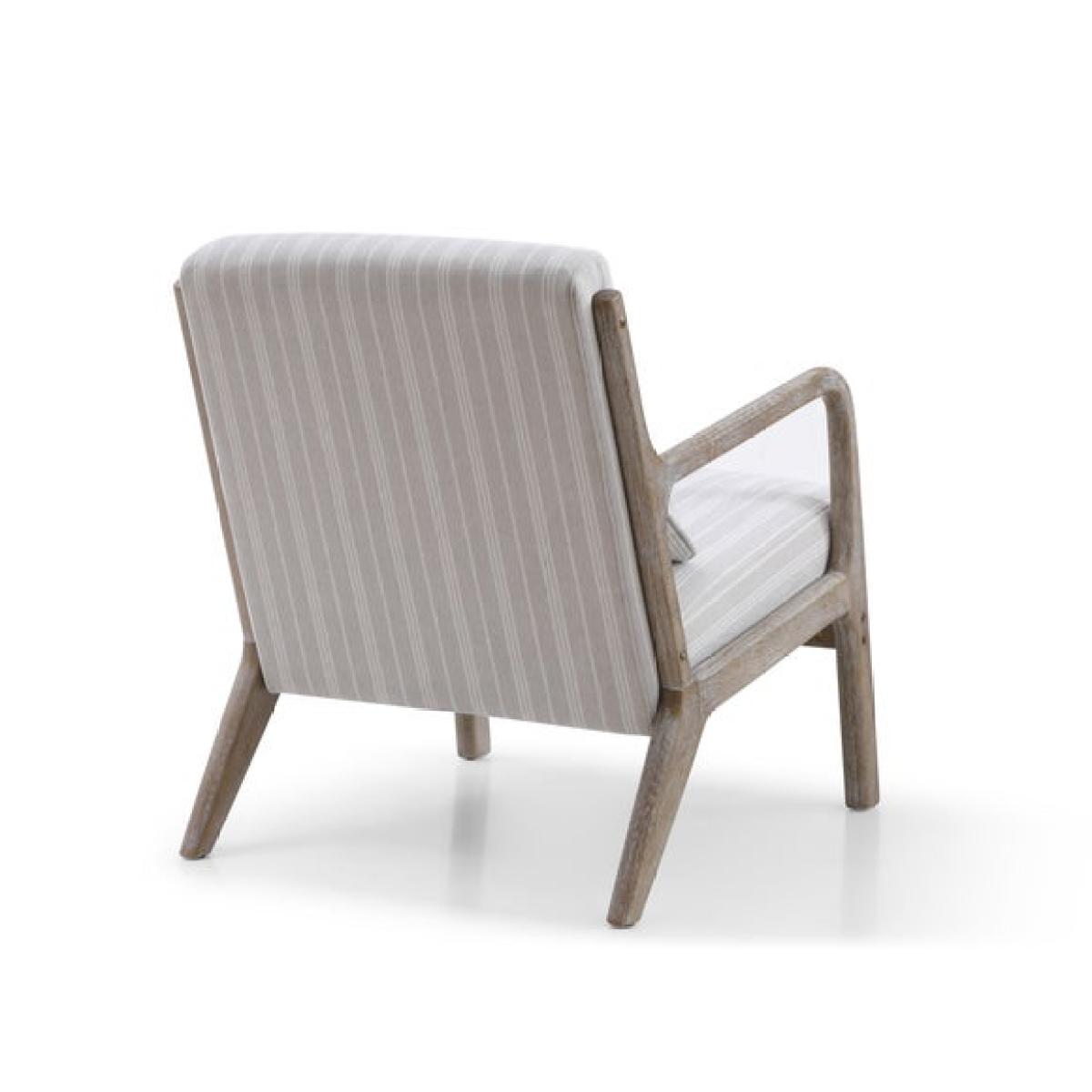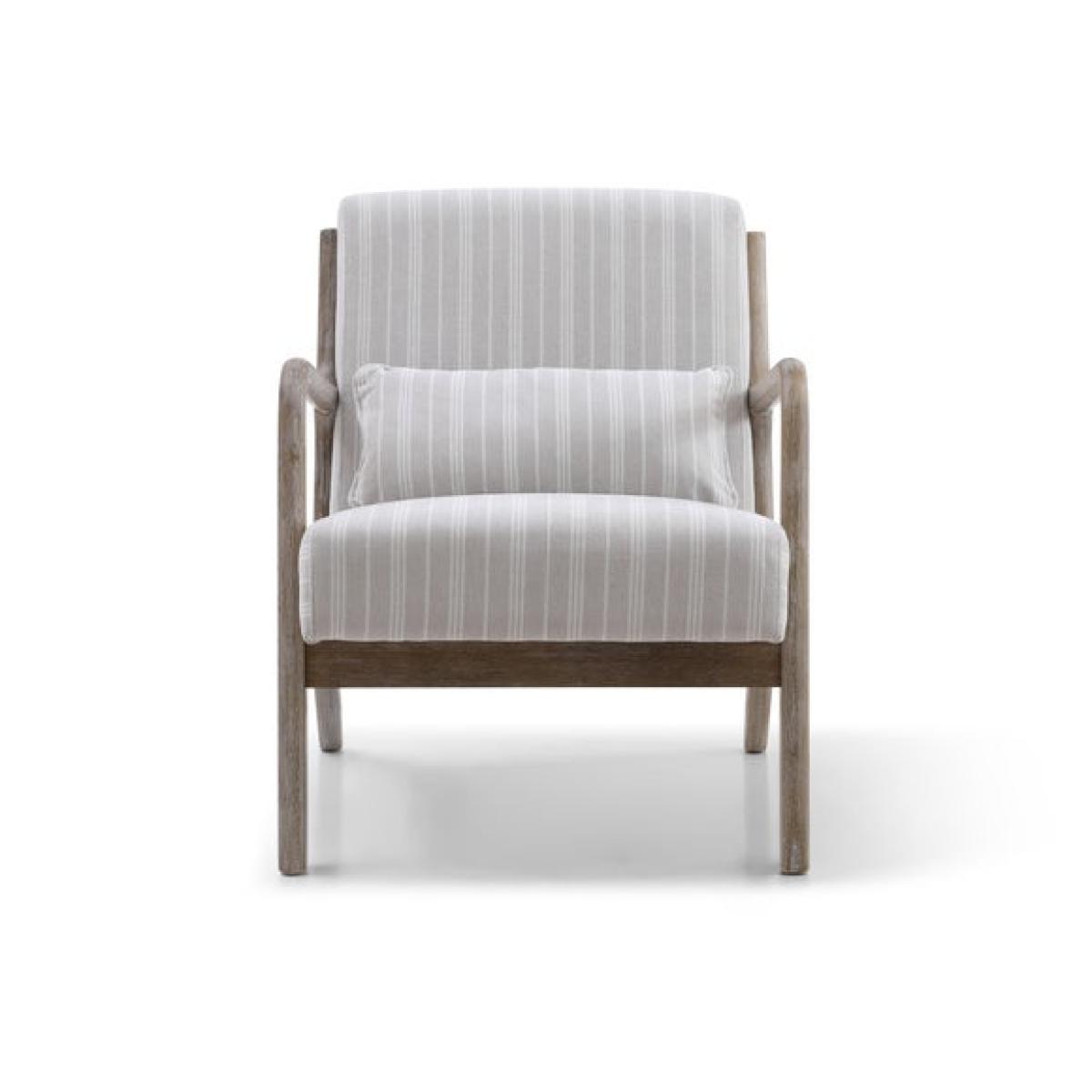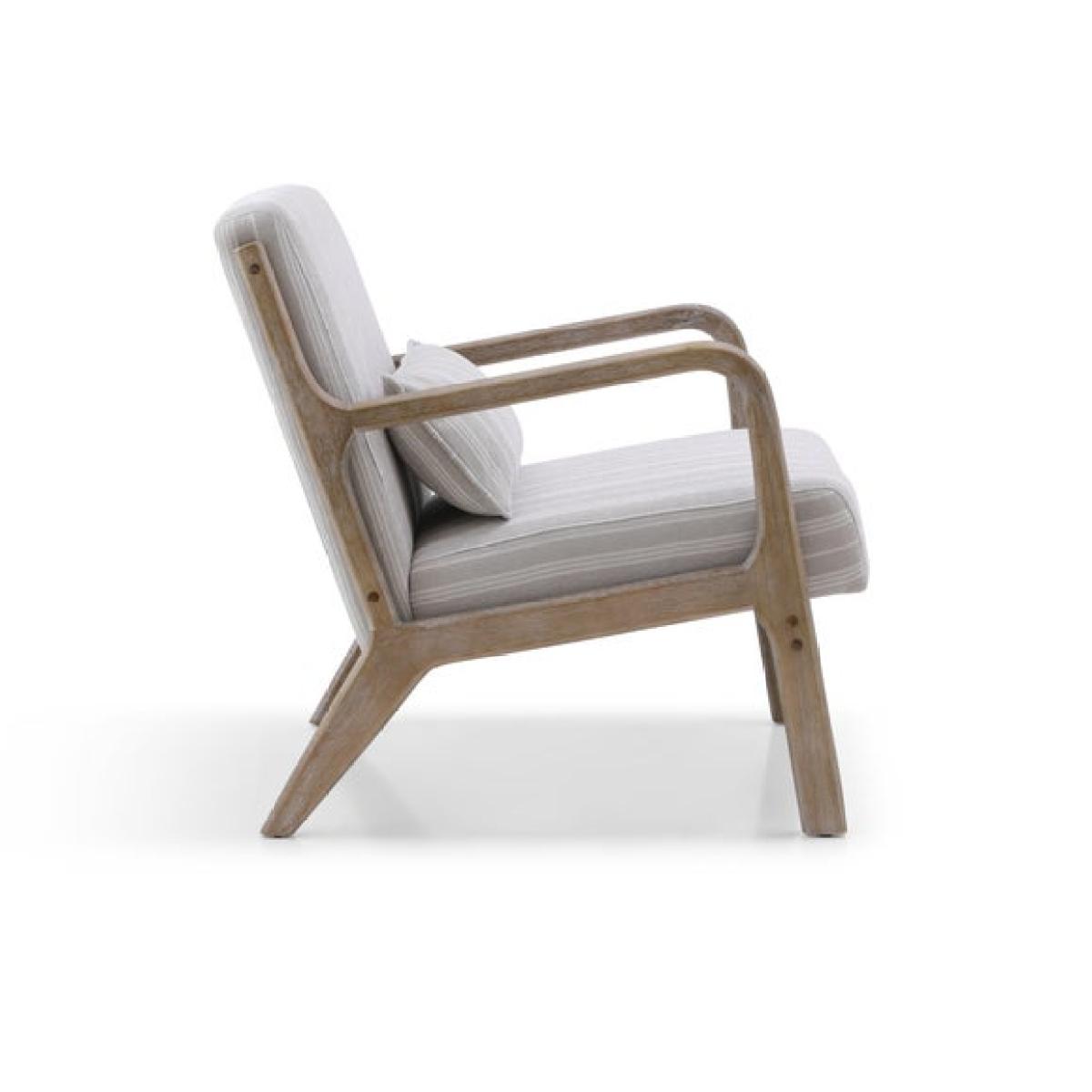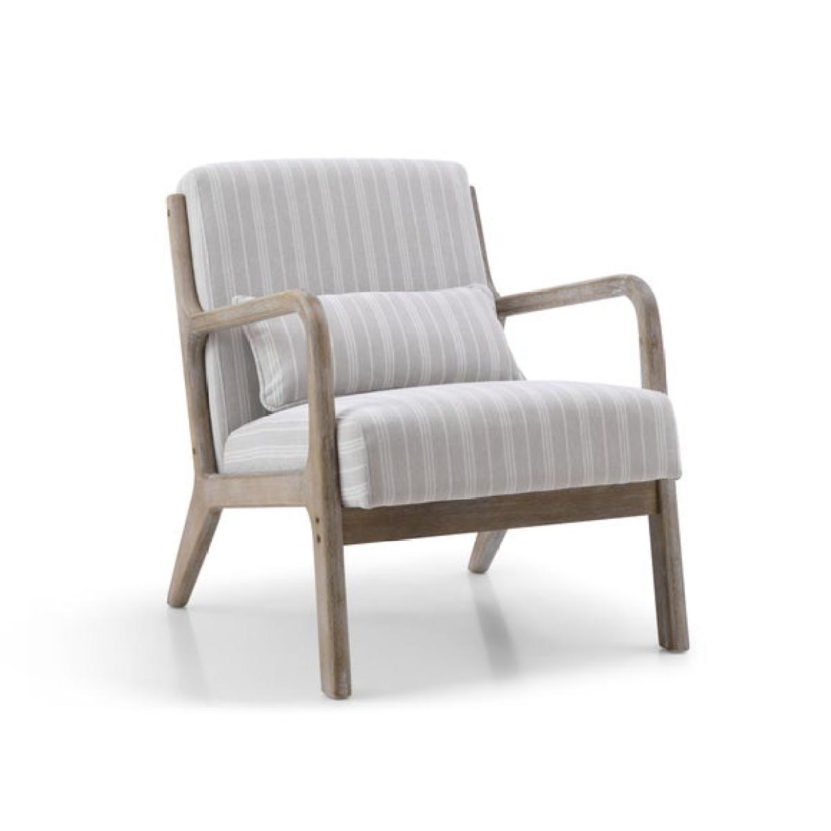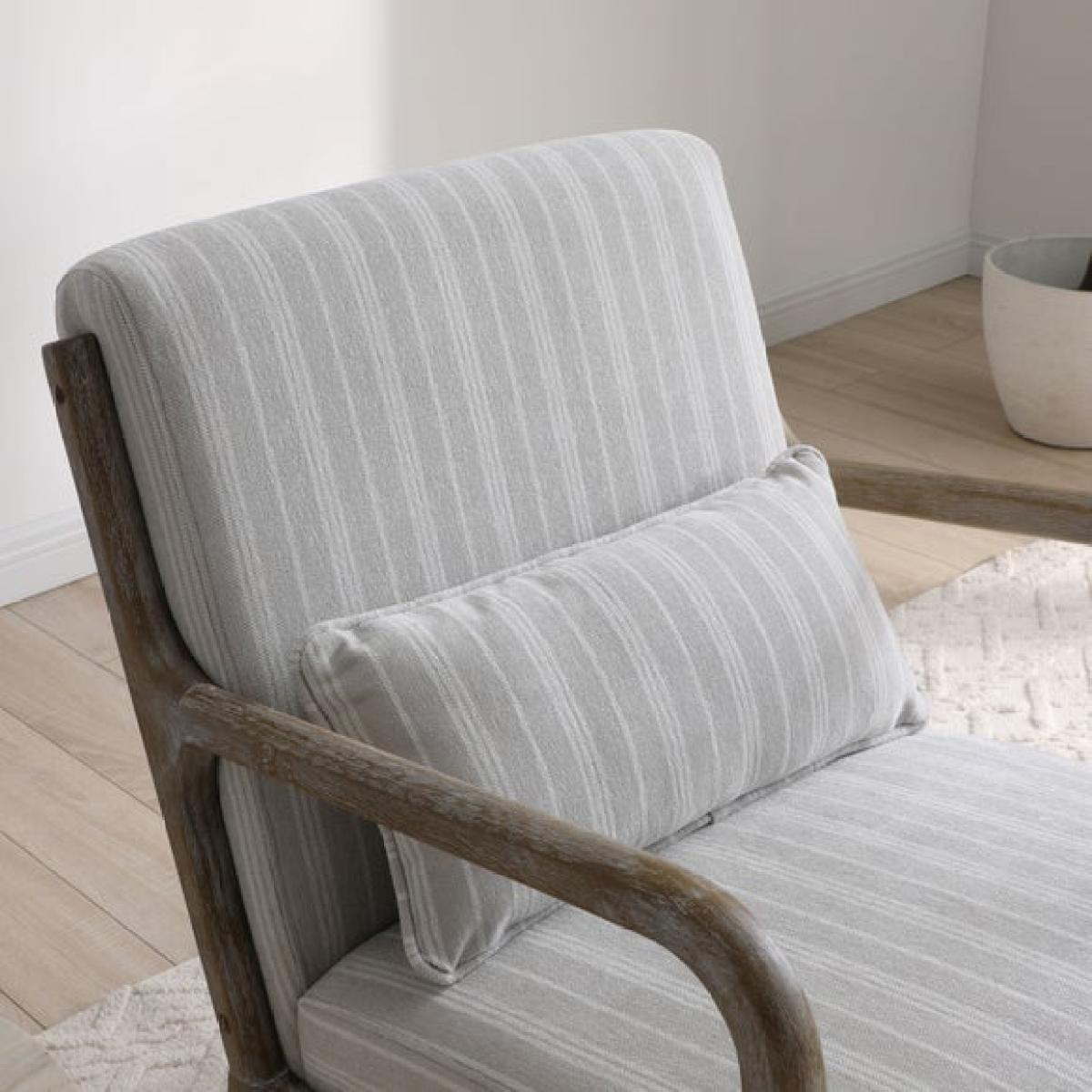* Modern chair * Wooden frame * Soft seat upholstery This chair is a fresh take on a customer favourite, now with a lighter washed wood frame that enhances its relaxed, coastal-inspired feel. The soft chenille stripe upholstery adds a subtle pattern and a tactile finish, while the matching bolster cushion provides extra support and a cohesive look. Its low-slung profile and gently reclined back make it a comfortable choice for laid-back lounging, while the clean lines and natural tones ensure it fits seamlessly into a variety of interior styles—from modern rustic to minimalist.