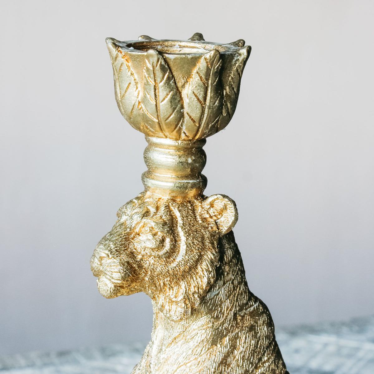 I love the Khan Tiger gold candlestick for adding a touch of opulence and a statement piece to both modern and classic interiors. Its unique, sculptural shape makes it a great focal point on a console table or mantel, especially when paired with minimalist décor to let it stand out. It works well in eclectic or luxurious schemes, particularly when combined with rich textures or metallic accents. Practical styling tips include stacking it alongside other smaller candlesticks or decorative objects for visual interest, and using it as a centrepiece during dinner parties for a touch of elegance. Just ensure the candle fits securely and avoid placing it near flammable materials for safety.