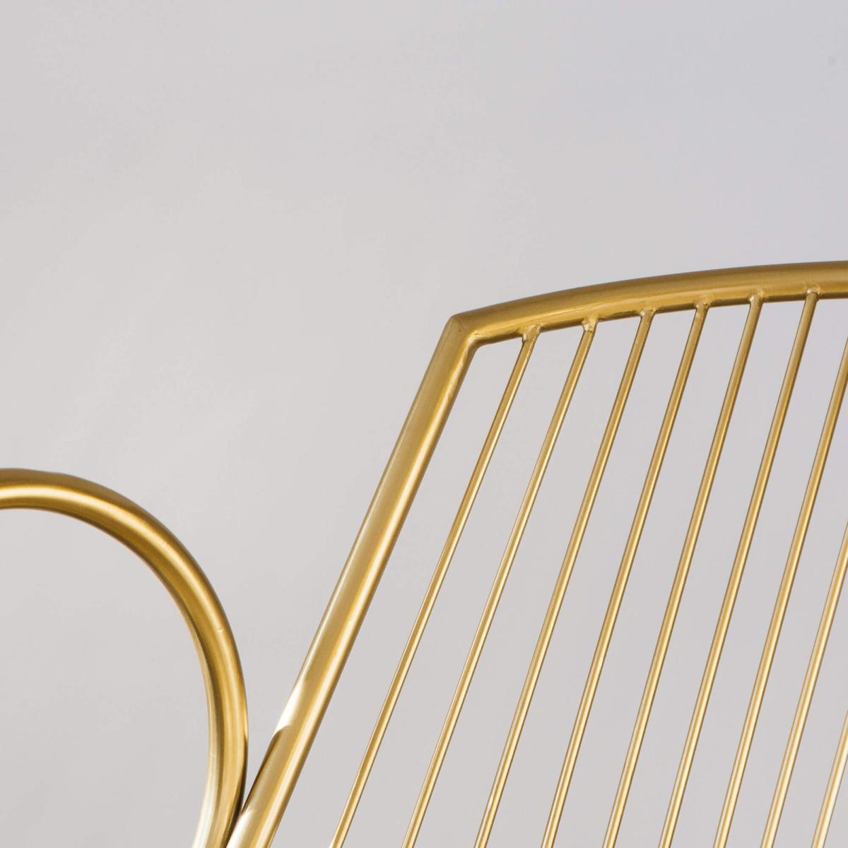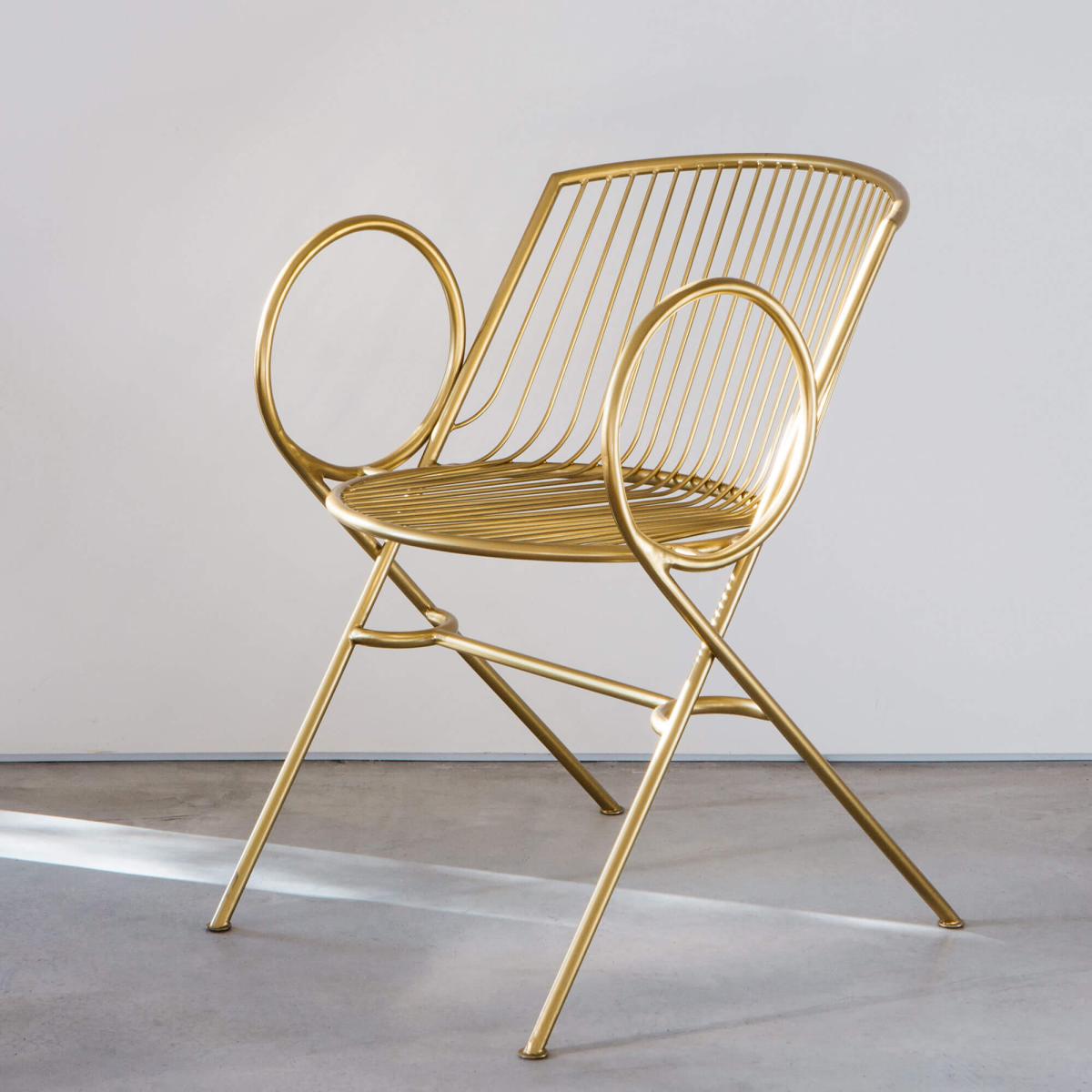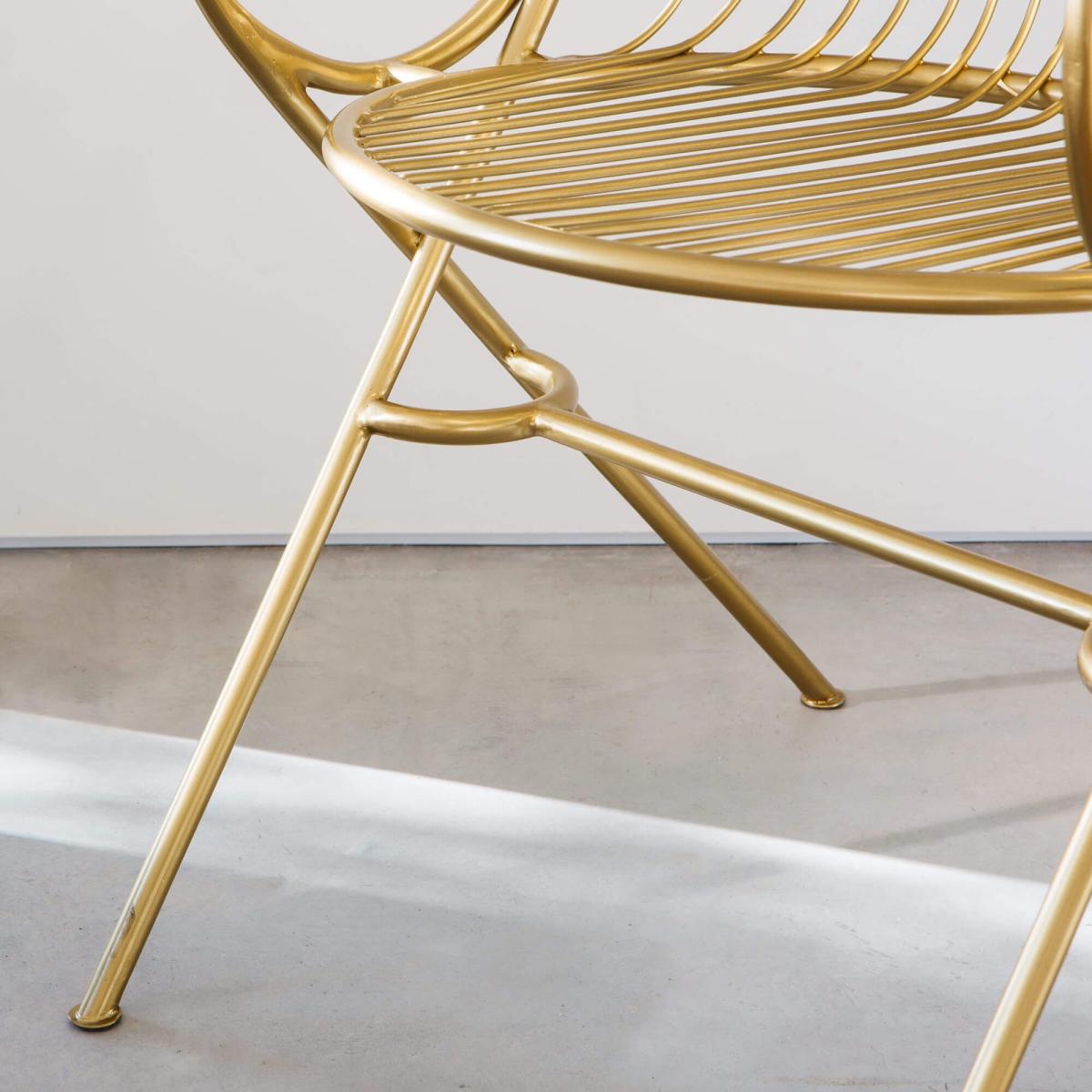 A glamorous twist on midcentury styling, this gold chair features a simple yet striking silhouette with looped arms. Create texture by adding cosy sheepskins to this piece.