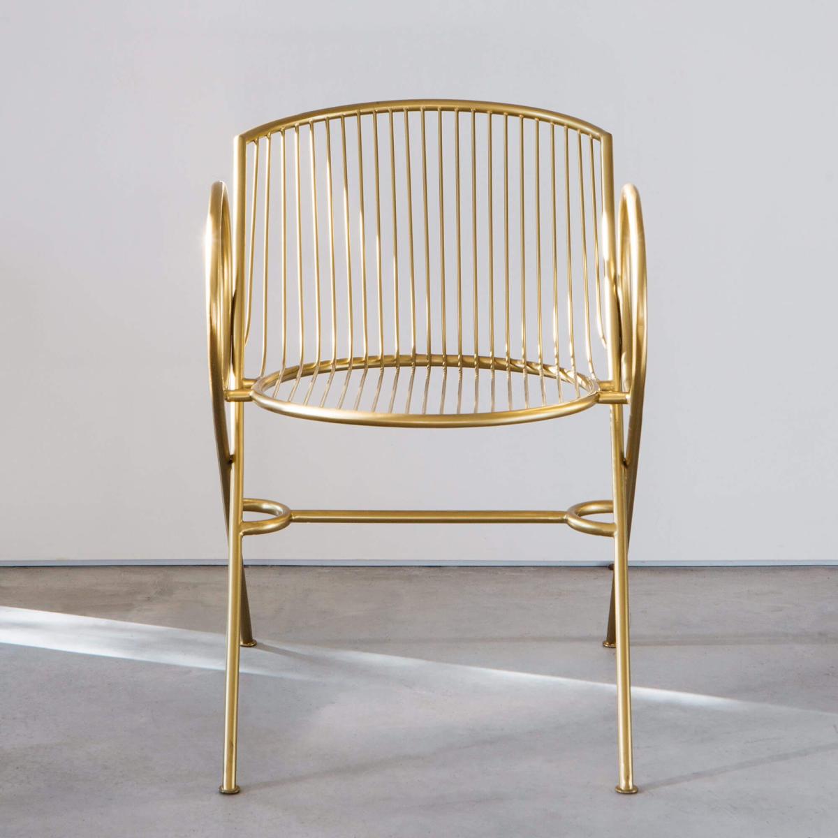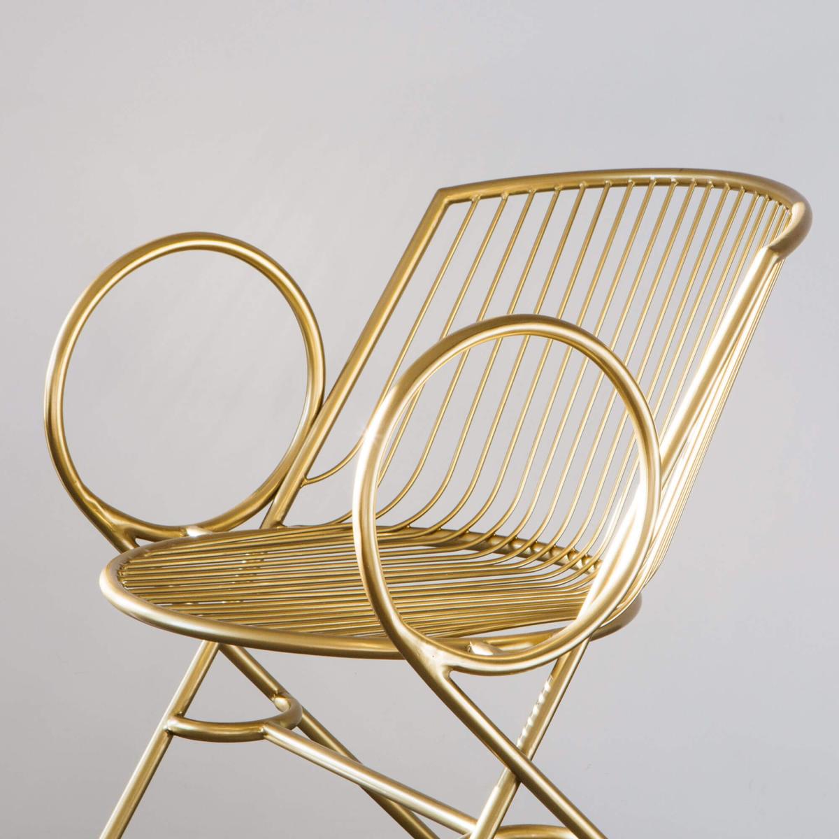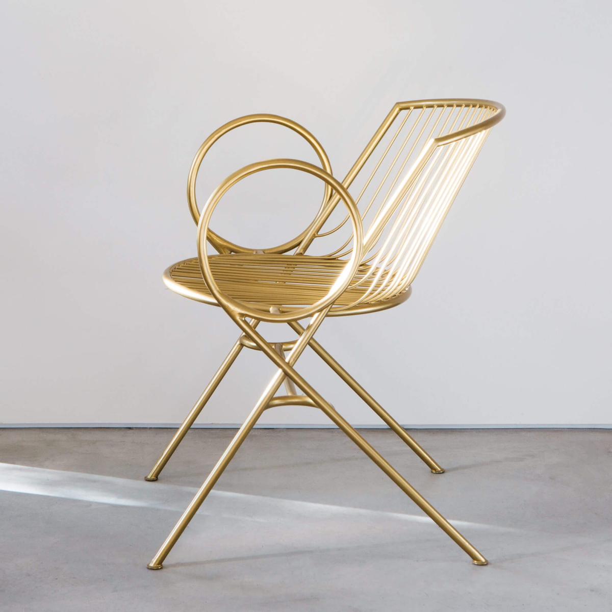 A glamorous twist on midcentury styling, this gold chair features a simple yet striking silhouette with looped arms. Create texture by adding cosy sheepskins to this piece.