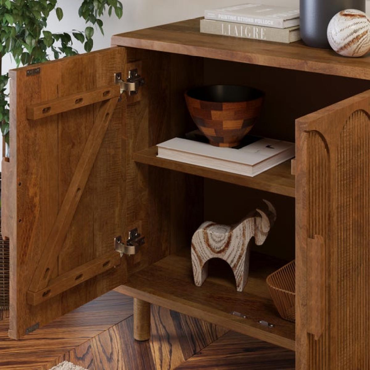 * Mango wood construction * 2 cupboards with adjustable shelf * Slatted fronts * Retro-inspired look * Perfect for extra storage space If you ever find yourself with extra guests around the house, this sideboard is the perfect solution to your problem. With two cupboards and adjustable shelves, there's plenty of room for plates, glasses, cups, and snacks. And its retro-inspired look makes it a great choice for any modern home.