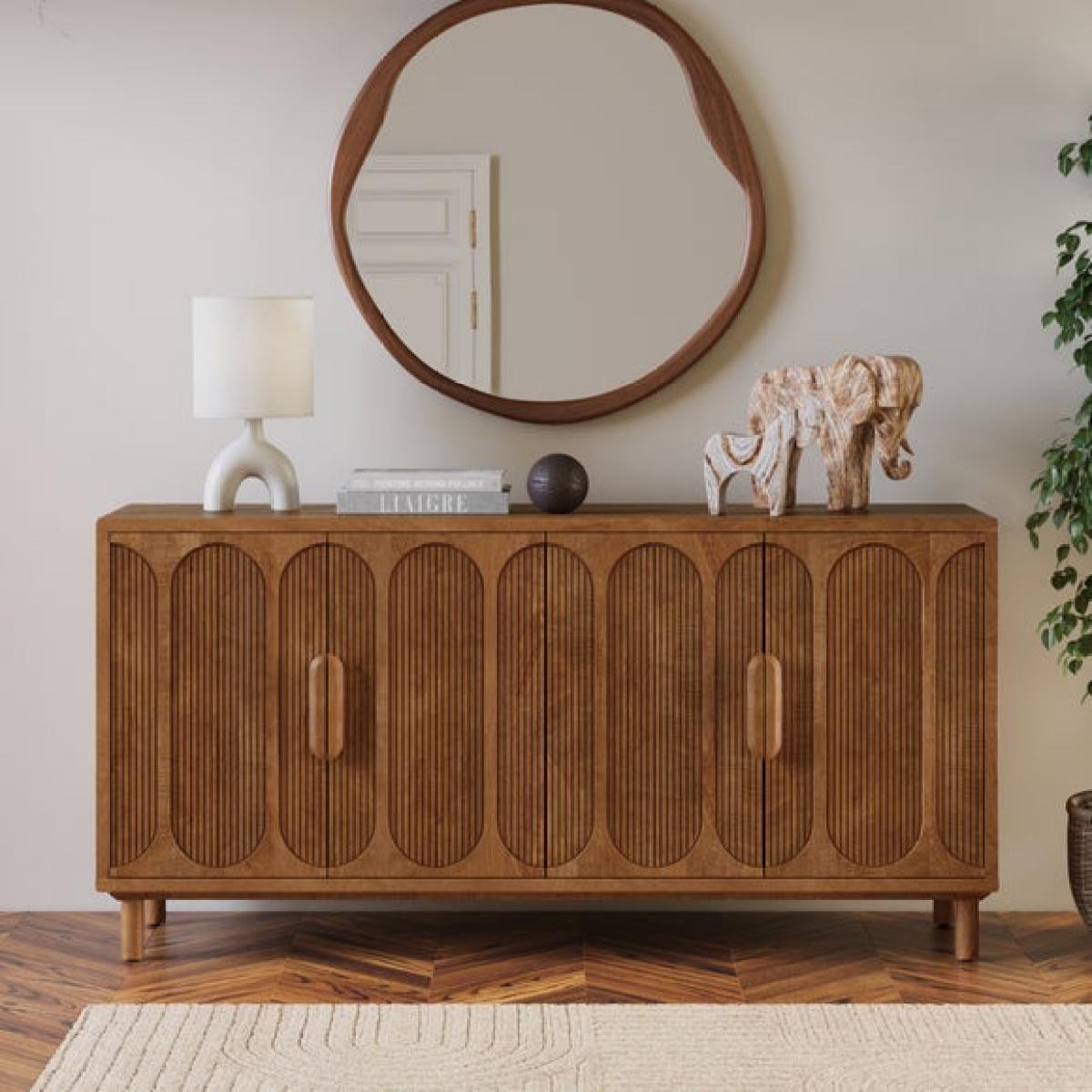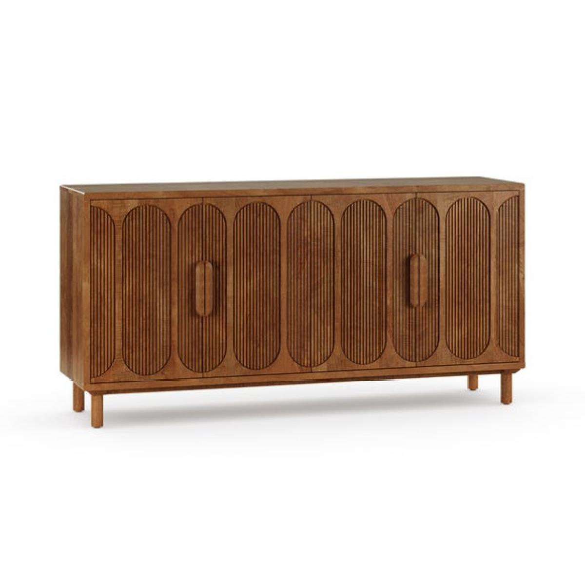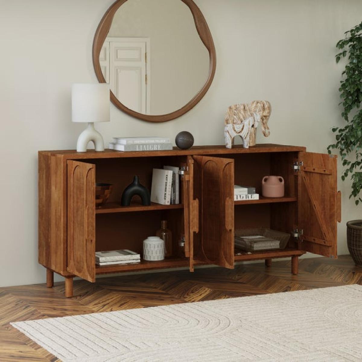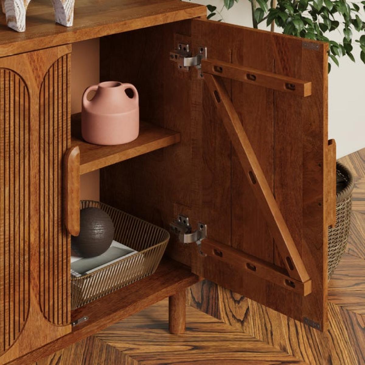 * Mango wood construction * 2 cupboards with adjustable shelf * Slatted fronts * Retro-inspired look * Perfect for extra storage space If you ever find yourself with extra guests around the house, this sideboard is the perfect solution to your problem. With two cupboards and adjustable shelves, there's plenty of room for plates, glasses, cups, and snacks. And its retro-inspired look makes it a great choice for any modern home.